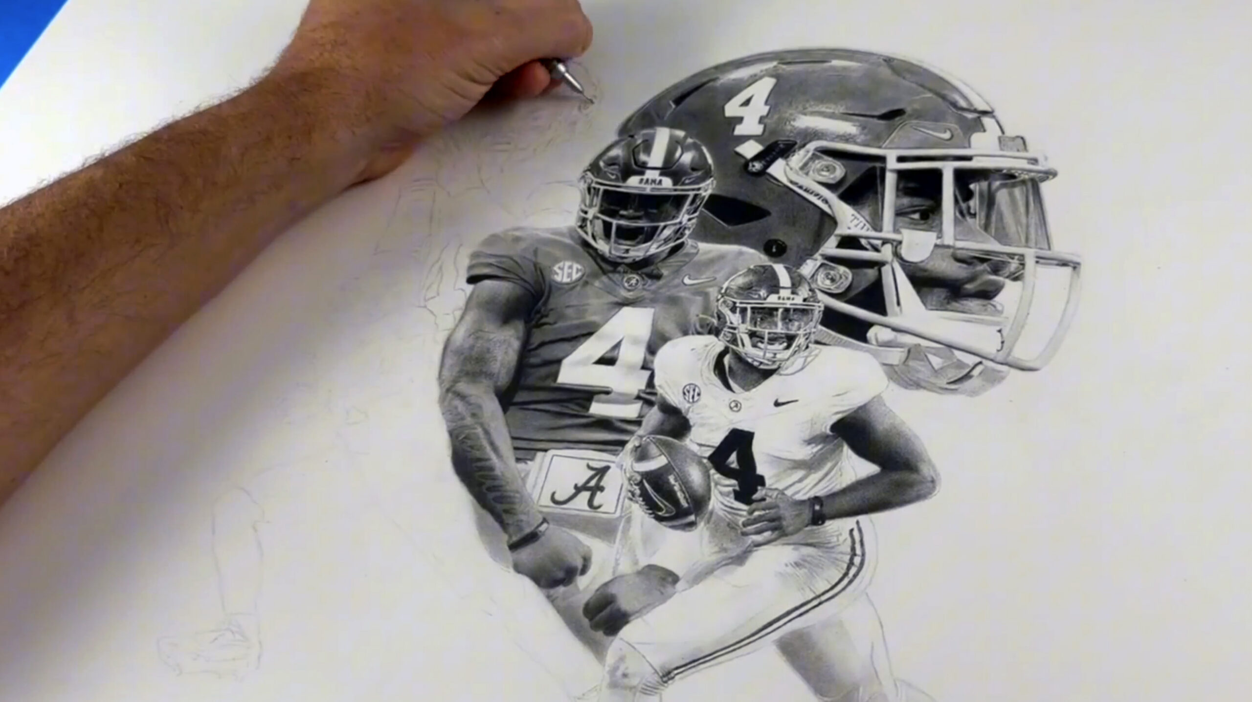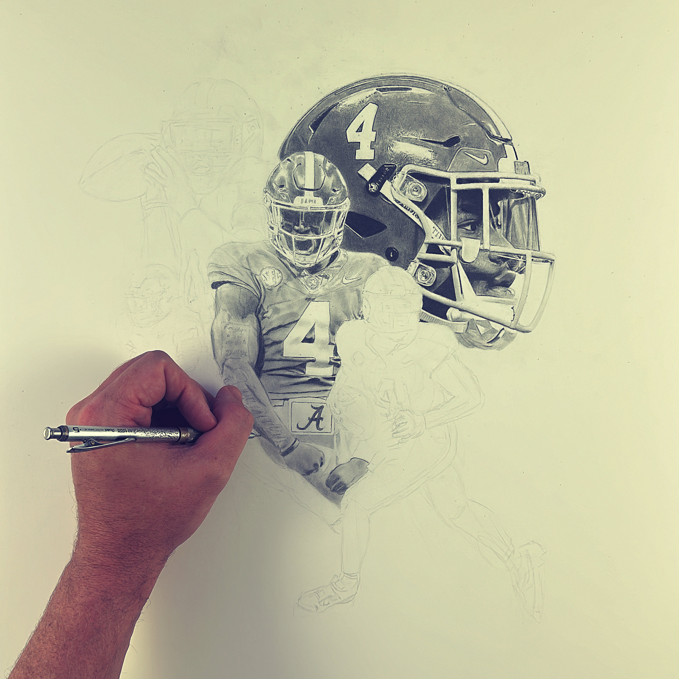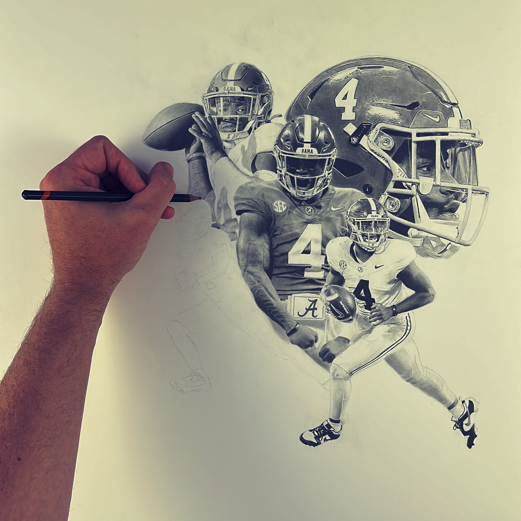 This original hyper-realistic pencil drawing by Keegan Hall masterfully captures five moments from Alabama Football star Jalen Milroe’s career. Each segment of the drawing presents a unique snapshot of Jalen’s journey, bringing to life the raw emotions of his football experience. From the focused determination in his early moments on the field, to the unbridled joy of a game-winning hit, to the intensity of a high-stakes play, Keegan’s exquisite attention to detail and shading makes every scene feel incredibly lifelike. The composition offers fans a powerful glimpse into Jalen’s passion, grit, and love for the game, showcasing his evolution as one of football’s rising stars.