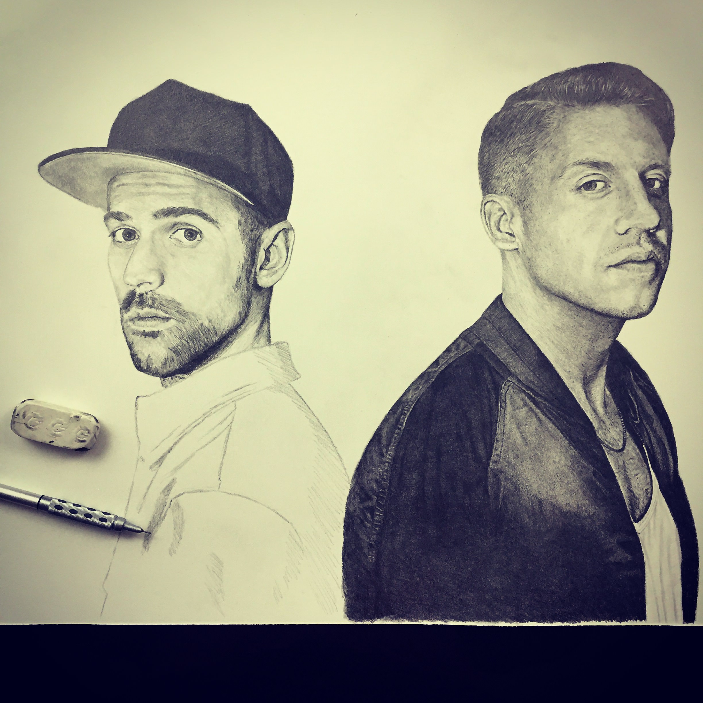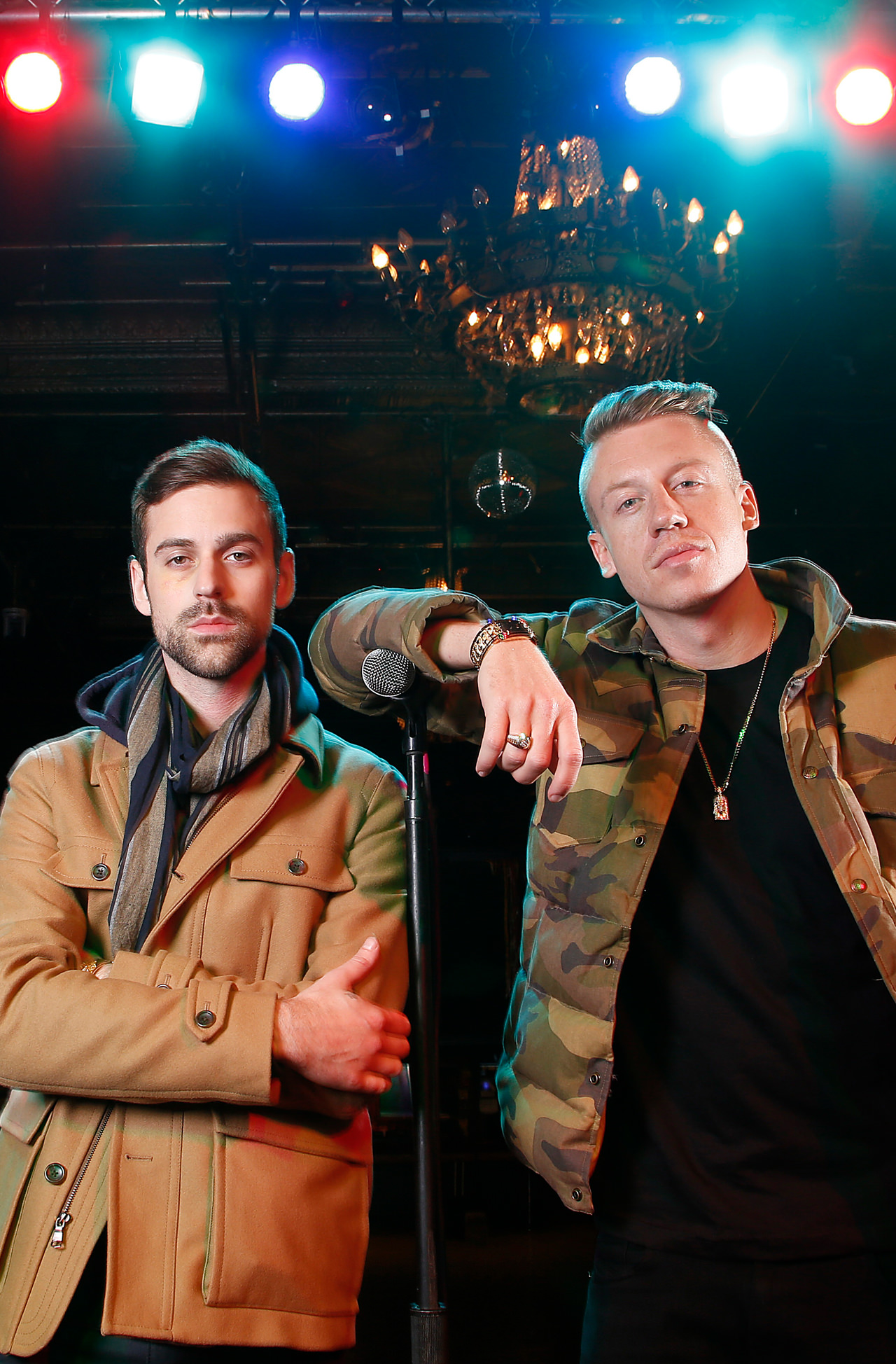Macklemore and Ryan Lewis, back-to-back, facing the viewer.