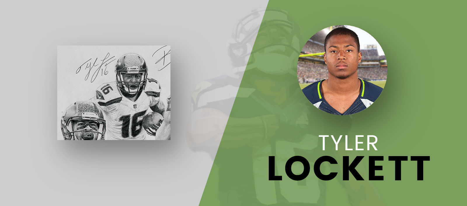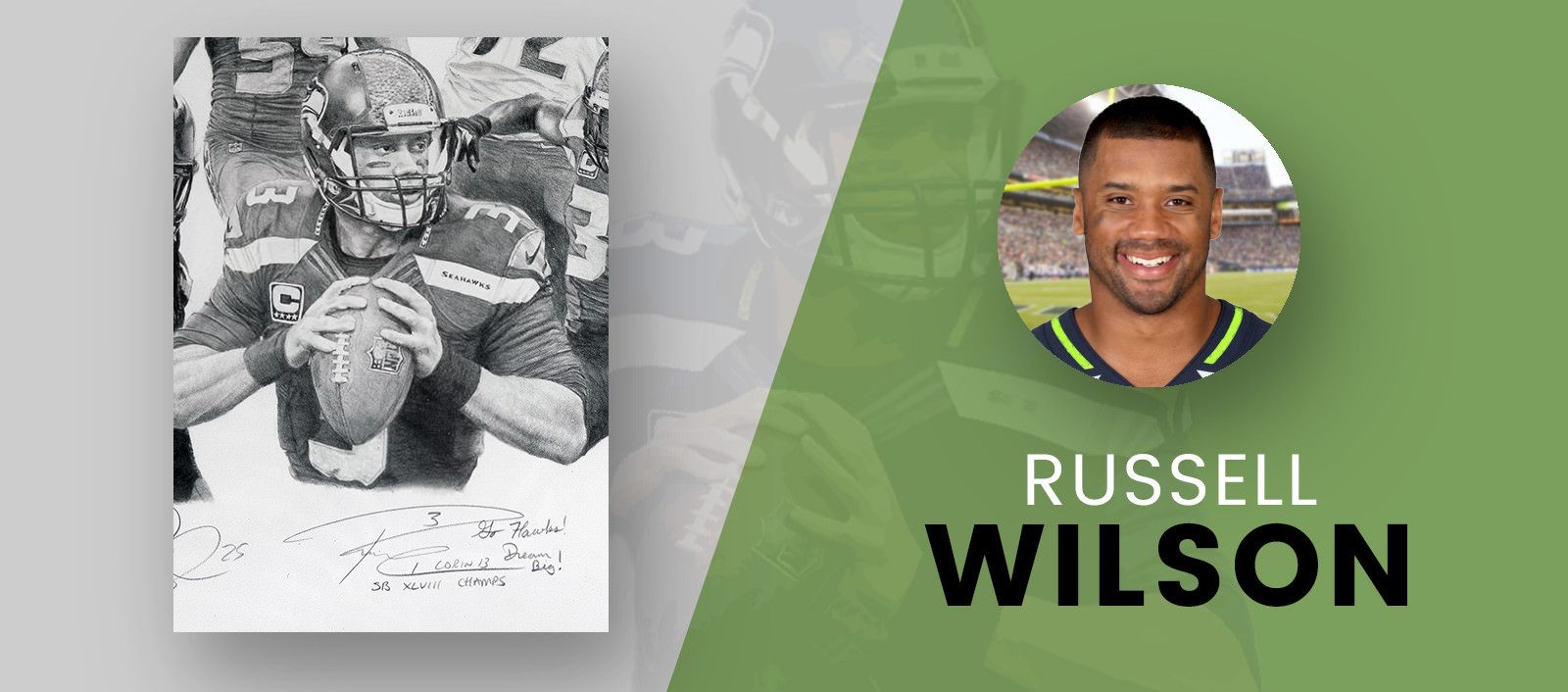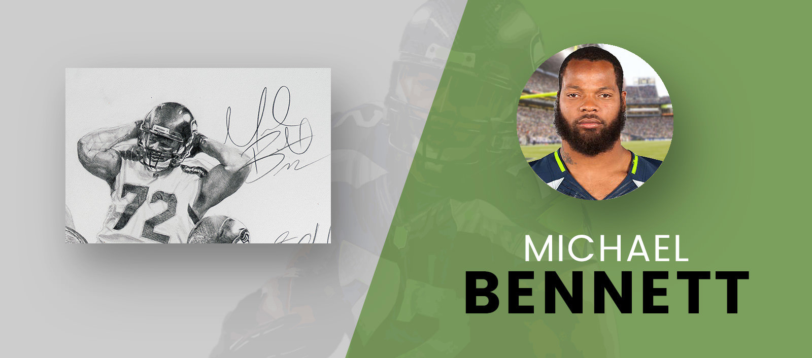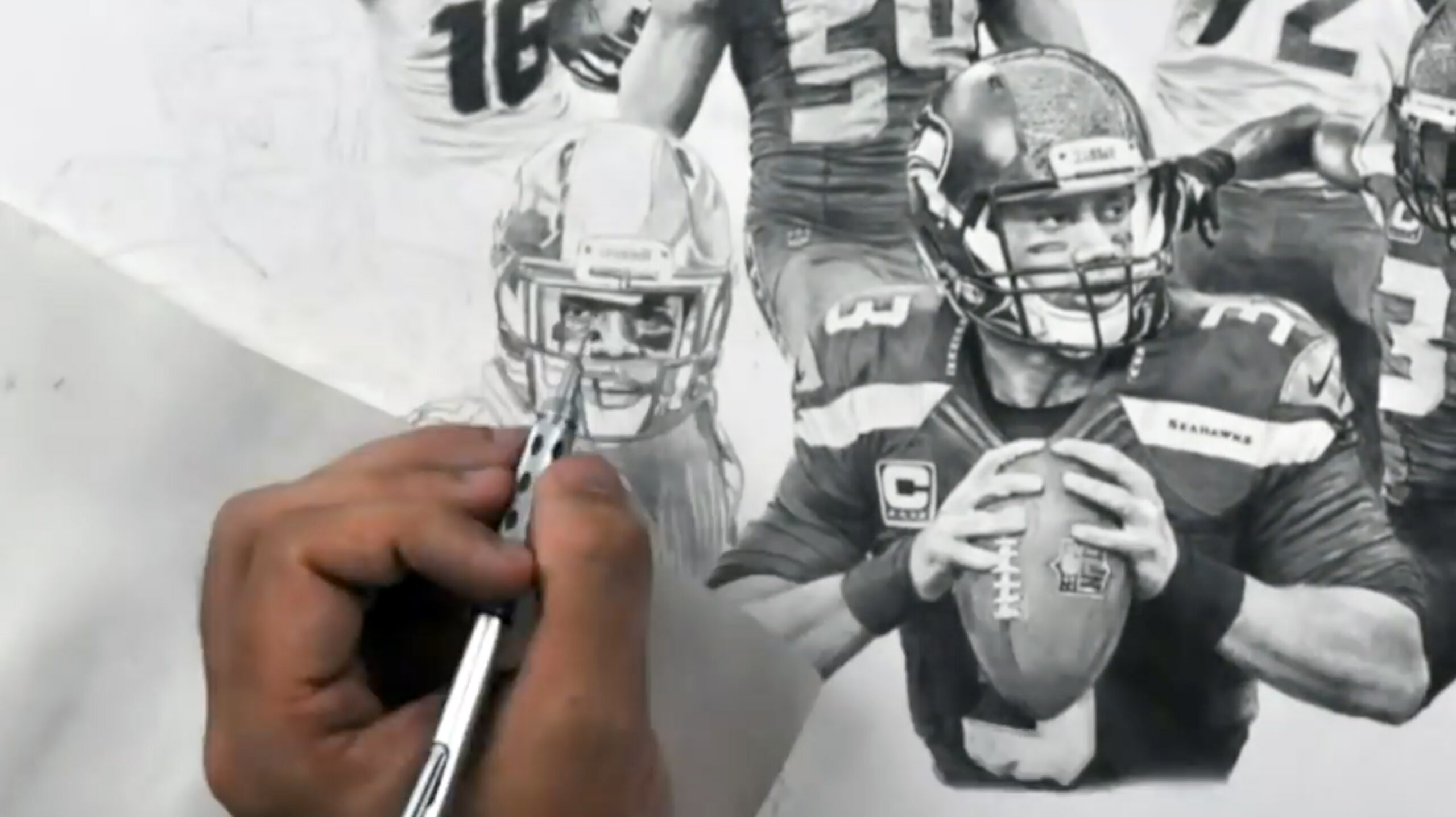 In the upper left side of the drawing, wide receiver Tyler Lockett running after a catch, while defensive end Michael Bennett performs his “sack dance”. Finally, linebacker Bobby Wagner is directly above Wilson and is rendered with a scream after a great play.