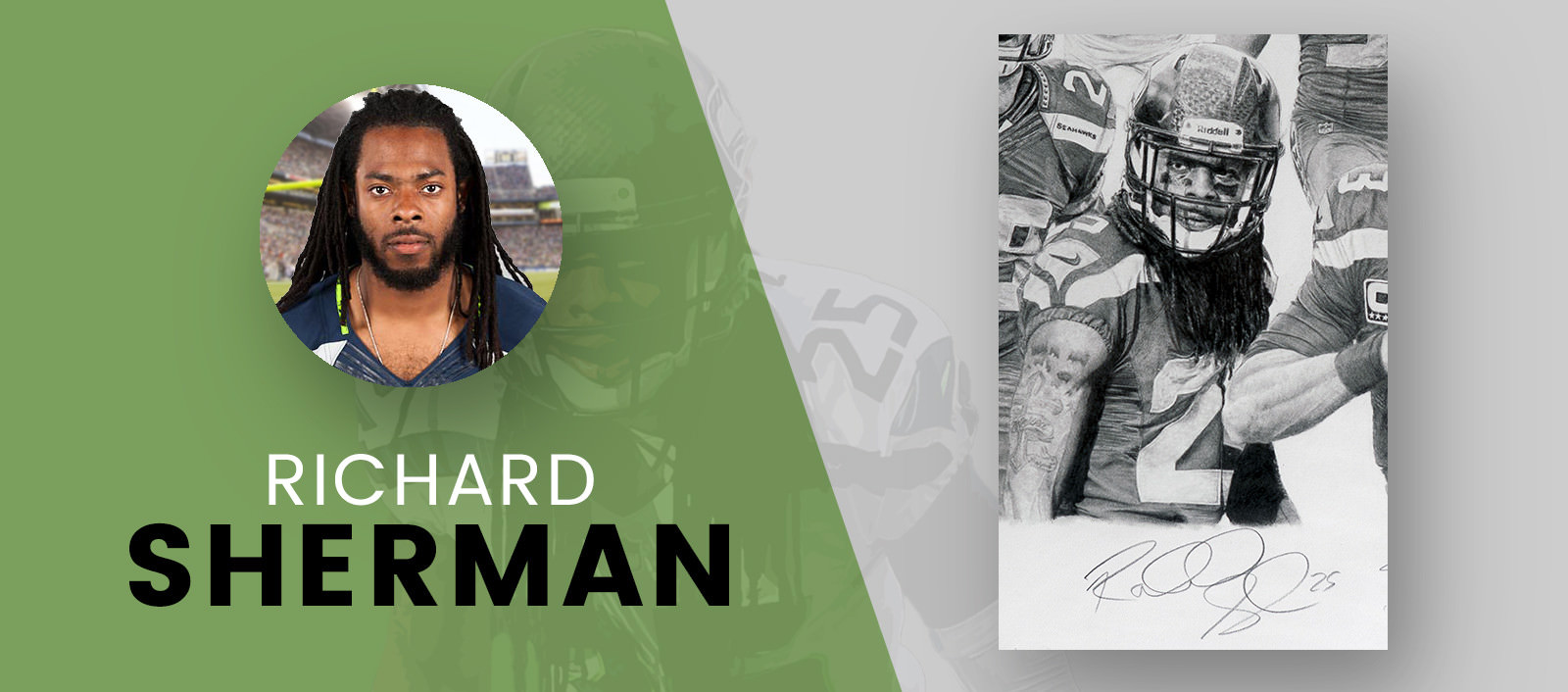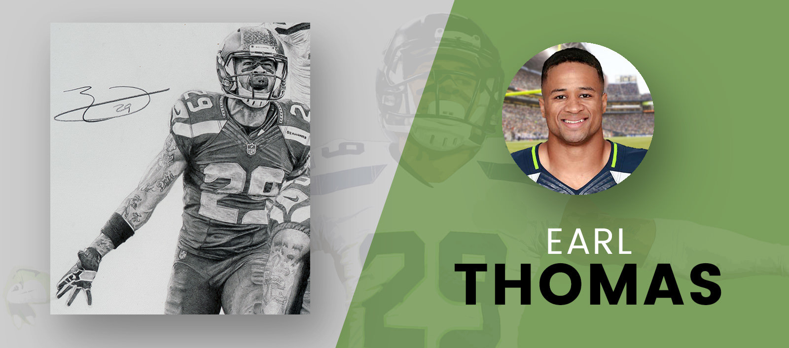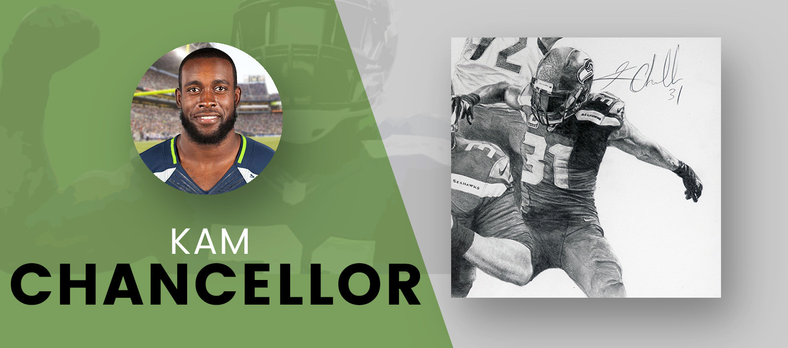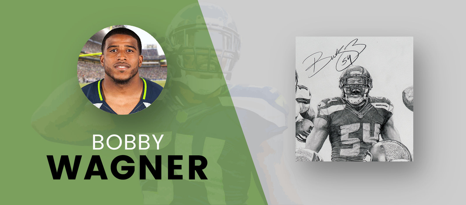 In the upper left side of the drawing, wide receiver Tyler Lockett running after a catch, while defensive end Michael Bennett performs his “sack dance”. Finally, linebacker Bobby Wagner is directly above Wilson and is rendered with a scream after a great play.
