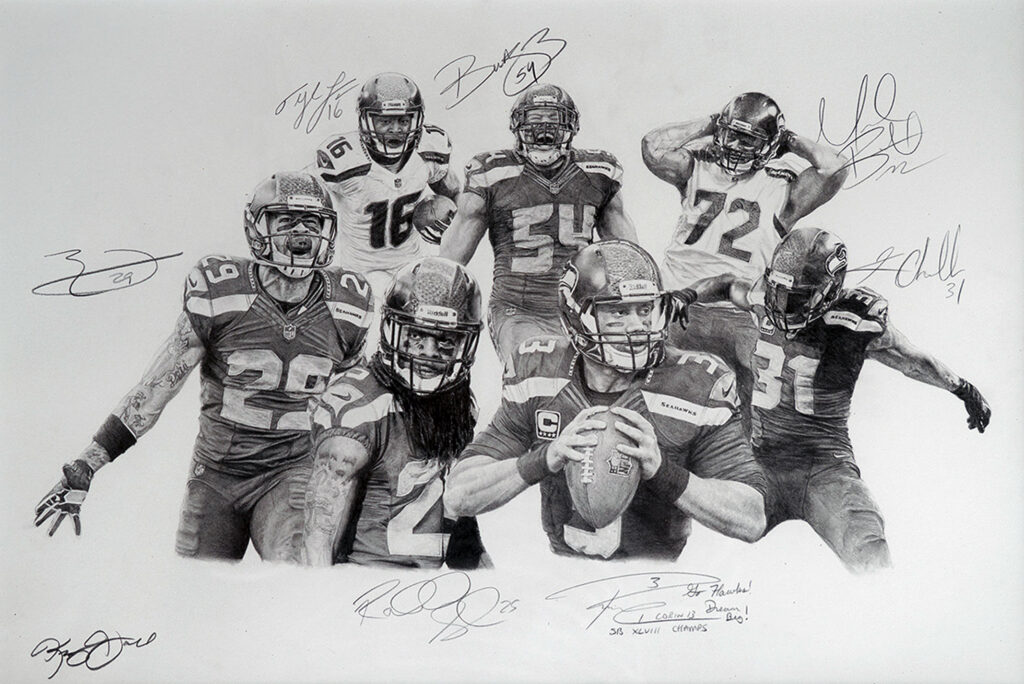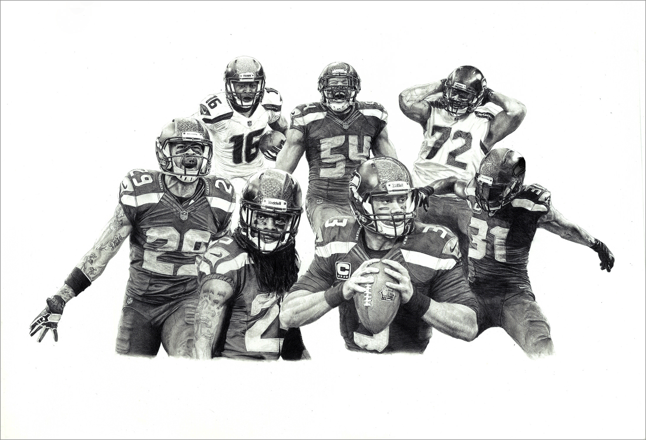 The drawing depicts seven Pro Bowl players from the Seattle Seahawks with each rendered in a signature pose. In the center of the drawing, quarterback Russell Wilson is preparing to throw a pass, with a serious expression on his face. To his right, cornerback Richard Sherman leans slightly forward, with his arms by his side. Strong safety Kam Chancellor stands behind Russell doing his famous jackhammer celebration, and free safety Earl Thomas stands behind Sherman, with his arms stretched out.
