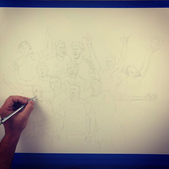 Working in graphite, the drawing was carefully constructed to balance each figure, giving every player their presence while maintaining a cohesive flow across the piece.