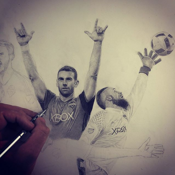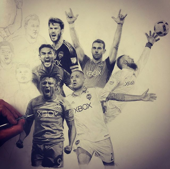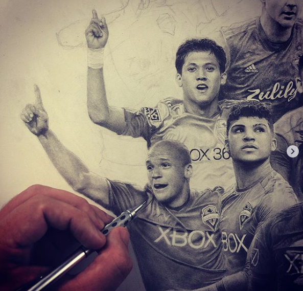 The drawing was a collaboration between Keegan and the Seattle Sounders organization, and is a stunning representation of the best 11 players in Seattle Sounders history, as voted by the fans. Each player is depicted in intricate detail, overlapping one another to create a dynamic composition.