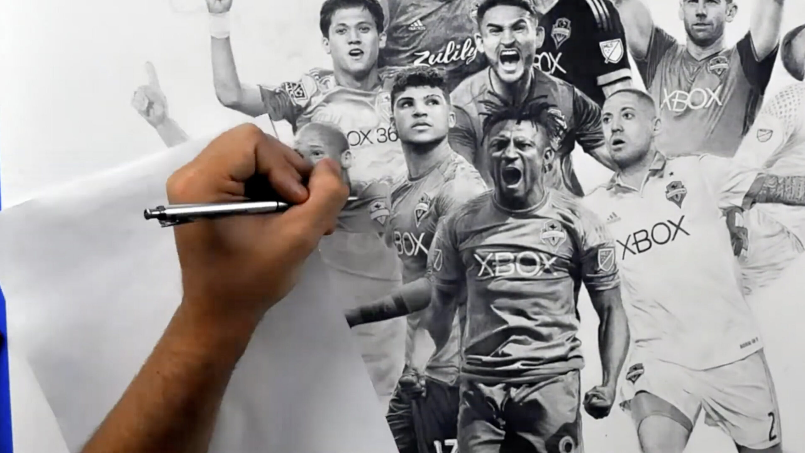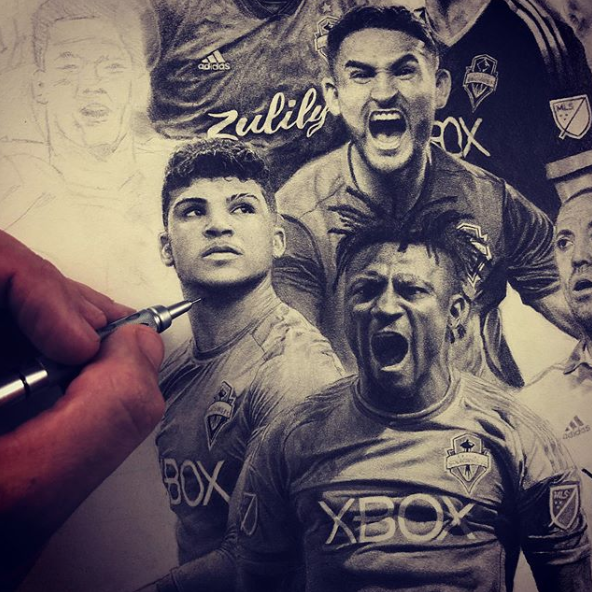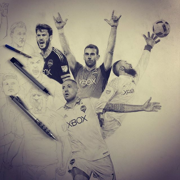 Overall, the drawing is a testament to the skill of both the artist and the players depicted, making it a must-see for any Seattle Sounders fan.