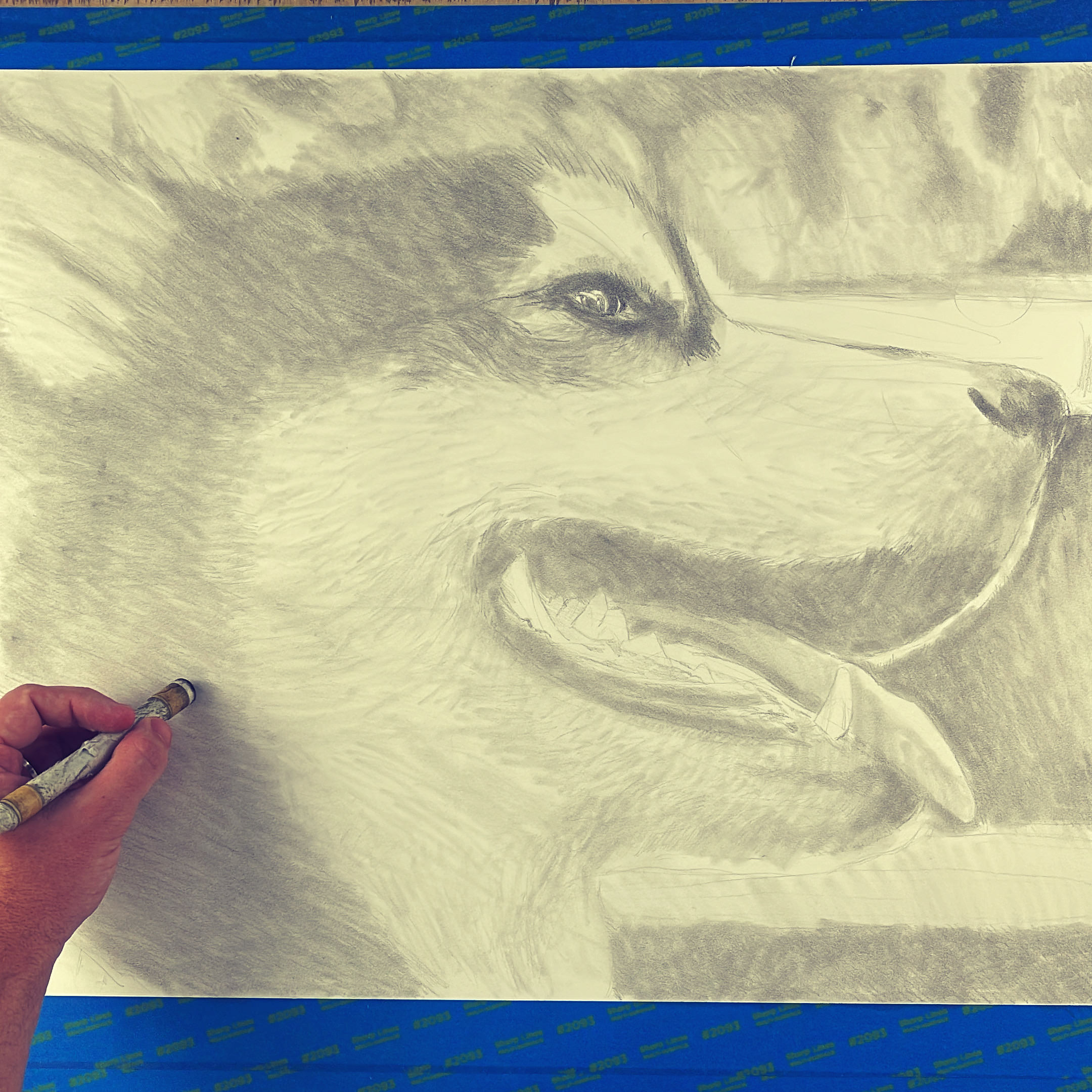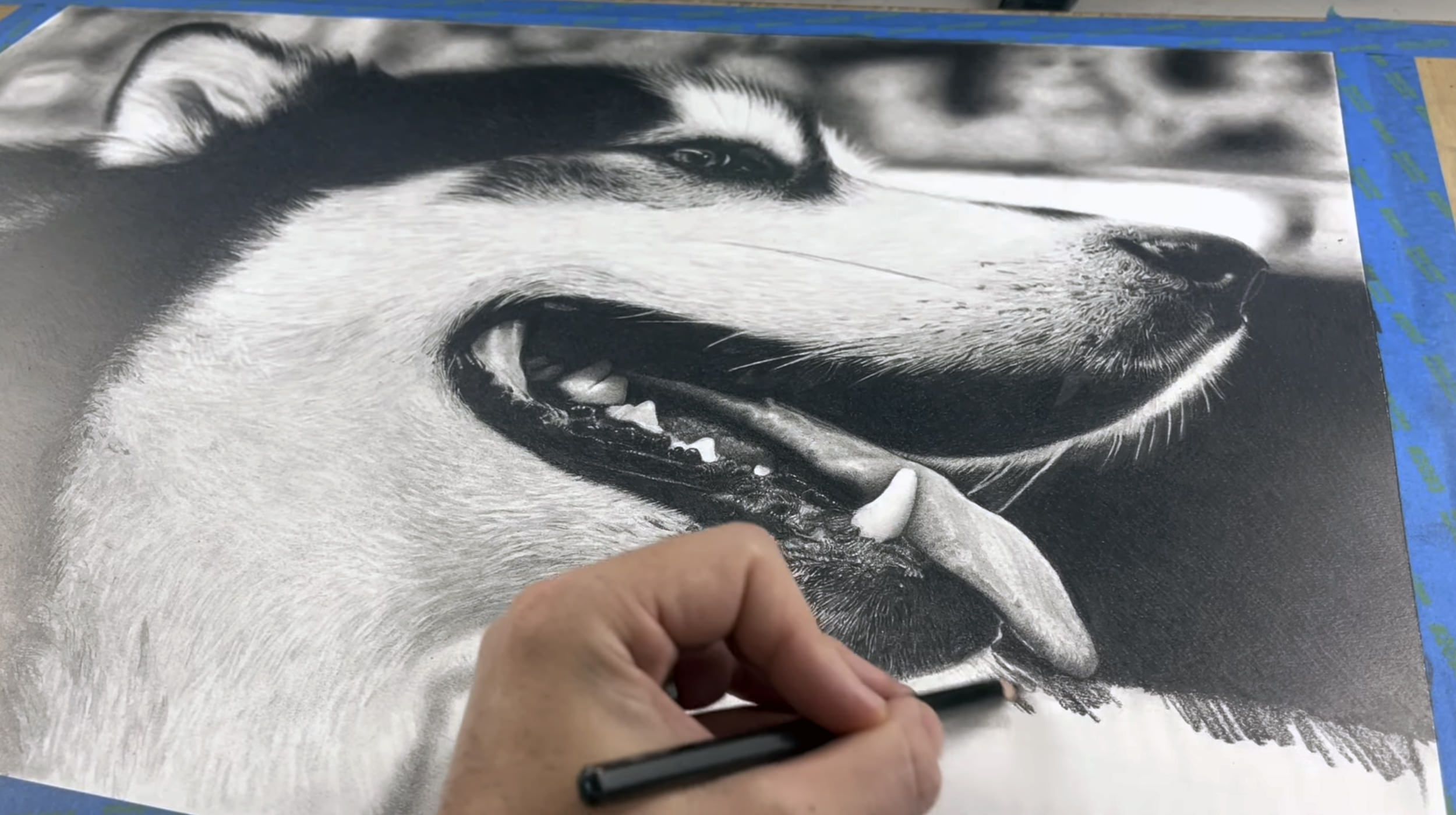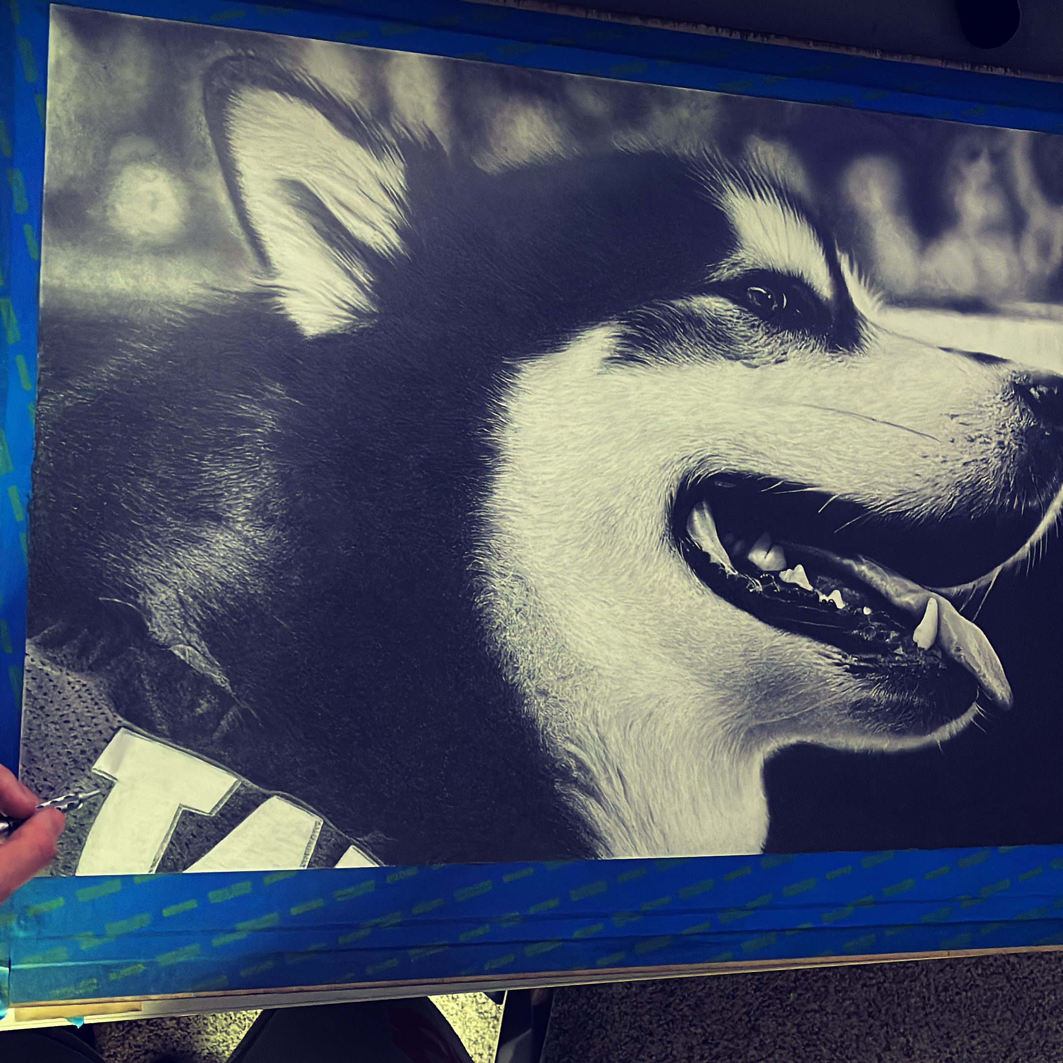 The pencil drawing by Keegan features “Dubs”, the beloved husky mascot for the University of Washington and was the centerpiece of a project at UW vs Stanford football game. The drawing is incredibly realistic, capturing the spirit and energy of the mascot with remarkable precision and detail.