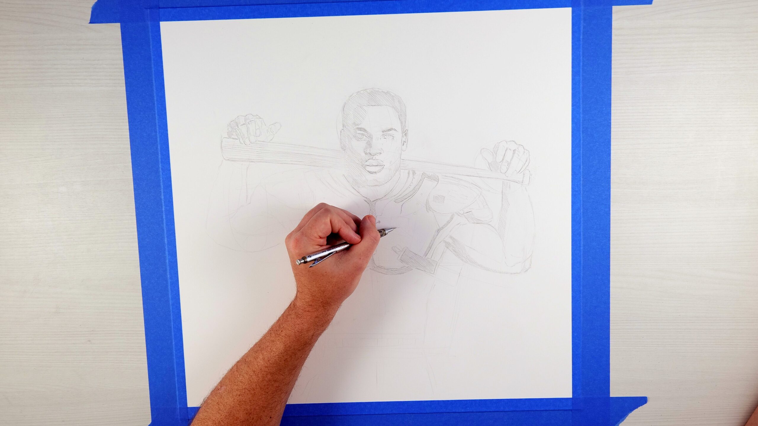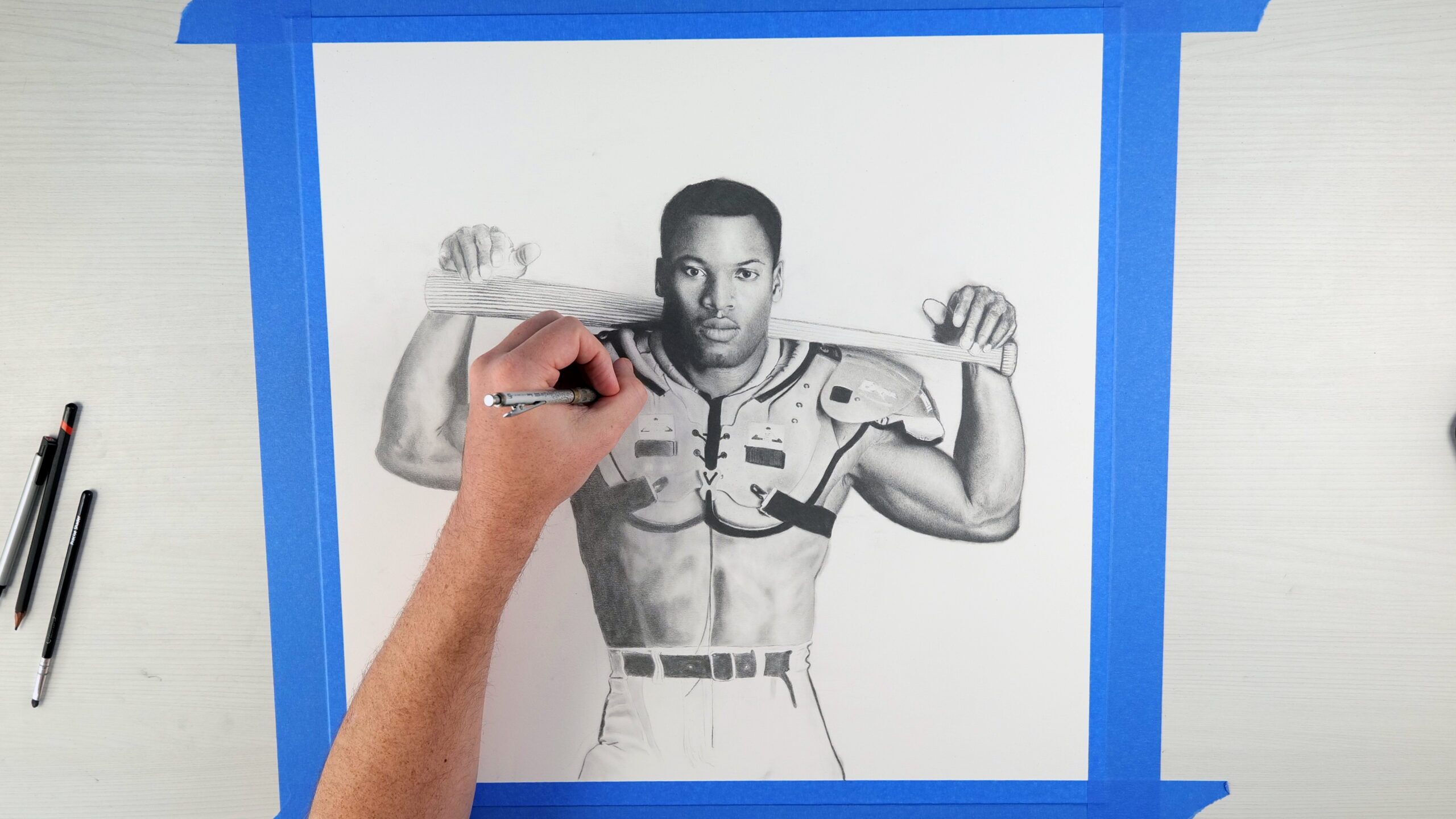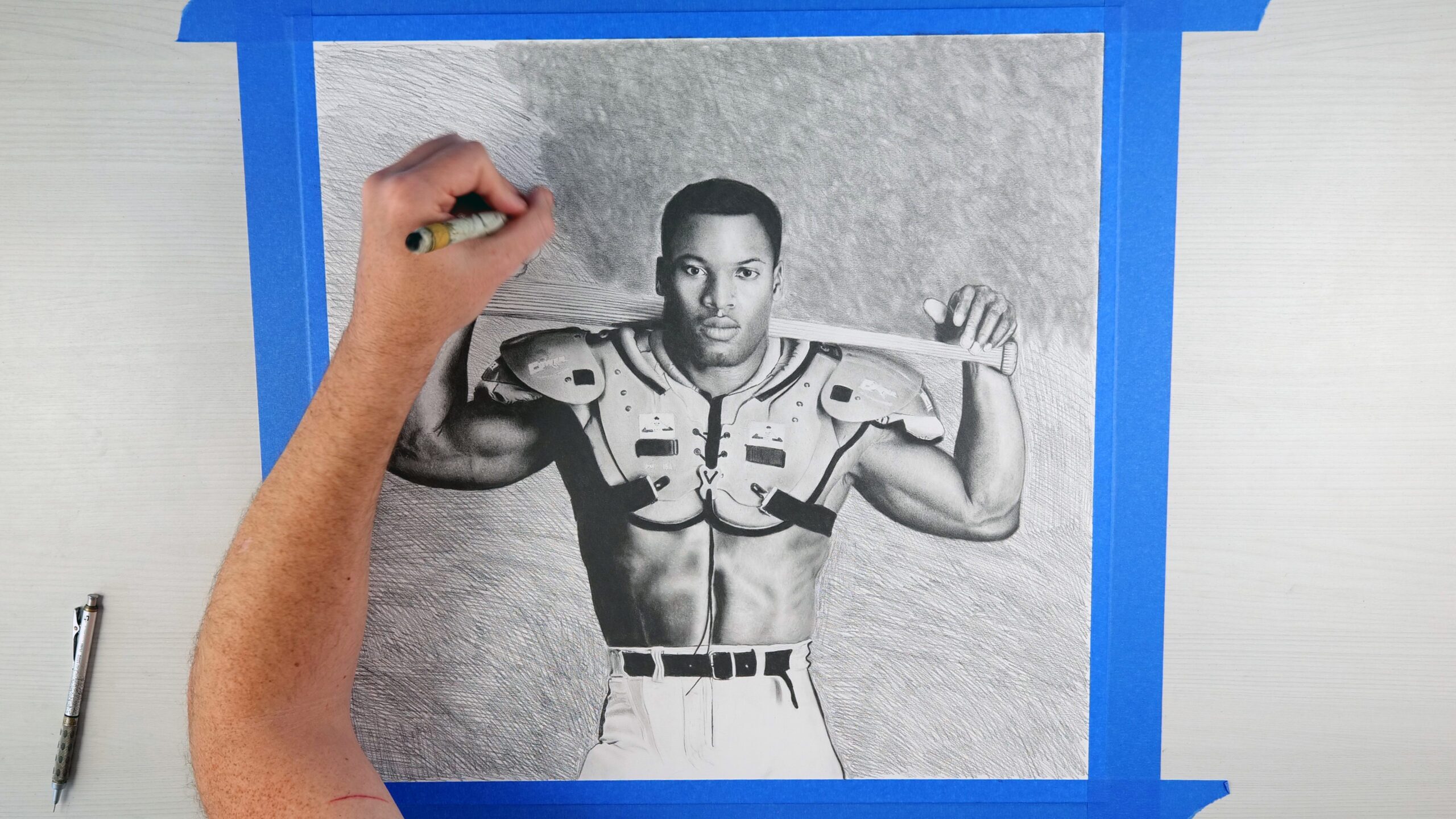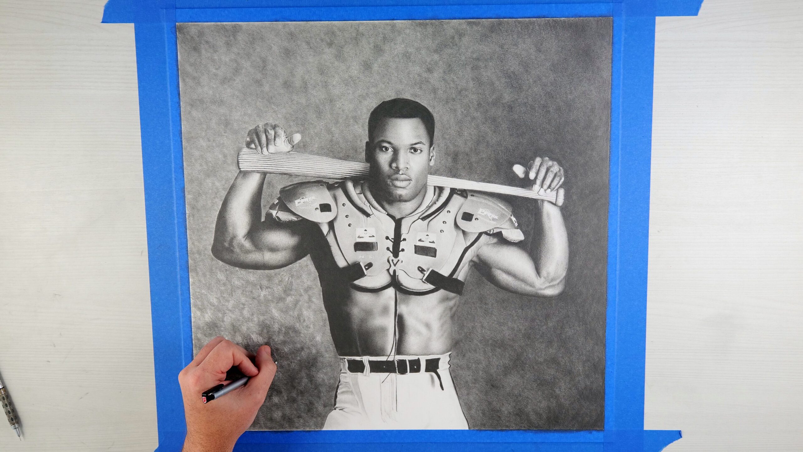 This strikingly realistic pencil drawing captures the legendary Bo Jackson in one of the most iconic images in sports history. “Bo Knows” portrays Jackson confidently posed, wearing football shoulder pads and football pants while effortlessly gripping a baseball bat across his shoulders… a timeless tribute to his extraordinary dual-sport talent.