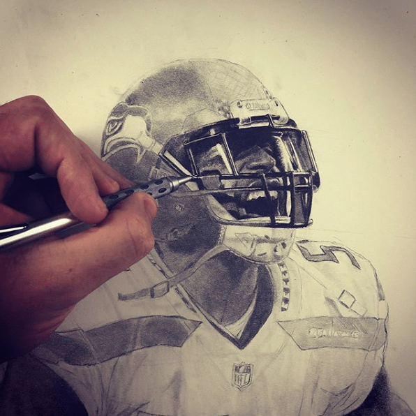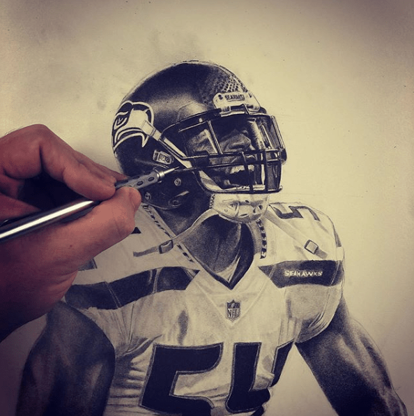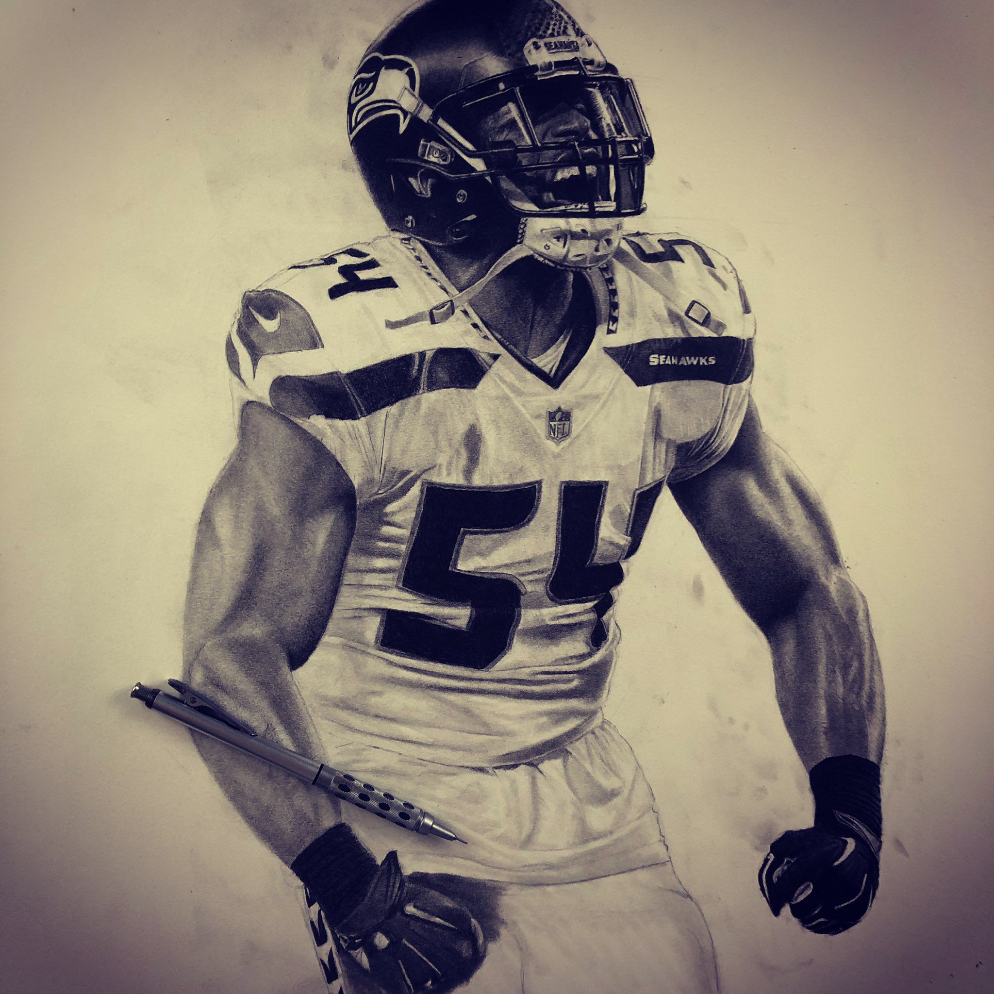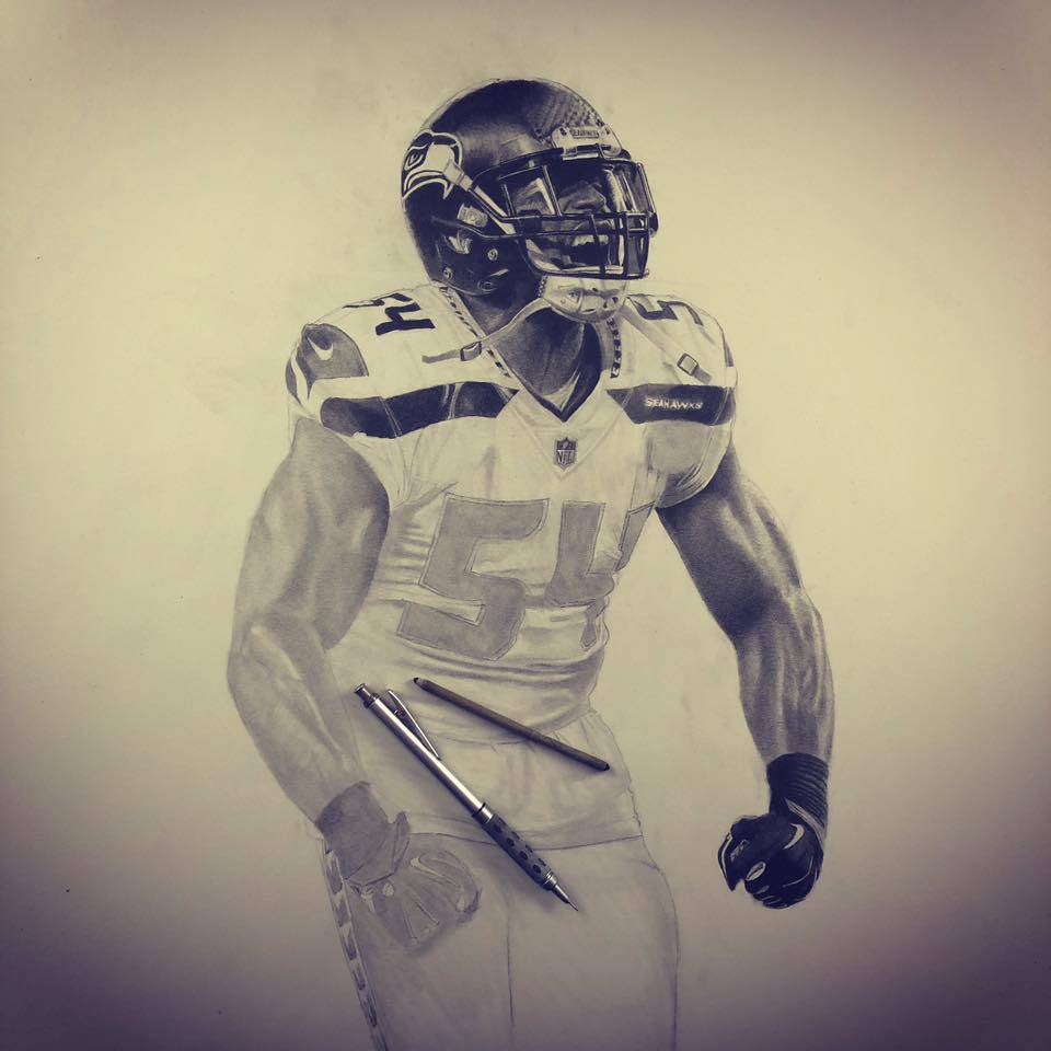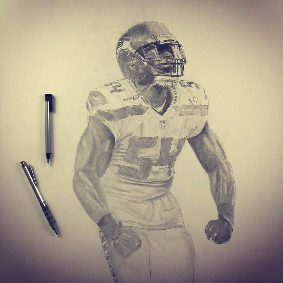 The drawing portrays football player Bobby Wagner in the middle of a victorious celebration after a quarterback sack. The focal point of the image is Bobby, whose face is contorted in a fierce expression as he screams and flexes his muscles. The level of detail in Bobby’s muscular physique is impressive, with each individual muscle group carefully rendered in pencil.