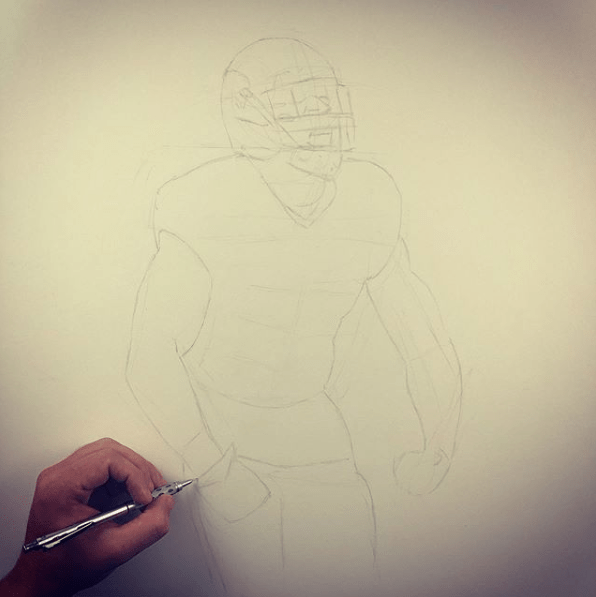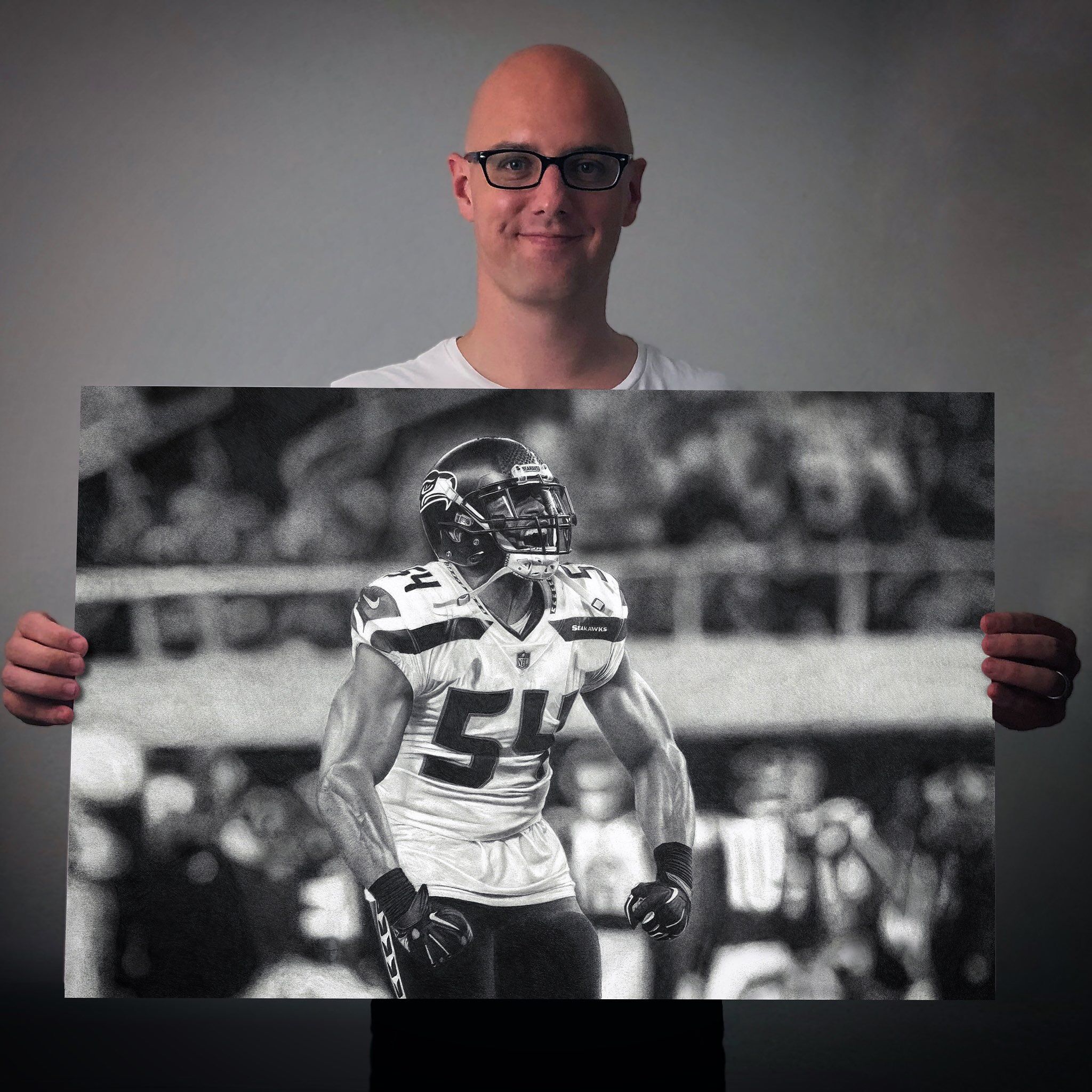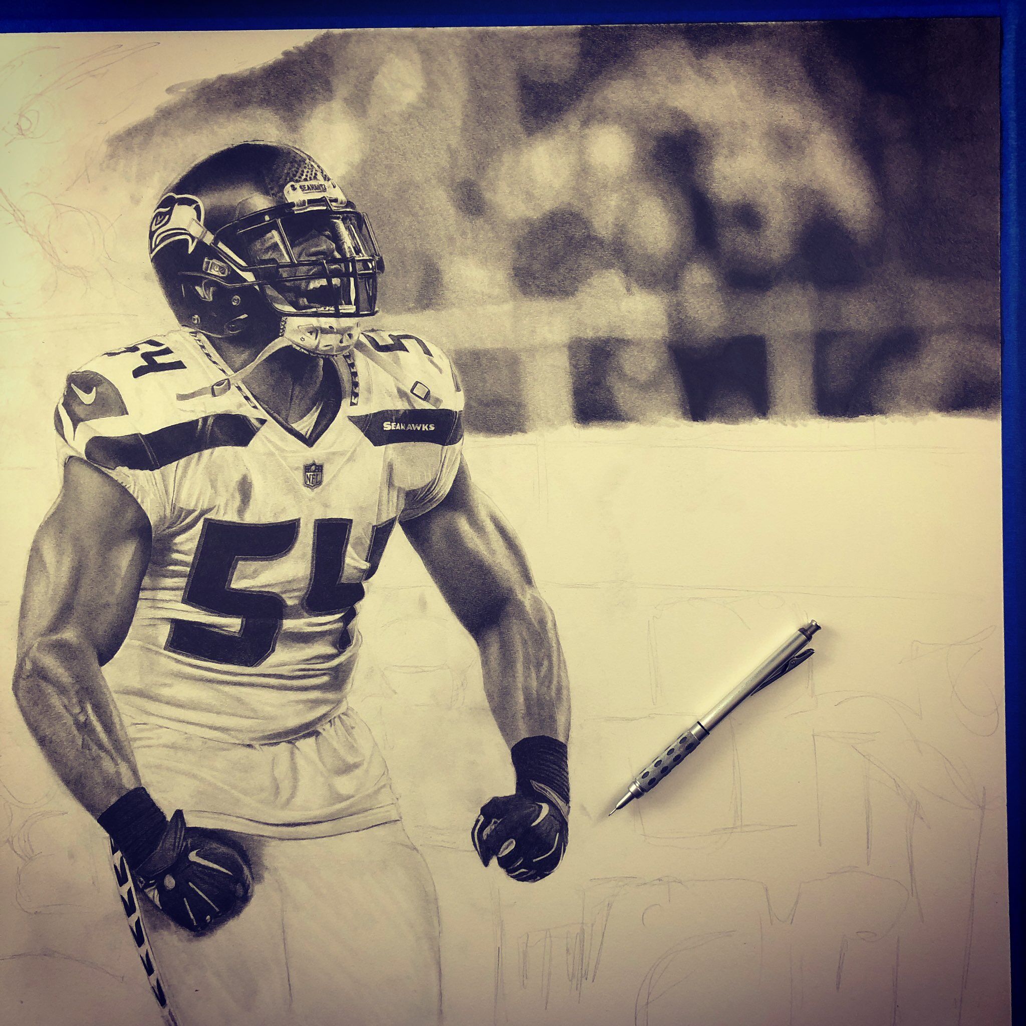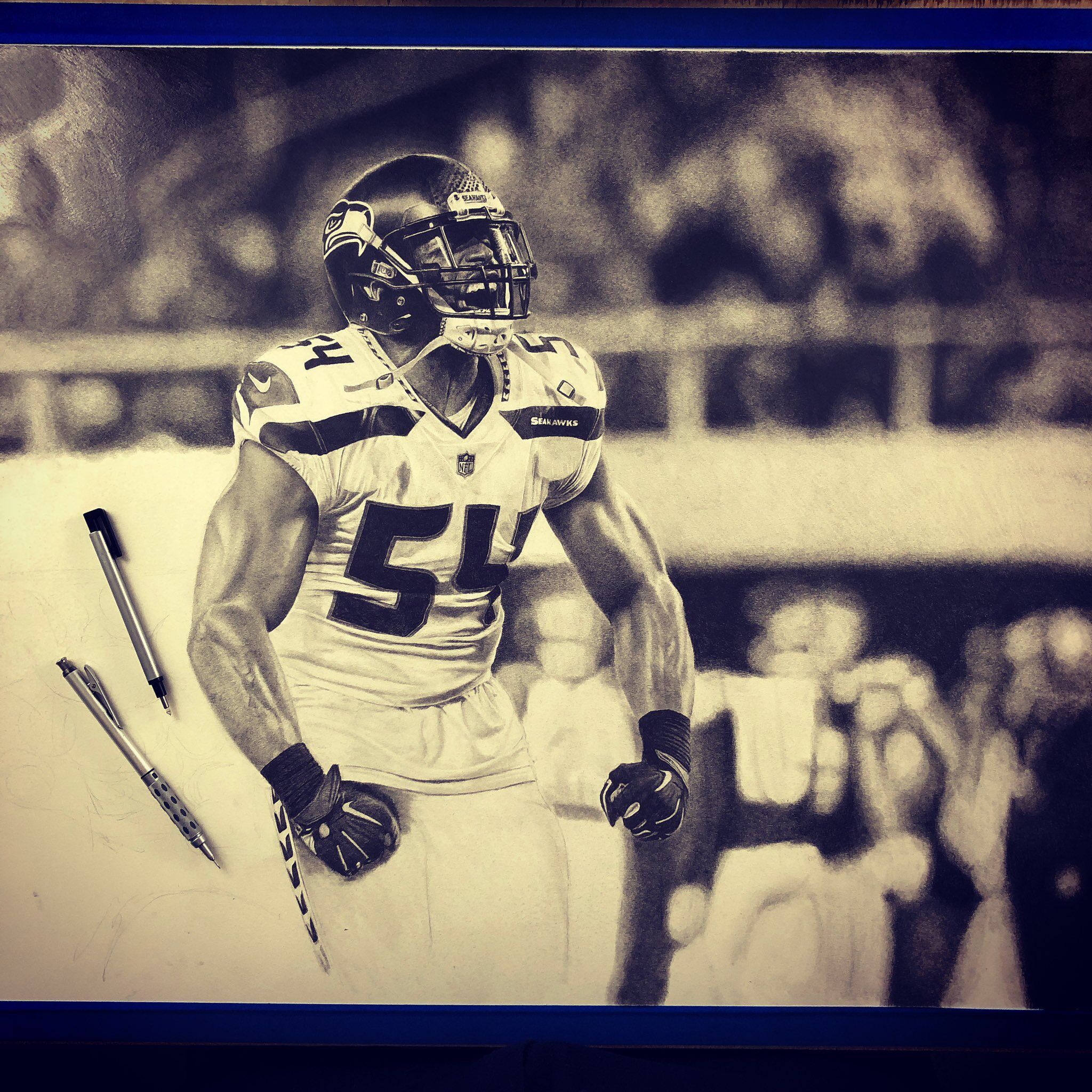 The drawing portrays football player Bobby Wagner in the middle of a victorious celebration after a quarterback sack. The focal point of the image is Bobby, whose face is contorted in a fierce expression as he screams and flexes his muscles. The level of detail in Bobby’s muscular physique is impressive, with each individual muscle group carefully rendered in pencil.