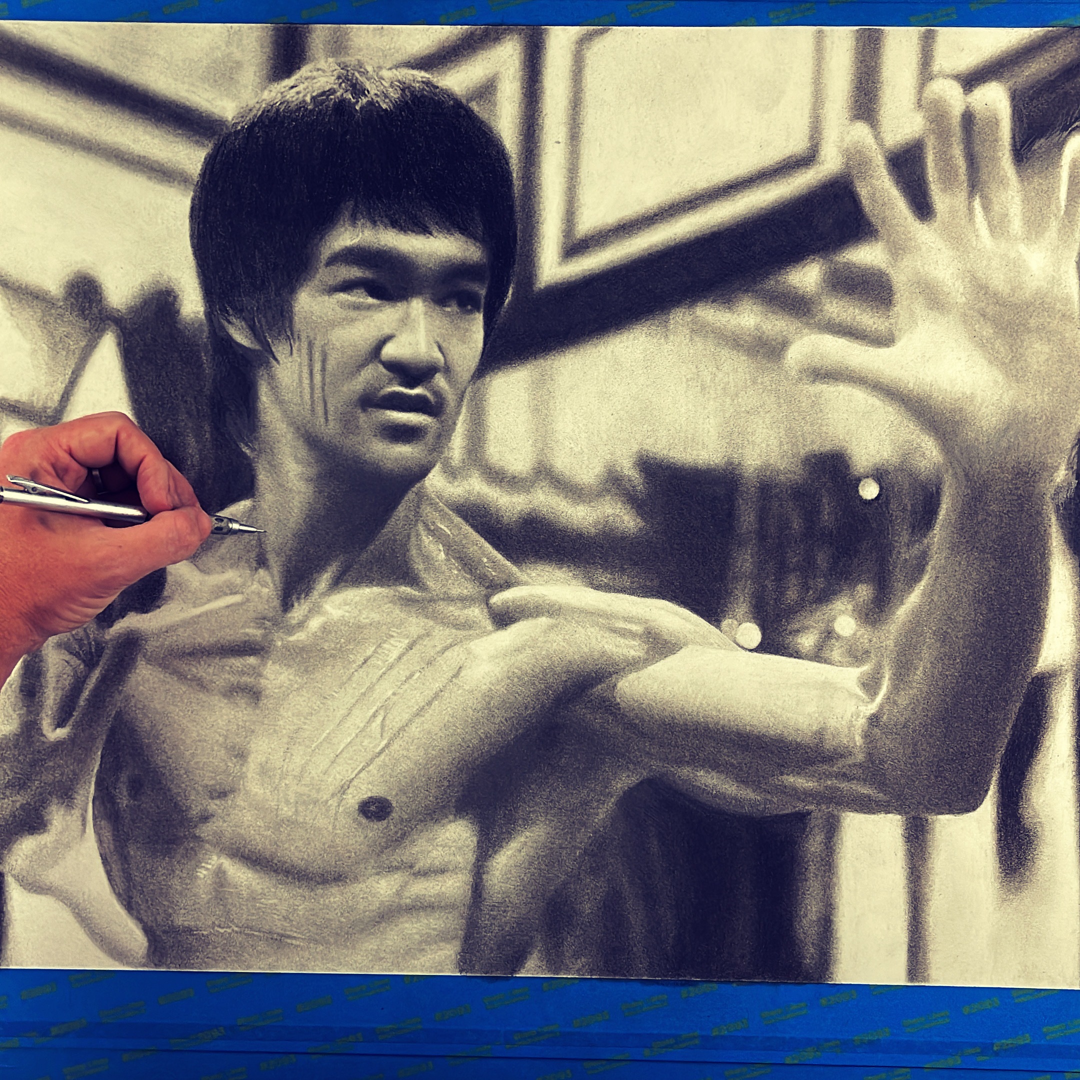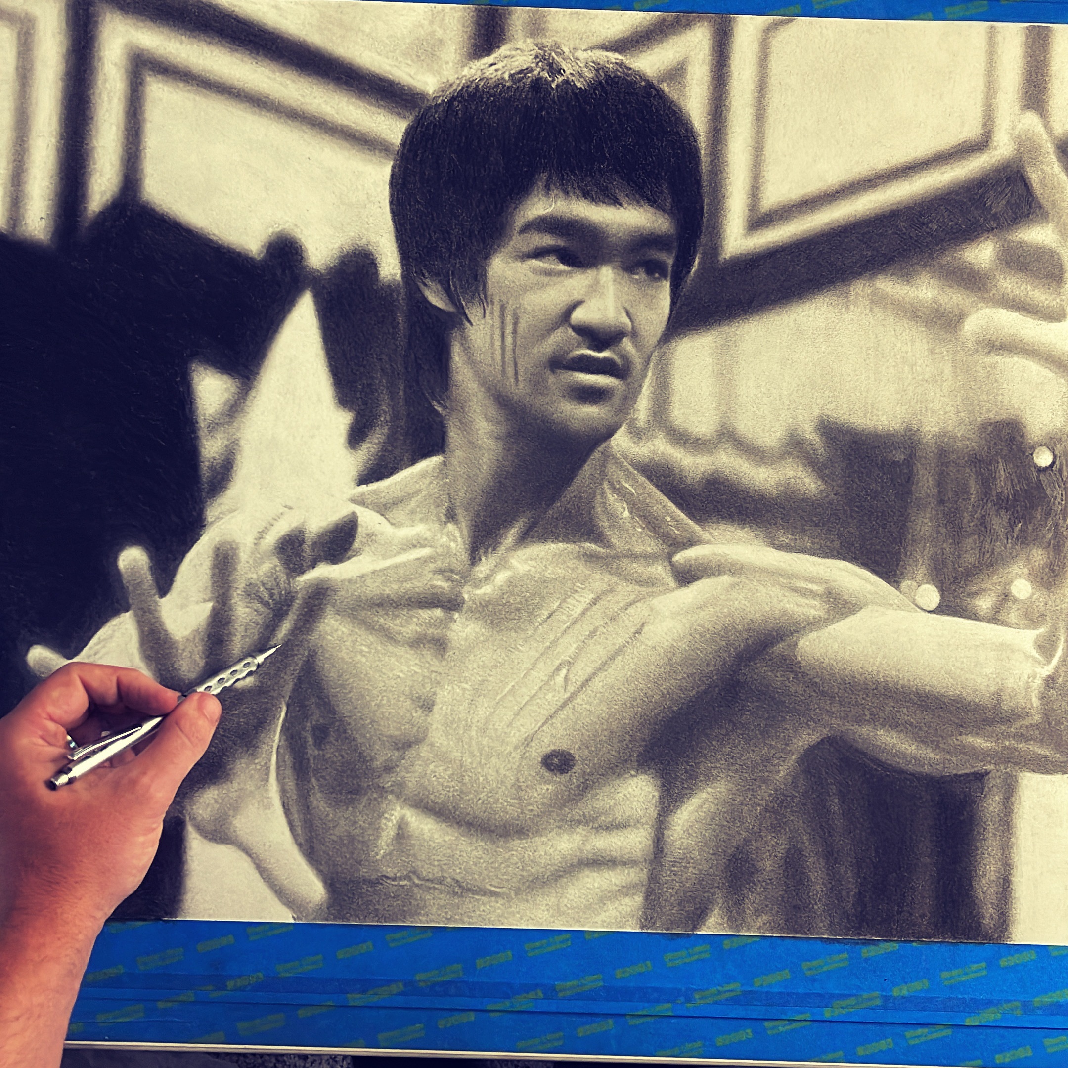 This realistic pencil drawing by artist Keegan Hall captures the legendary Bruce Lee in a scene from the iconic movie “Enter the Dragon.” The artwork, rendered in intricate detail, showcases Bruce Lee’s intense focus and unparalleled martial arts prowess.