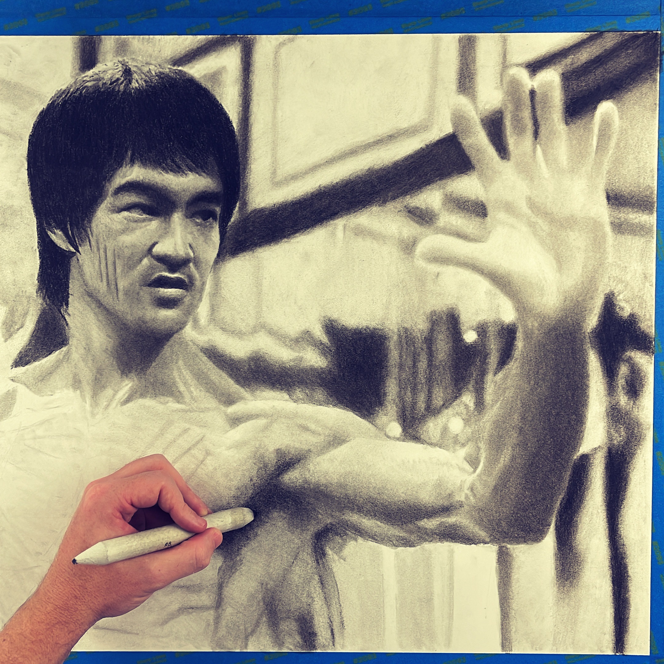 Keegan Hall’s expert use of shading and texture brings a sense of depth and realism to the piece, making it appear almost photographic in quality. The attention to detail in the folds of Bruce Lee’s clothing, the contours of his muscles, and the intensity of his gaze all contribute to the overall impact of the artwork.