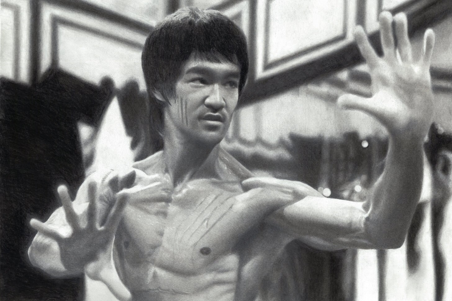 The drawing is composed primarily of various shades of graphite, which the artist skillfully employs to create a striking contrast between light and shadow. Bruce Lee is depicted in a dynamic pose, with his muscular physique and signature jumpsuit rendered in meticulous detail. His facial expression conveys a sense of determination and concentration, as if he is about to unleash a powerful strike.