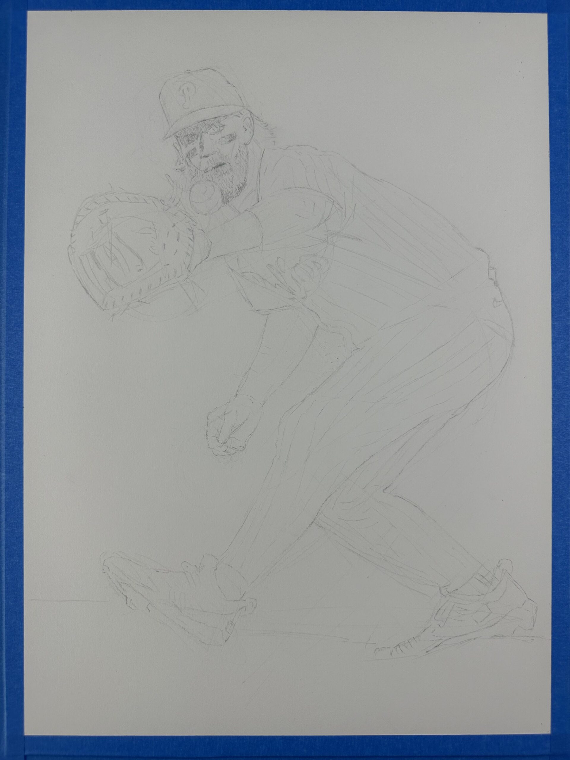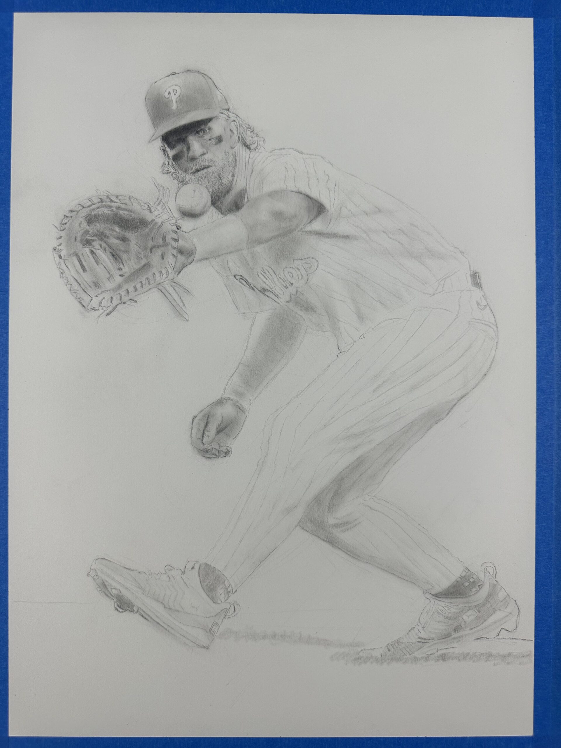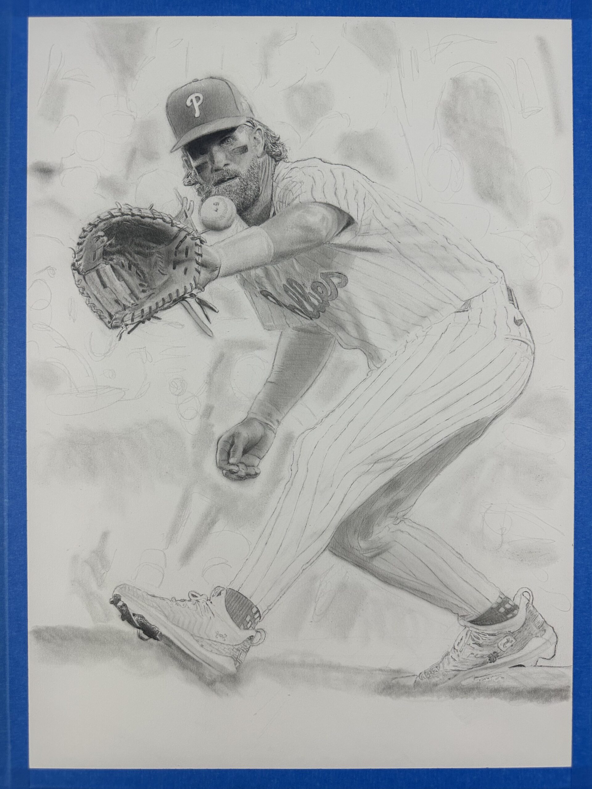 This graphite drawing captures Bryce Harper of the Philadelphia Phillies in a moment of pure commitment – stretching toward a catch at first base, glove extended, right foot planted on the bag. It’s a perfect balance of concentration and precision.