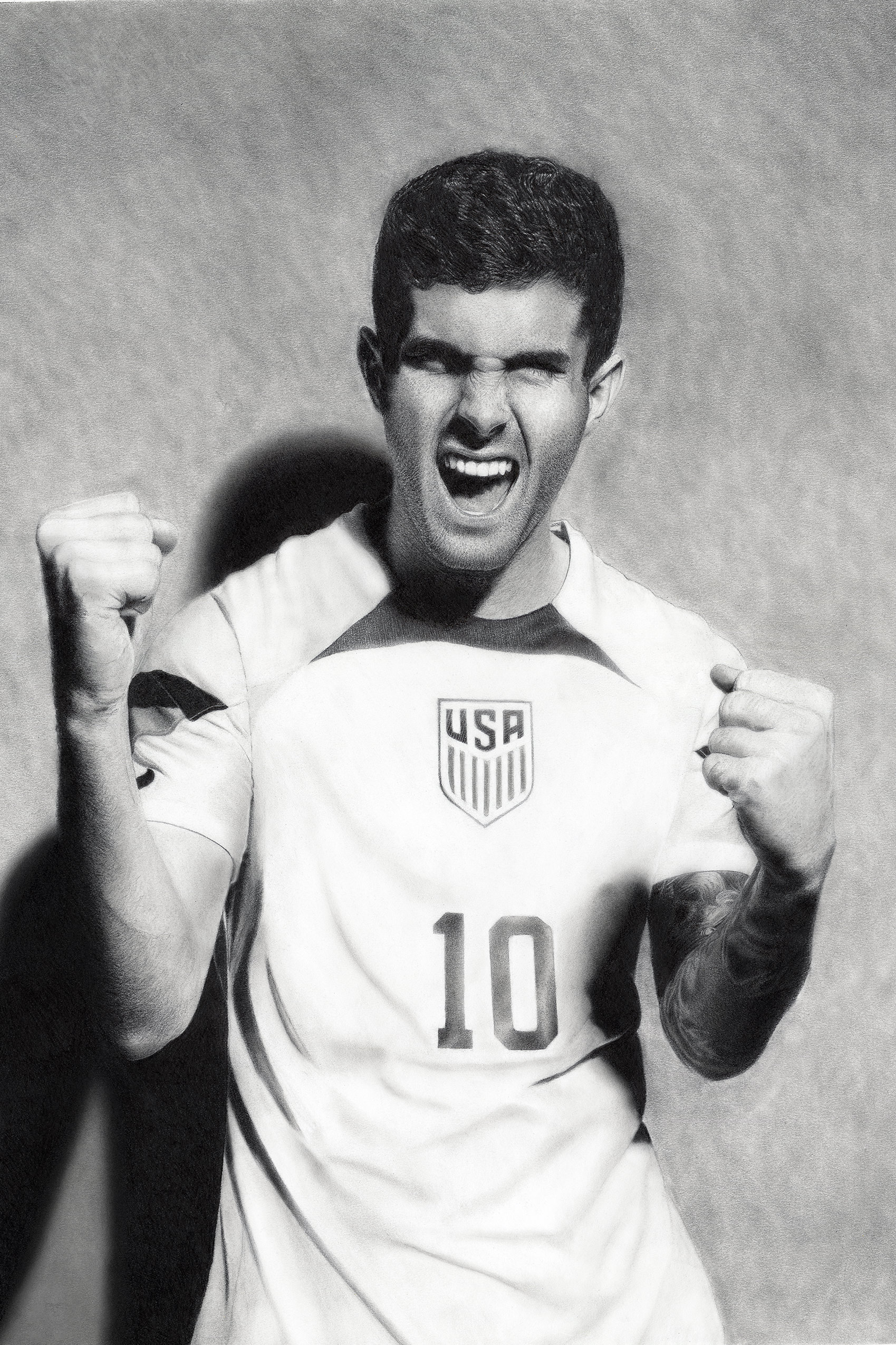 The pencil drawing captures a studio version of the exhilaration and energy of Christian Pulisic’s celebration after scoring a goal for the US Men’s national soccer team. The drawing is a realistic representation of the athlete, capturing his likeness with precision and detail. Pulisic’s facial expression is one of pure joy and excitement as he screams out in celebration, his mouth open wide and his eyes squinted in pure ecstasy.