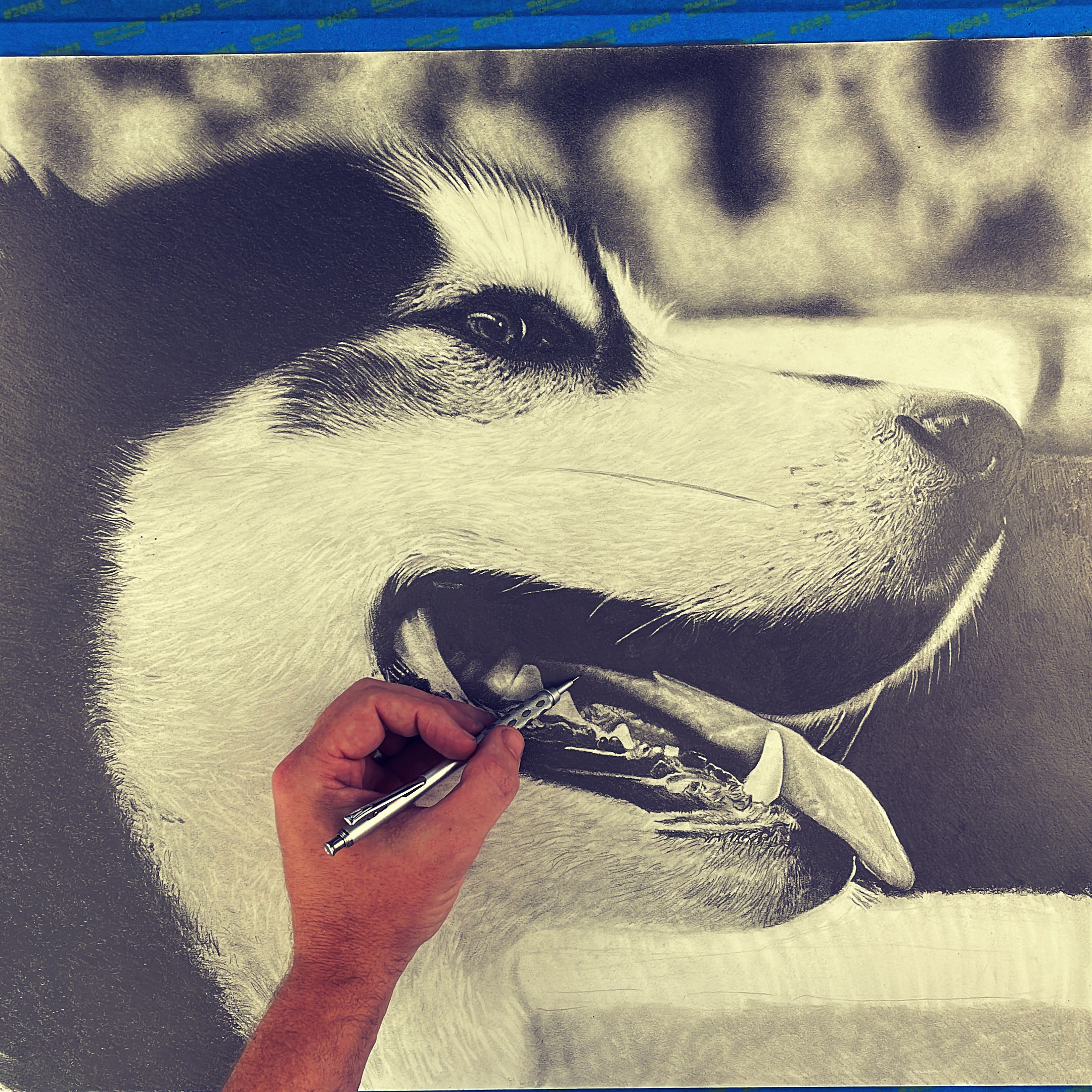 Dubs is depicted in profile with his tongue lolling out of his mouth and his eyes sparkling with excitement. Keegan has captured the thick fur and distinctive features of the husky breed with great care, using a range of pencil strokes to create a sense of texture and depth.