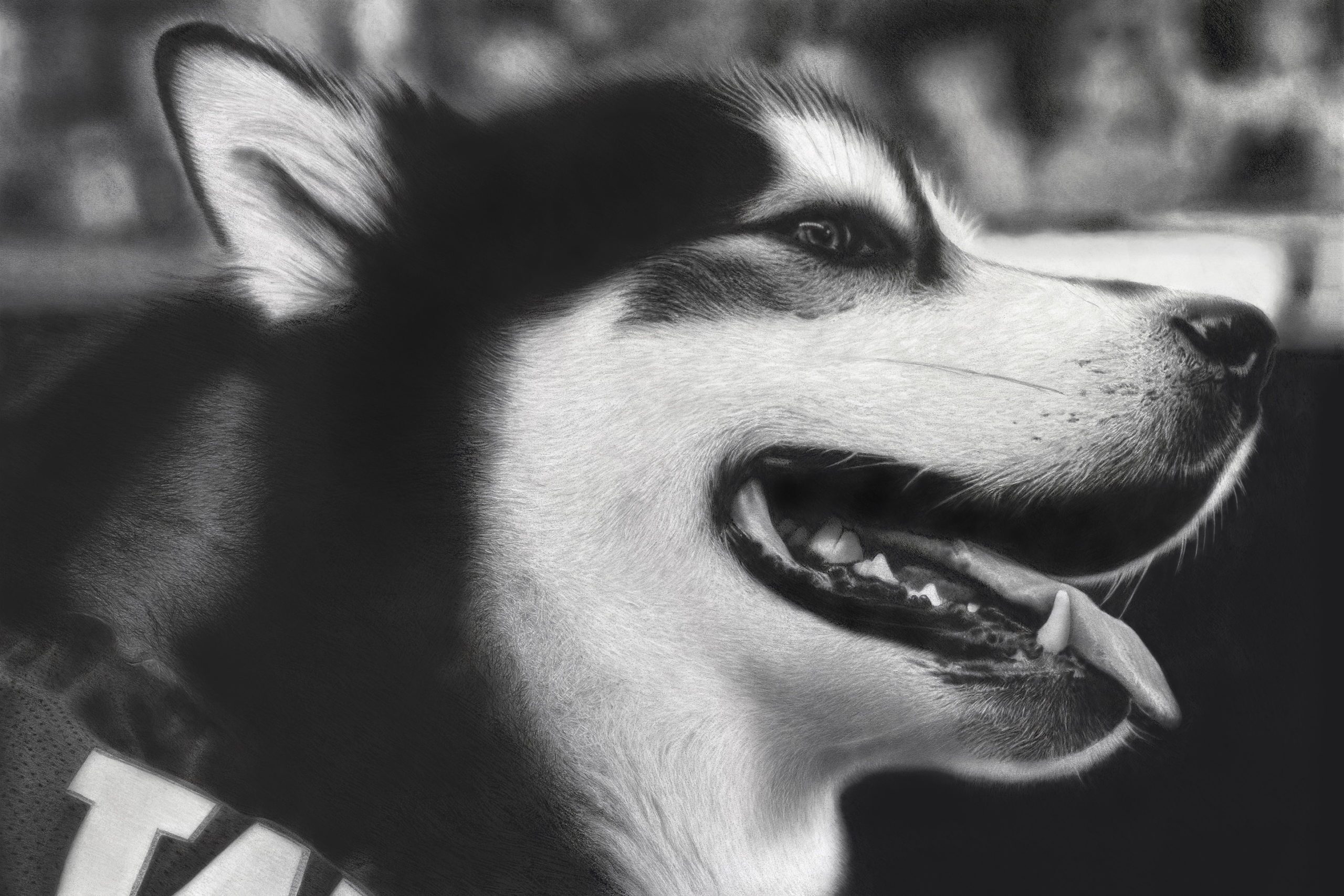 The pencil drawing by Keegan features “Dubs”, the beloved husky mascot for the University of Washington and was the centerpiece of a project at UW vs Stanford football game. The drawing is incredibly realistic, capturing the spirit and energy of the mascot with remarkable precision and detail.