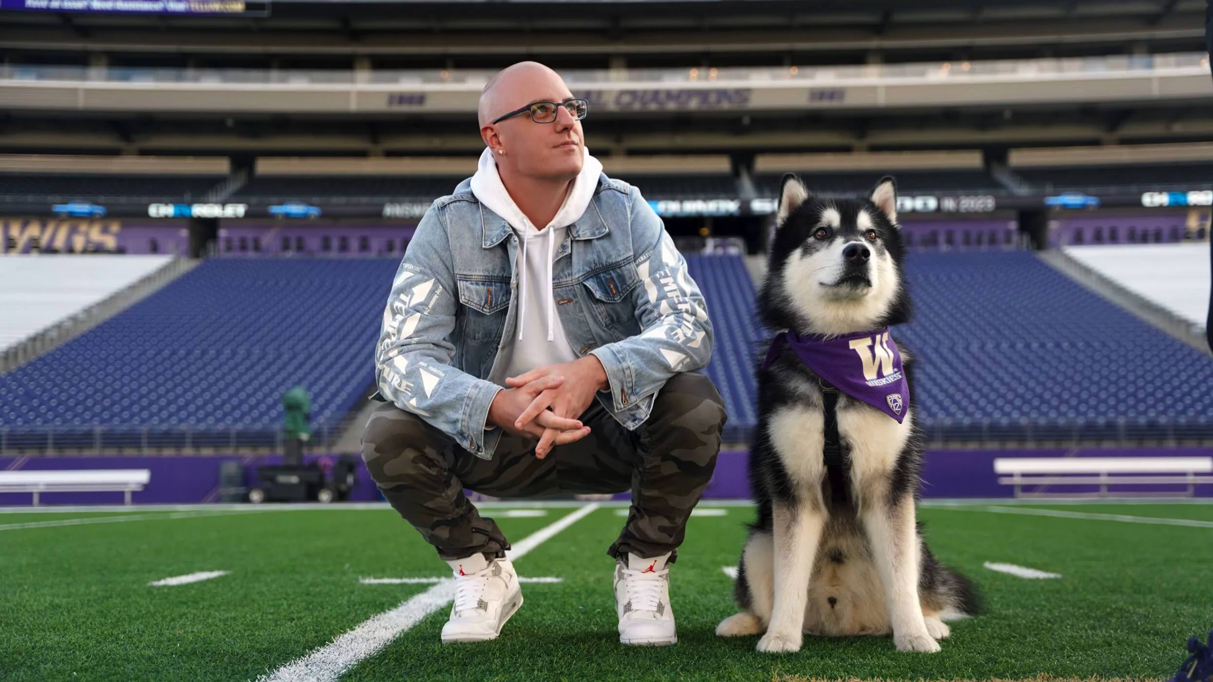 The composition features a close-up of Dubs with a hint of Husky Stadium in the blurry background, which adds a sense of depth to the piece.