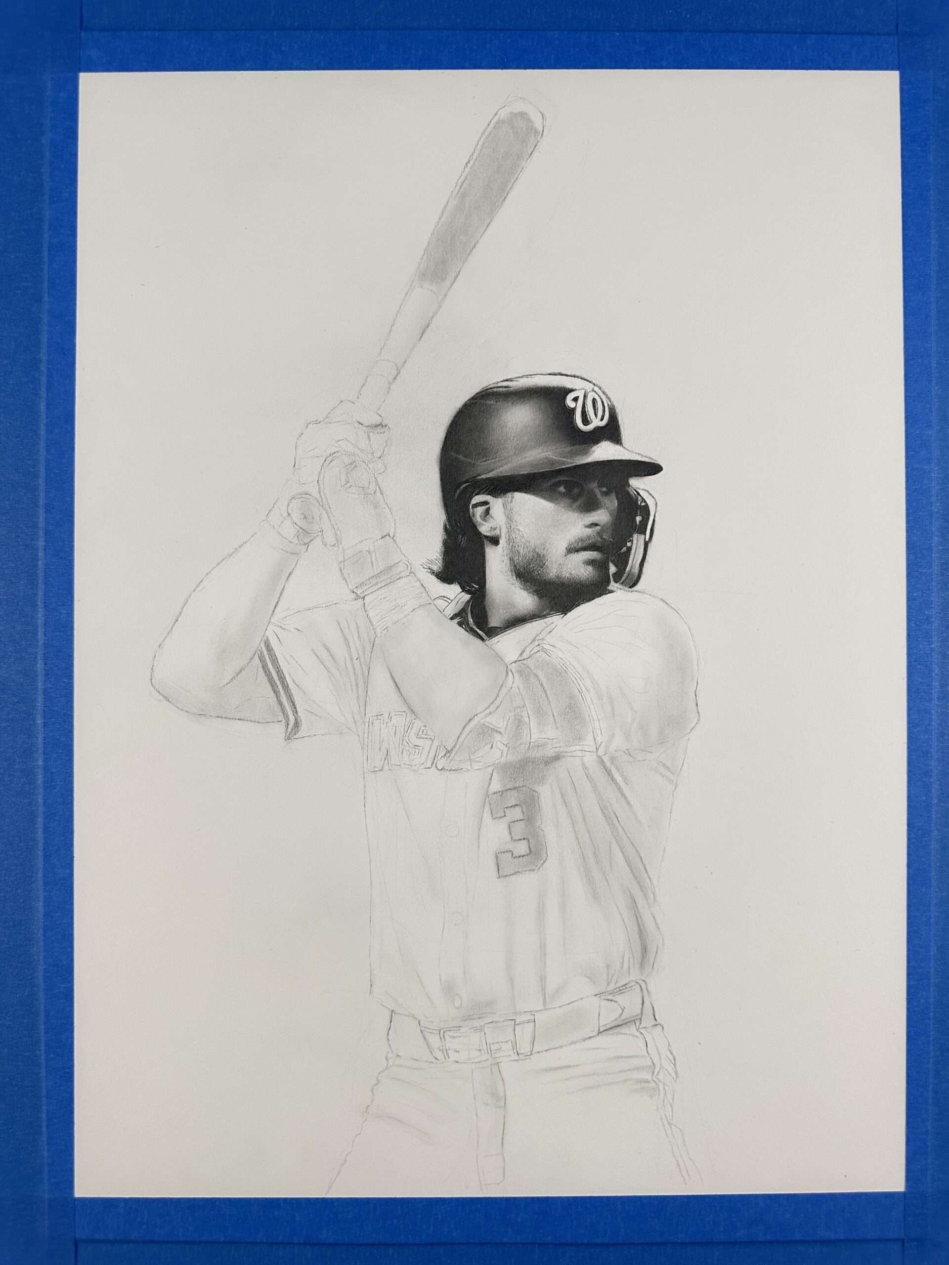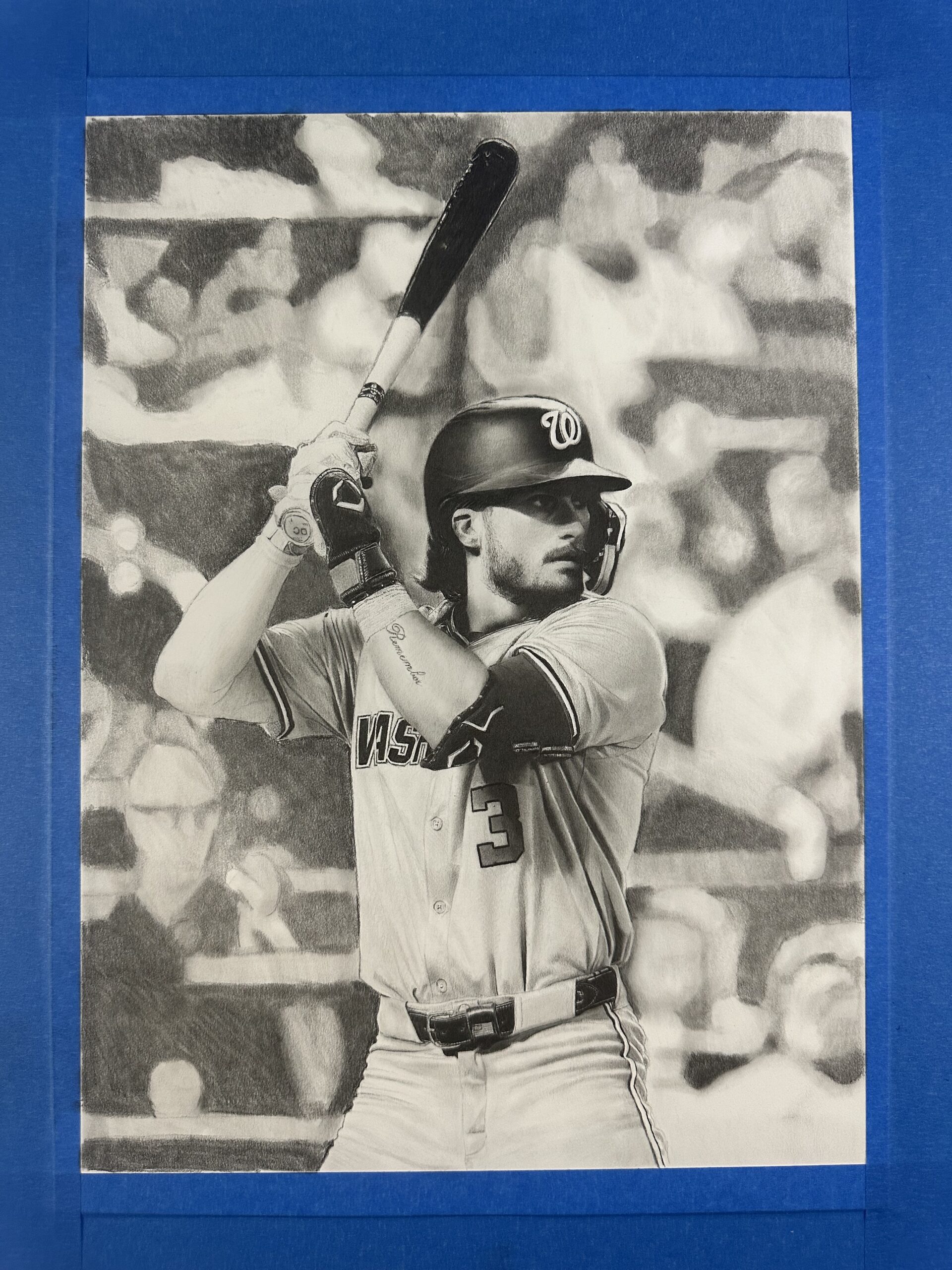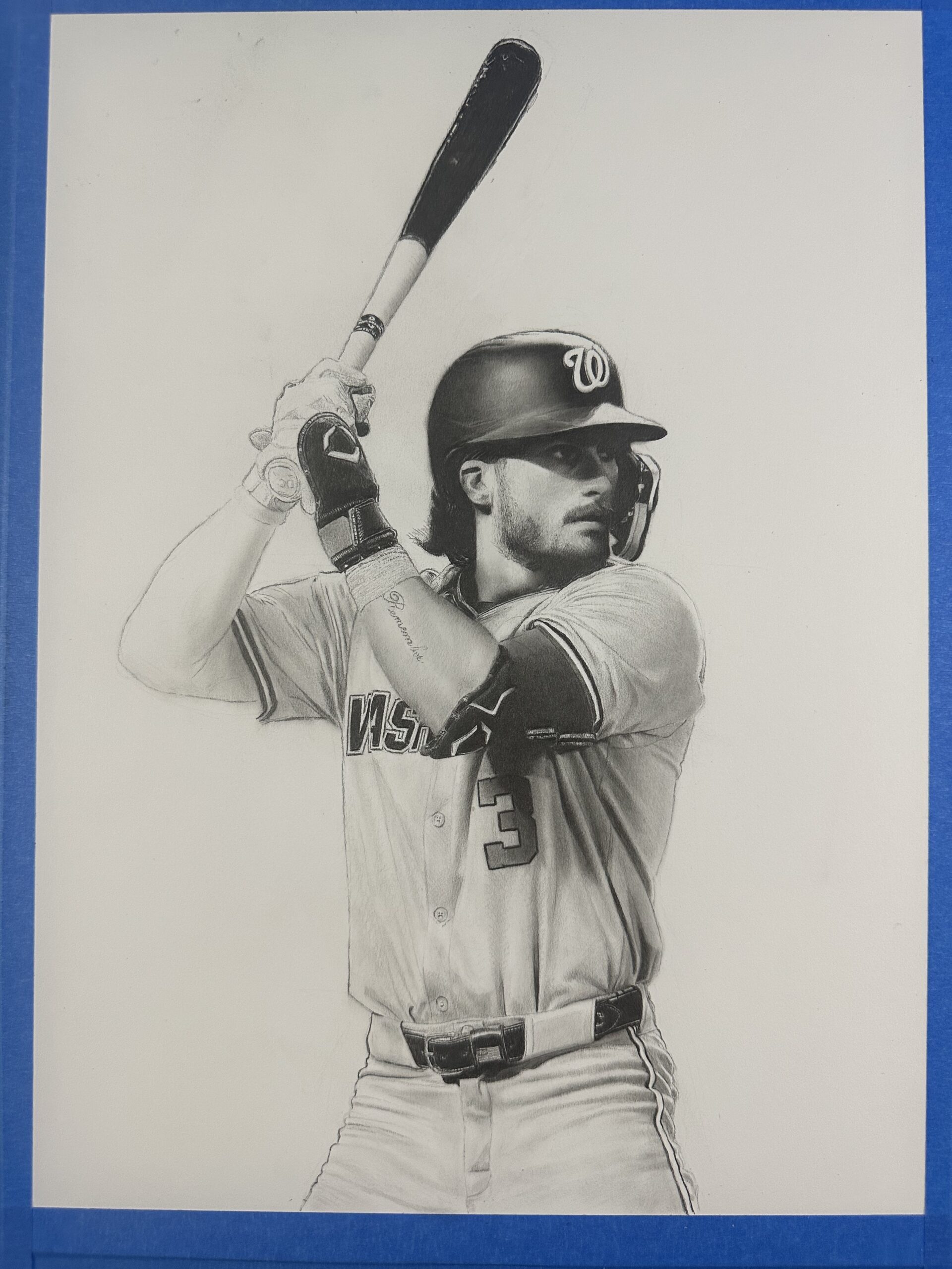 This graphite drawing captures Dylan Crews of the Washington Nationals in a moment of pure focus – standing at the plate, eyes locked in, ready to unleash his swing. Every muscle, shadow, and line tells the story of a player built on preparation, confidence, and quiet intensity.