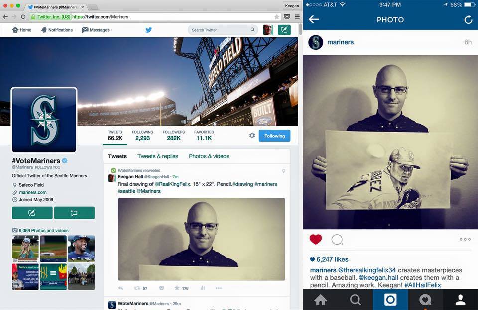 The pencil drawing portrays Felix Hernandez, the Seattle Mariners’ ace pitcher, in a stunning and dynamic pose, and is in the middle of his follow-through. The perspective of the drawing places the viewer in the batter’s box, and Felix’s pitch seems to be hurling towards them, creating a sense of motion and energy in the piece.