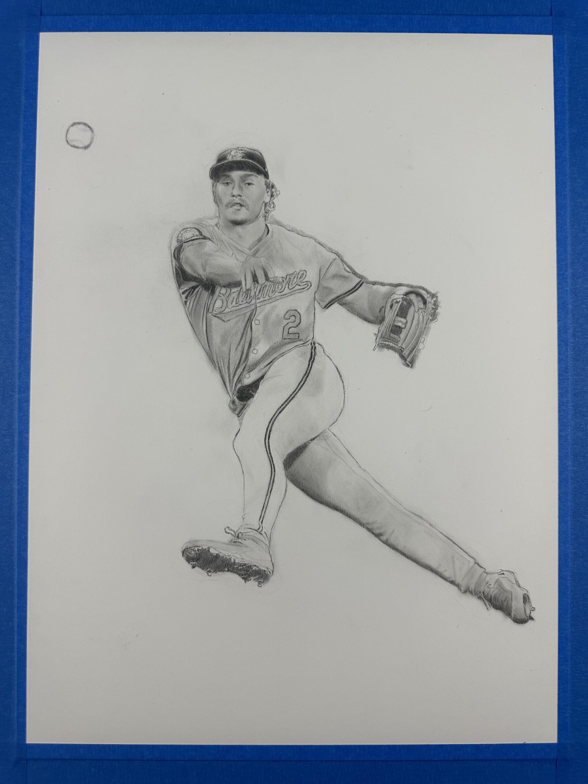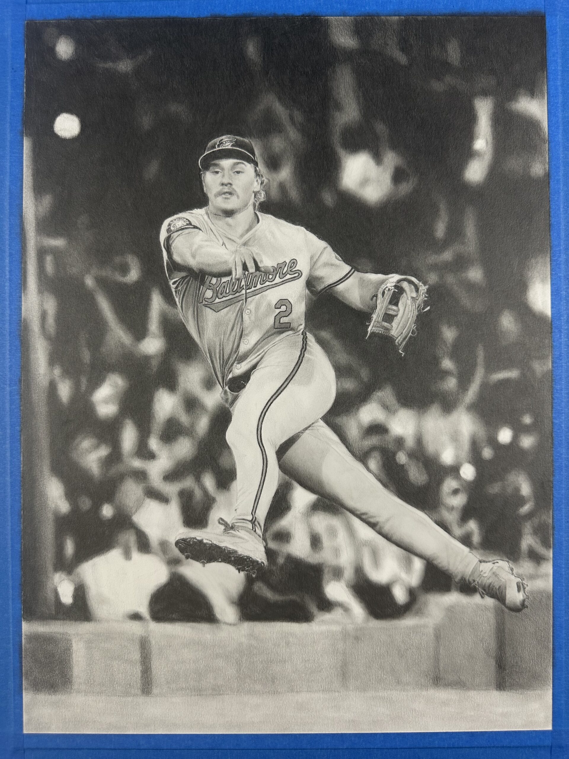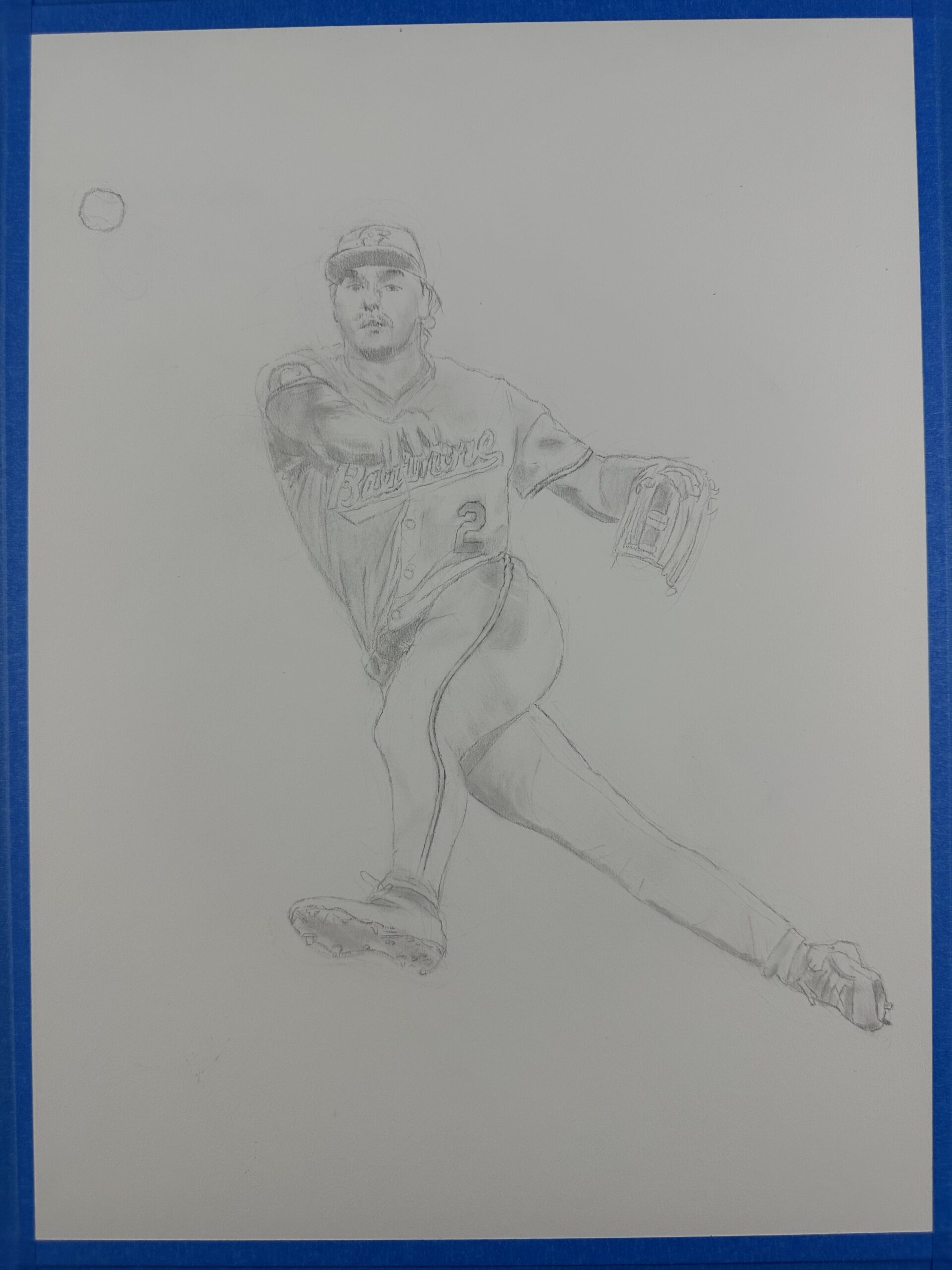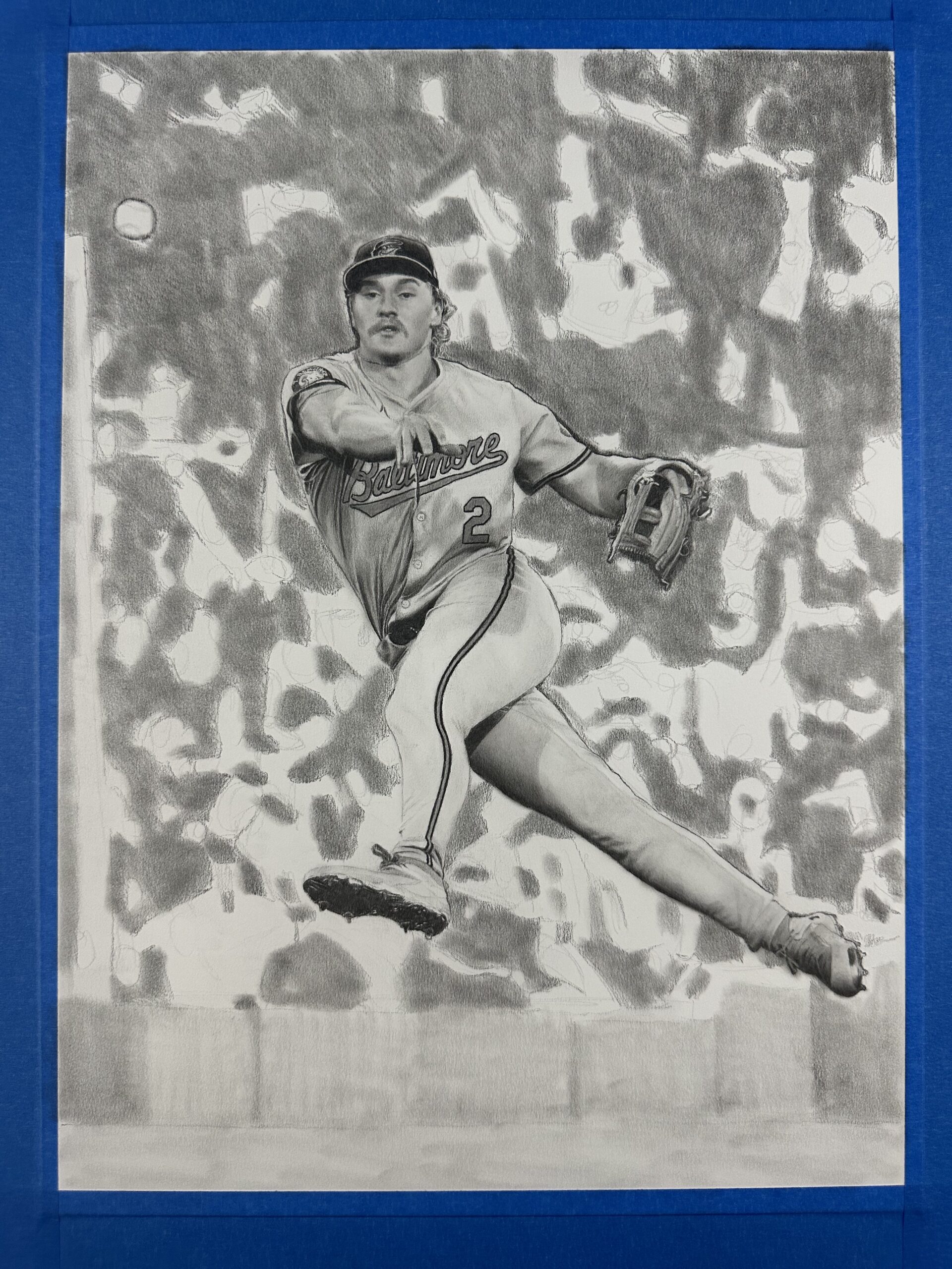 In this graphite drawing, Gunnar Henderson is captured mid-air, fully extended as he makes an impossible throw to first base. Suspended in motion, his body twists with power and precision, embodying the intensity and athleticism that have made him one of baseball’s most exciting young players.
