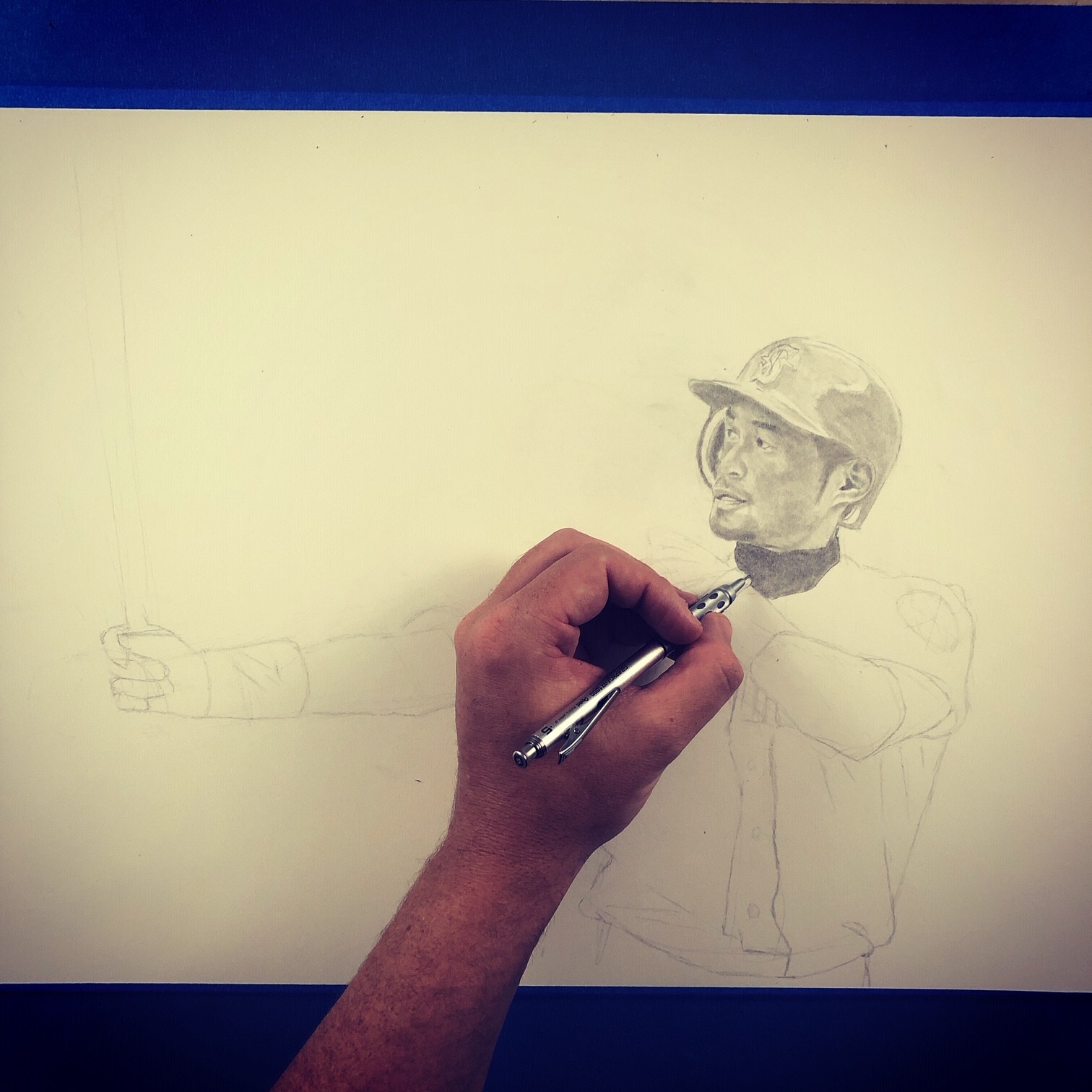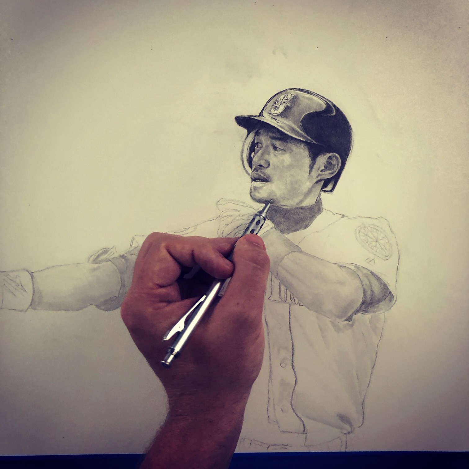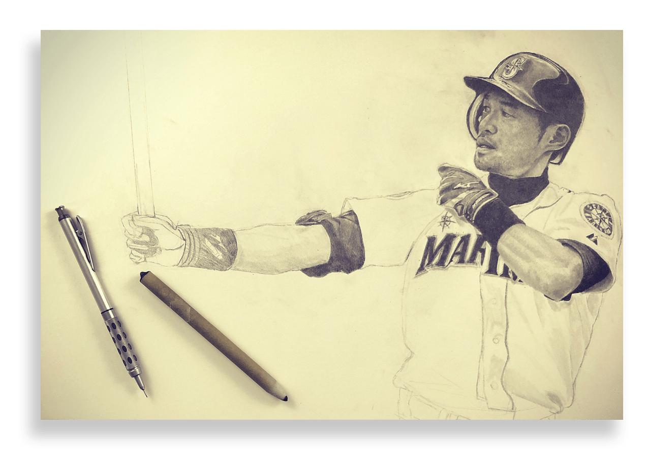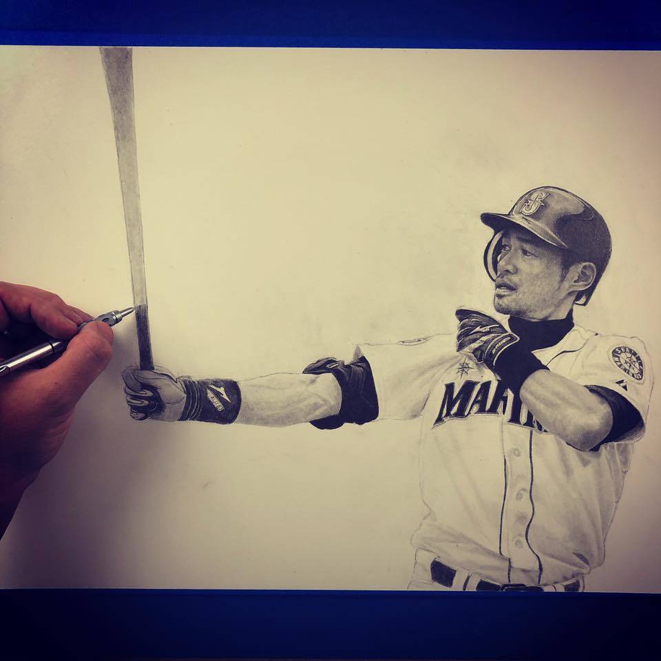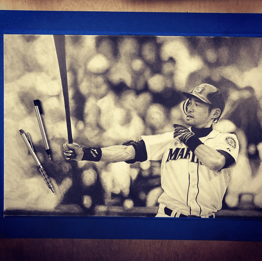 Keegan has paid close attention to detail, rendering the folds of Ichiro’s jersey, and the texture of his batting gloves with great precision. The crowd in the background of the image is a blurred out, which gives the drawing a deep sense of depth and further emphasizes Ichiro’s dynamic pose.