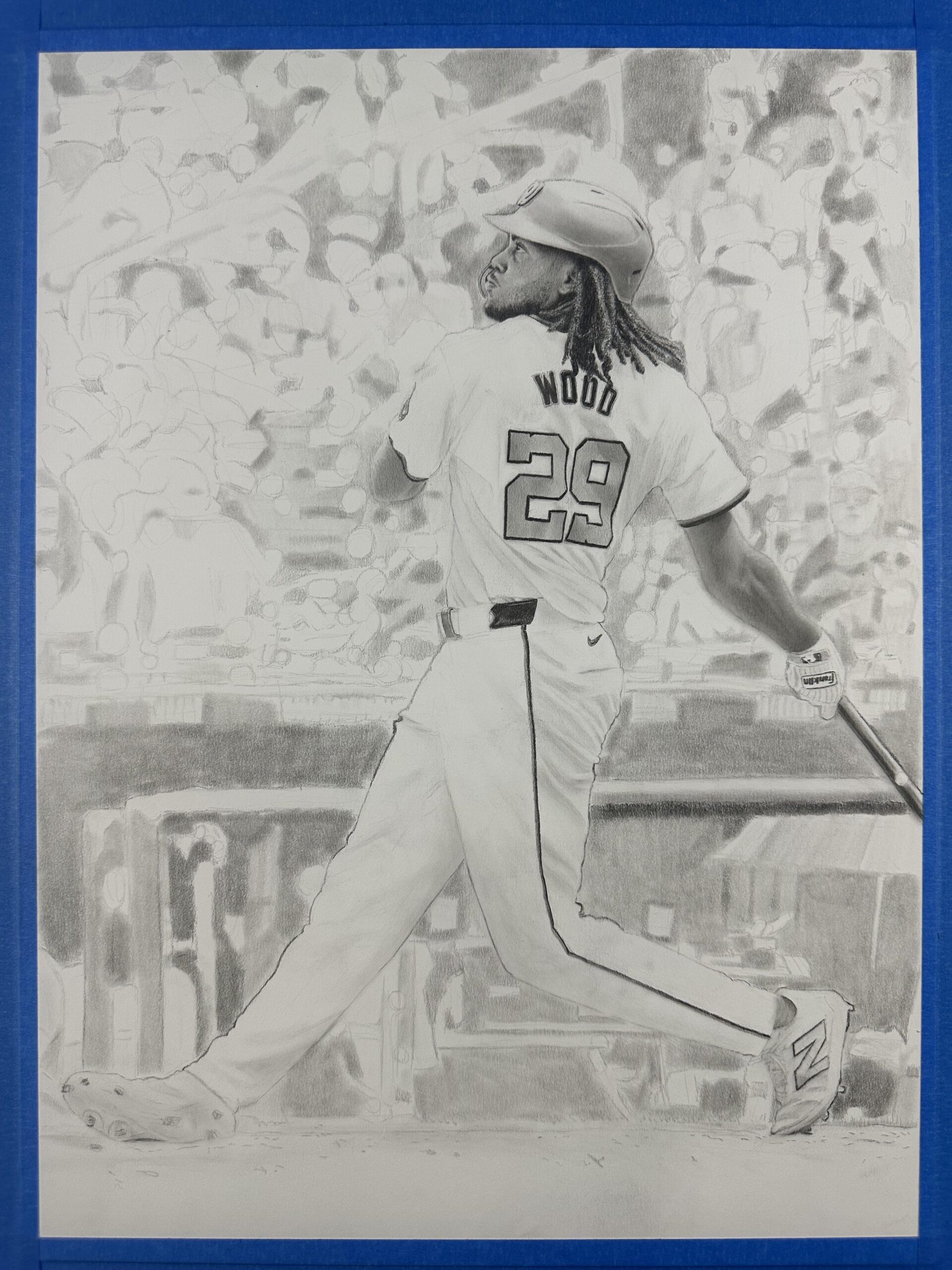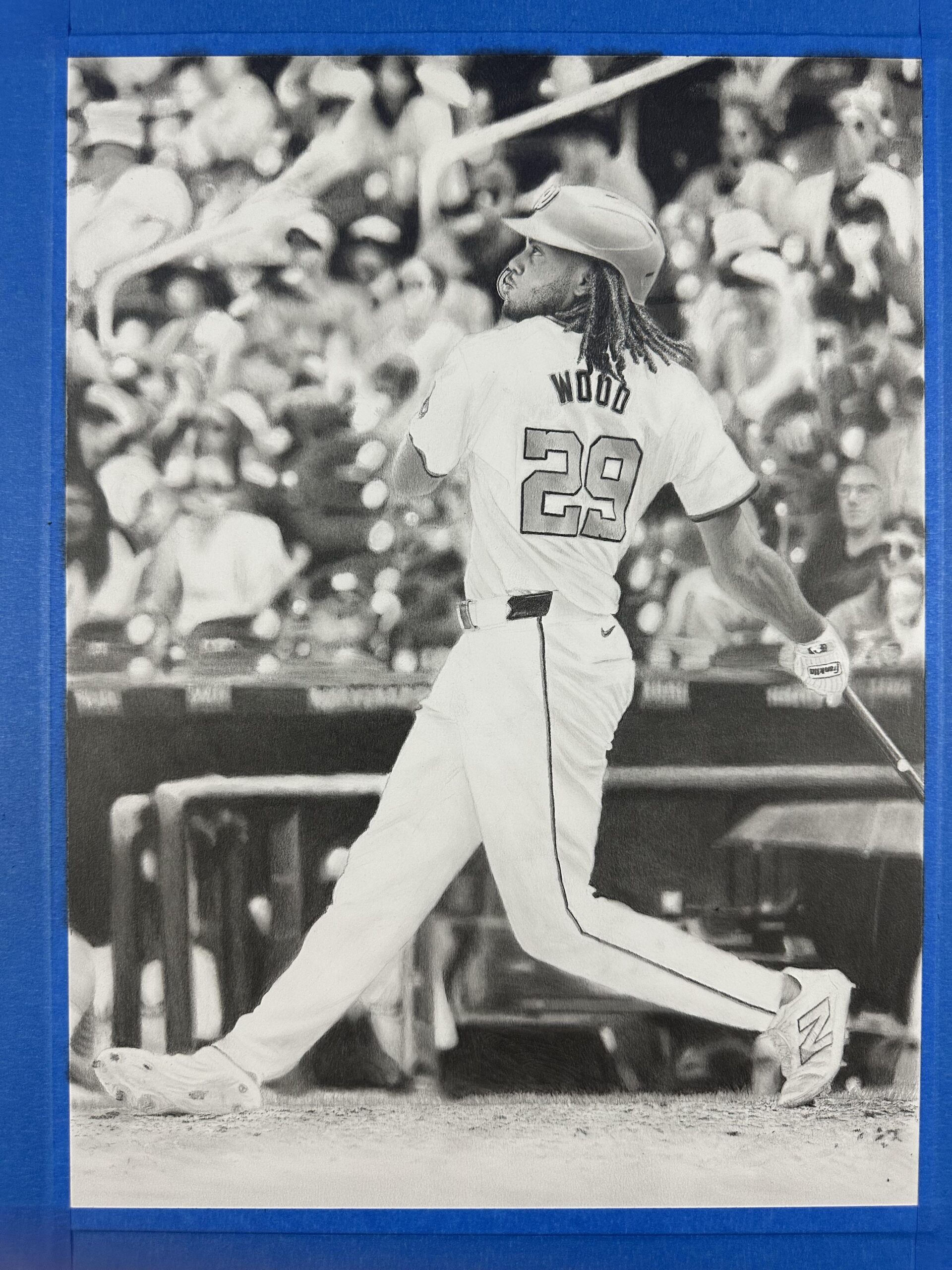 This graphite drawing captures James Wood, the Washington Nationals’ rising star, at the perfect moment – the end of his powerful swing as he watches the ball soar into the stands. You can almost feel the stillness before the roar, the collective breath of the crowd as they realize it’s gone.