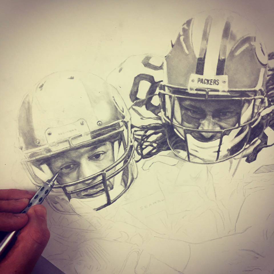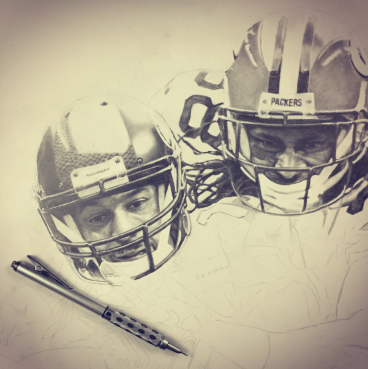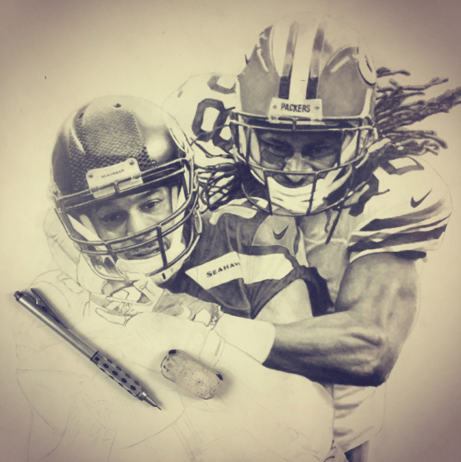 Overall, the drawing captures the raw emotion of a moment of triumph and showcases the artist’s talent in capturing the human form with pencil and paper. The drawing is a fitting tribute to one of the most memorable plays in the history of the Seattle Seahawks.