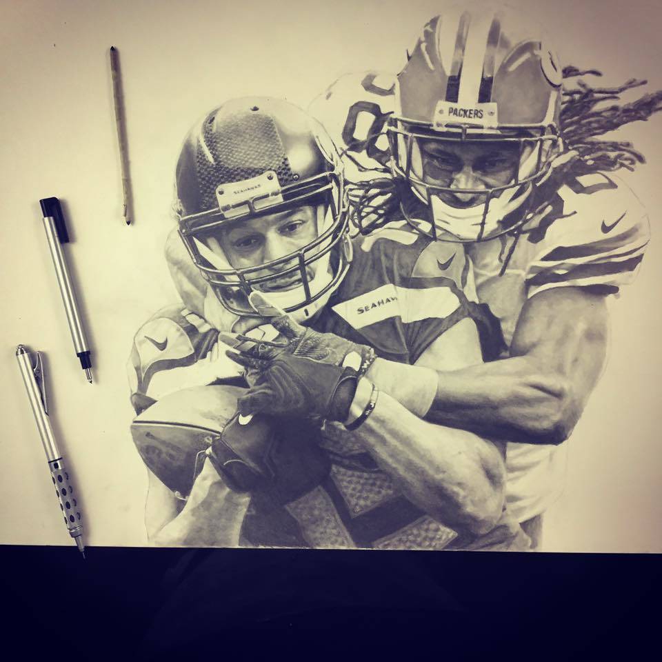 The attention to detail in the drawing is impressive, with every line and contour of Kearse’s face and body rendered with precision and care. The artist has captured the texture of the football uniforms and the intensity of the moment with remarkable accuracy and skill.