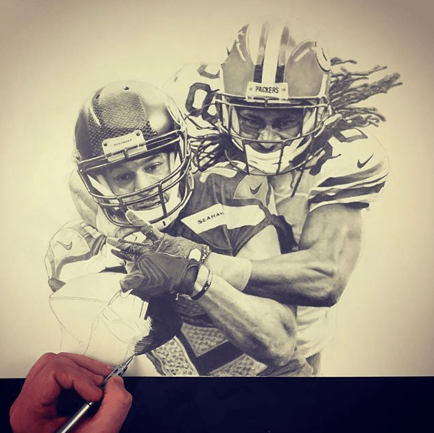 The attention to detail in the drawing is impressive, with every line and contour of Kearse’s face and body rendered with precision and care. The artist has captured the texture of the football uniforms and the intensity of the moment with remarkable accuracy and skill.