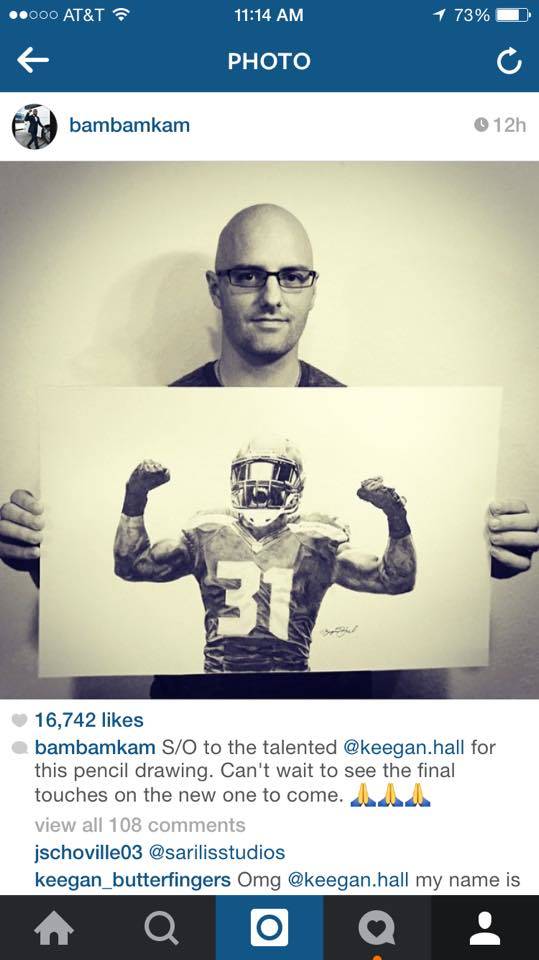 The background is all white to emphasize Kam as the focal point, and further highlights his powerful presence in the forefront of the drawing. Overall, the drawing perfectly captures Kam’s strength and intensity on the field.