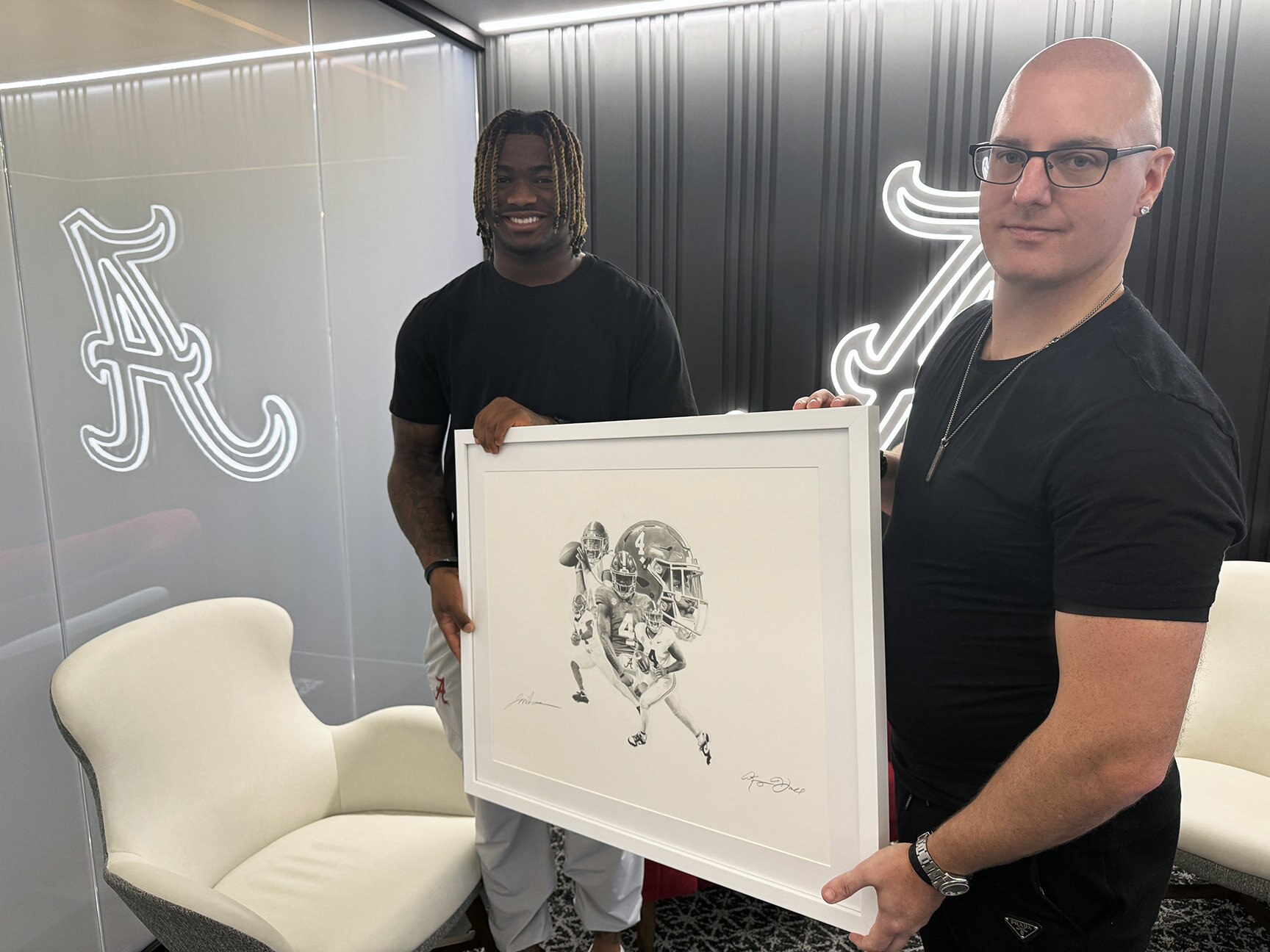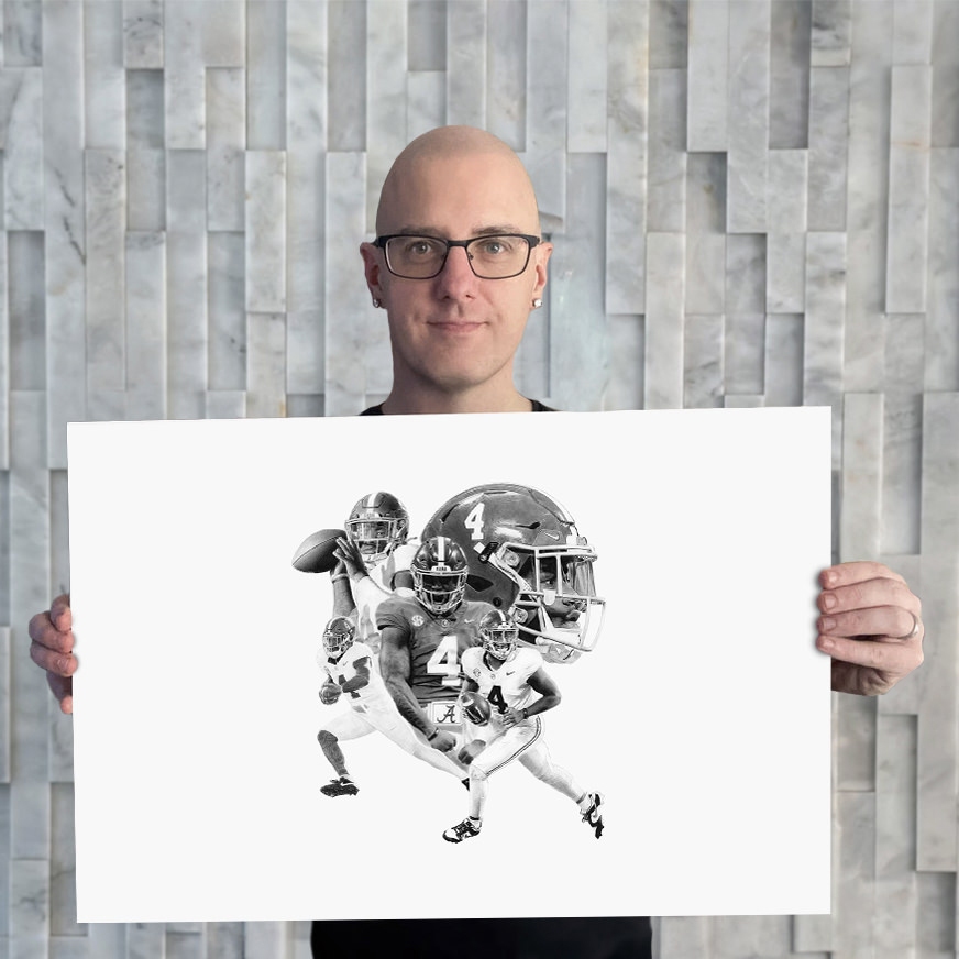 This original hyper-realistic pencil drawing by Keegan Hall masterfully captures five moments from Alabama Football star Jalen Milroe’s career. Each segment of the drawing presents a unique snapshot of Jalen’s journey, bringing to life the raw emotions of his football experience. From the focused determination in his early moments on the field, to the unbridled joy of a game-winning hit, to the intensity of a high-stakes play, Keegan’s exquisite attention to detail and shading makes every scene feel incredibly lifelike. The composition offers fans a powerful glimpse into Jalen’s passion, grit, and love for the game, showcasing his evolution as one of football’s rising stars.
