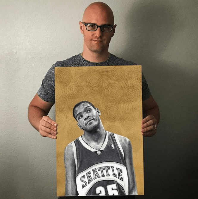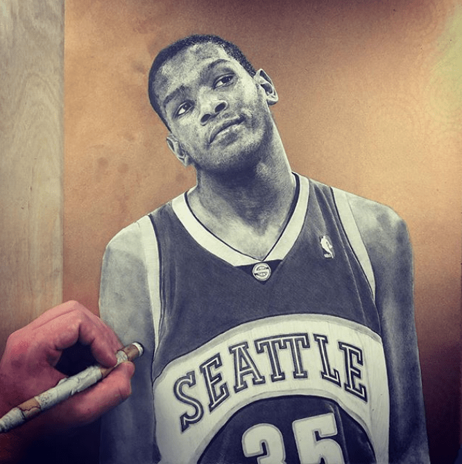 The pencil depicts basketball player Kevin Durant during his rookie season with the Seattle Sonics. In the artwork, Durant is seen looking off to his left with a slight smile and curious expression on his face. His facial features and the details of his Sonics jersey are rendered with meticulous precision, highlighting Keegan’s exceptional talent as a realistic artist.