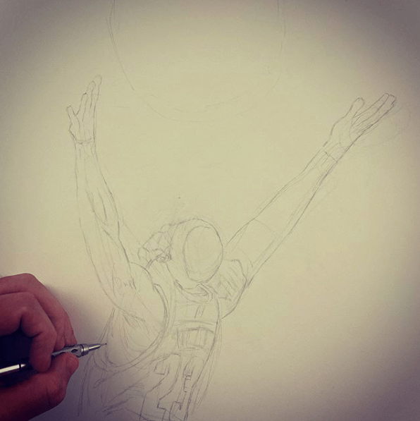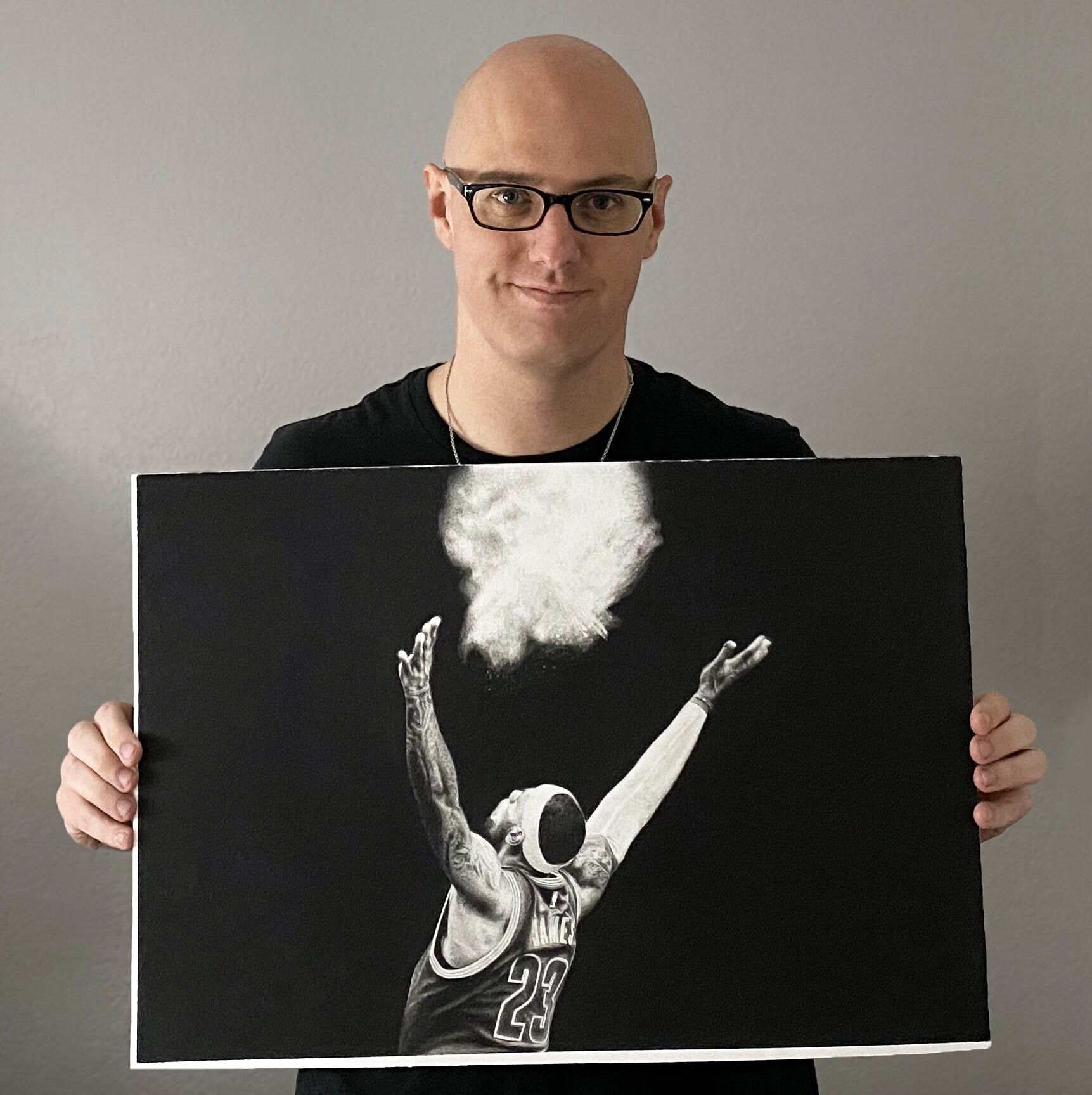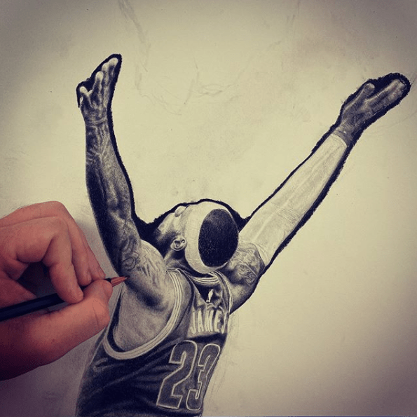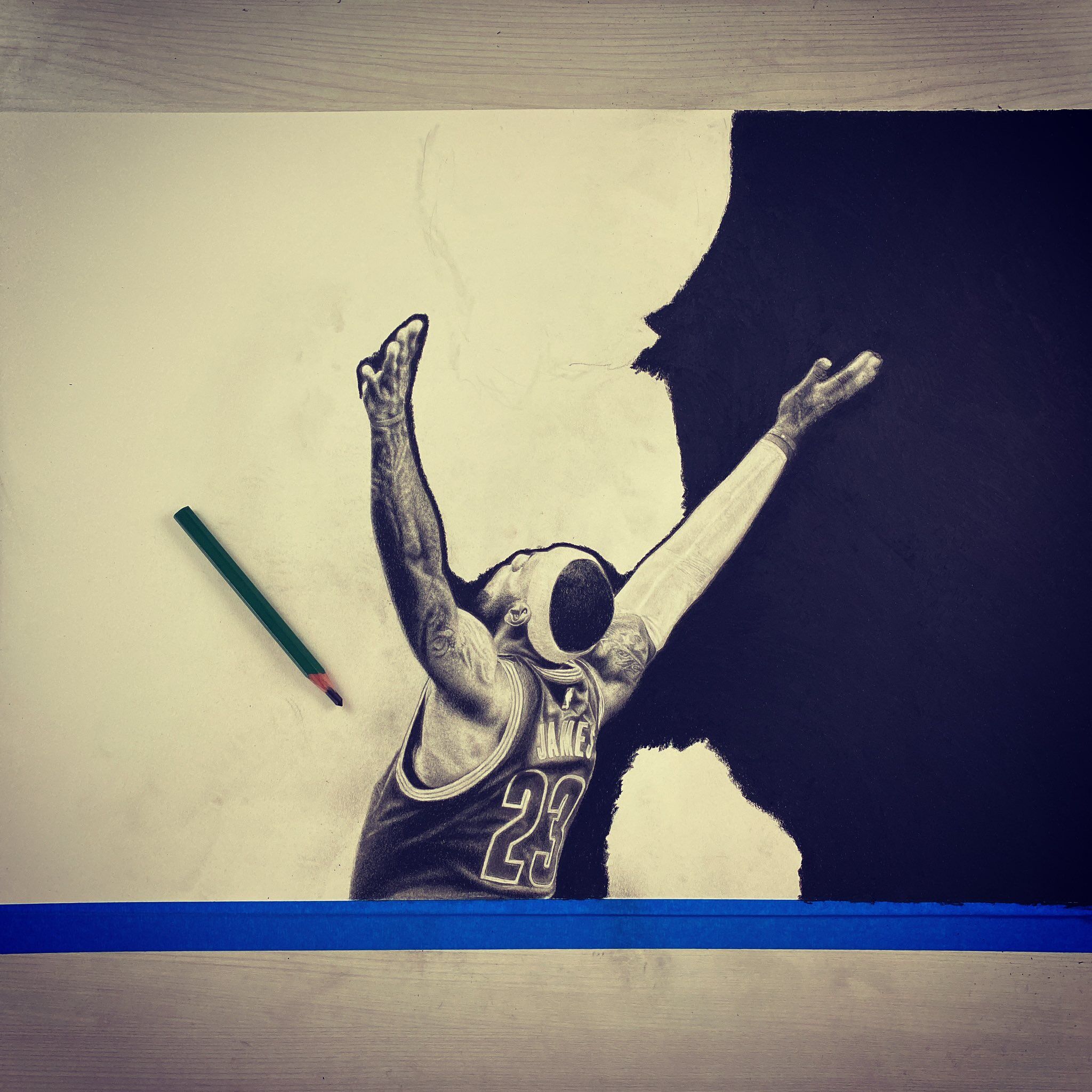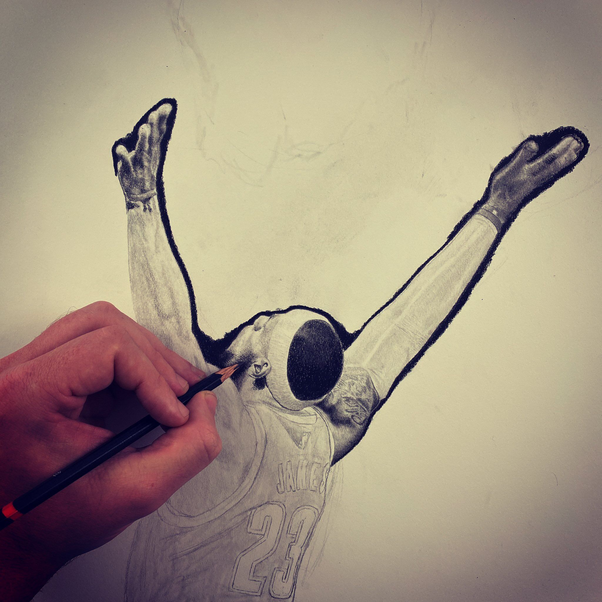 James is shown wearing his signature white headband and his jersey number 23, with his arms stretched out wide. The background of the drawing is a solid black, which put a greater emphasis on James and his powerful presence on the court. This drawing is a testament to Keegan’s skill as an artist, capturing the energy and intensity of one of the greatest basketball players of all time.