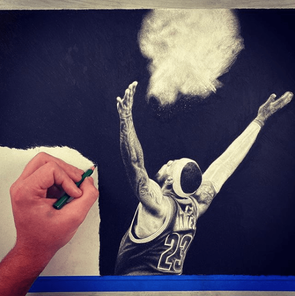 The drawing depicts a stunningly realistic portrayal of basketball legend LeBron James. The image portrays the iconic moment just before a game, where James is shown standing on the court with his back turned slightly to the viewer, ready to perform his pre-game ritual. James is captured in action, holding baby powder in his hands, and with a flick of his wrist, he releases it into the air, creating a huge cloud of white powder. The pencil work is detailed and precise, capturing the texture and movement of the powder as it swirls through the air.