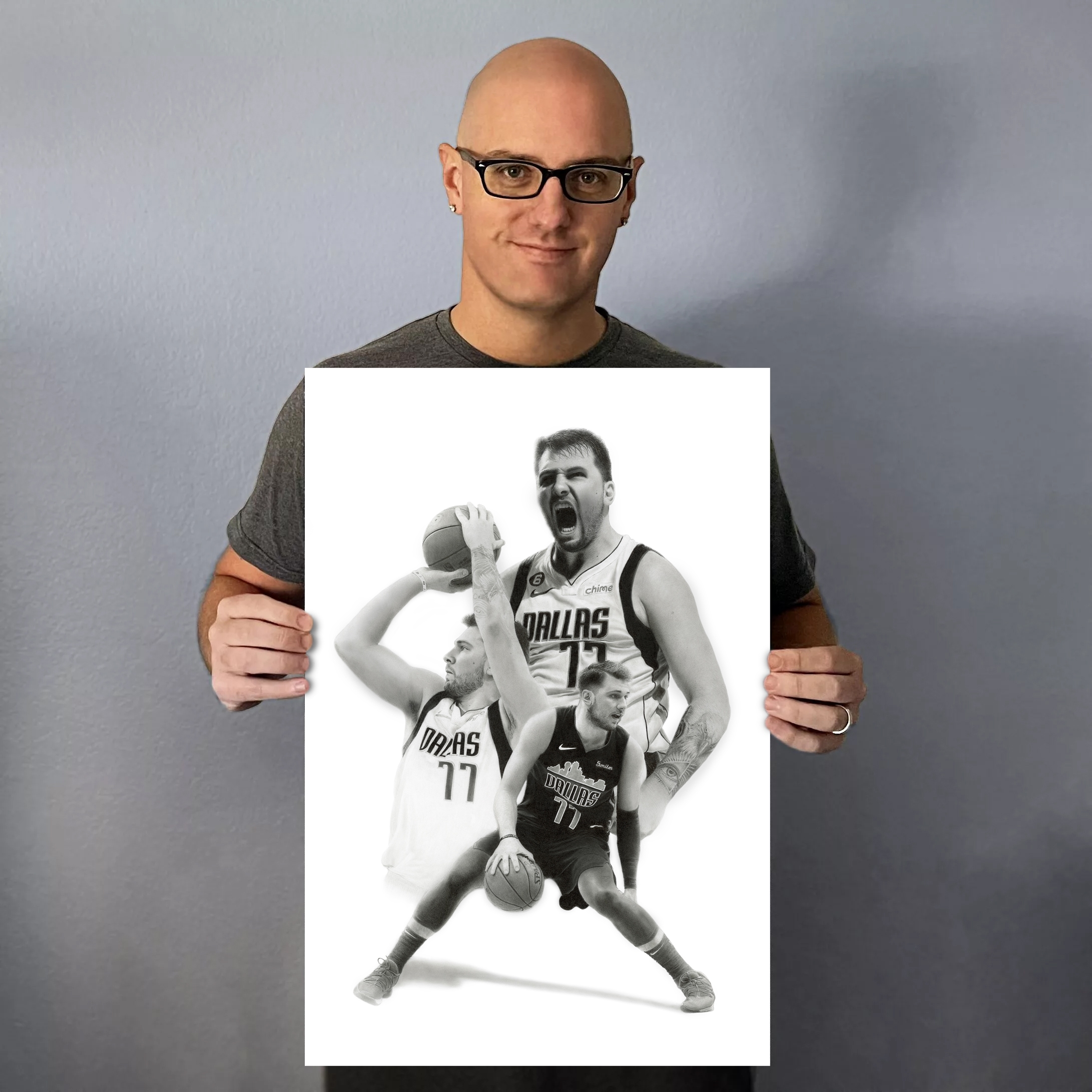 In the third and largest pose, Doncic is shown screaming with the intense passion he’s known for. The lines of his body are dramatic, conveying a sense of tension and drama. The details of his uniform, including the Mavericks logo on his jersey are rendered with incredible precision.