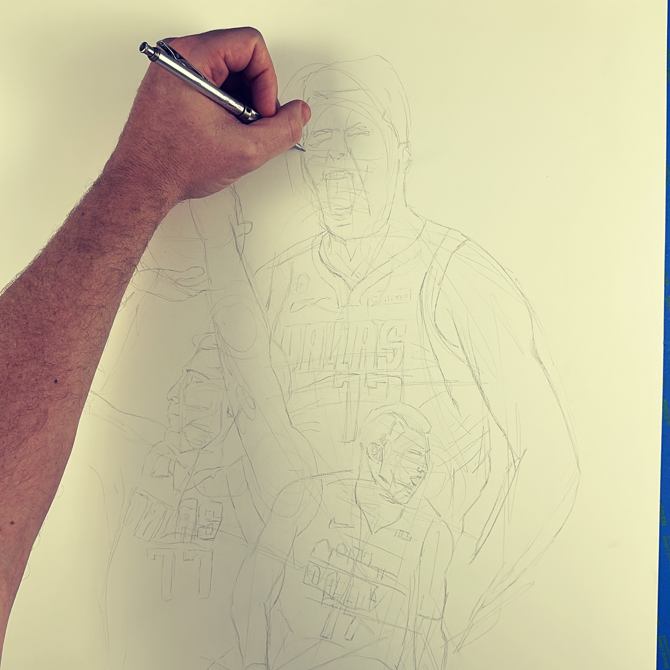 In the first pose at the bottom of the paper, Doncic is shown dribbling the ball with between his legs, his eyes focused intently on the opponent in front of him. The lines of his body are fluid and dynamic, conveying a sense of motion and energy. The shading is expertly done, creating a sense of depth and dimensionality that makes Doncic seem almost three-dimensional.
