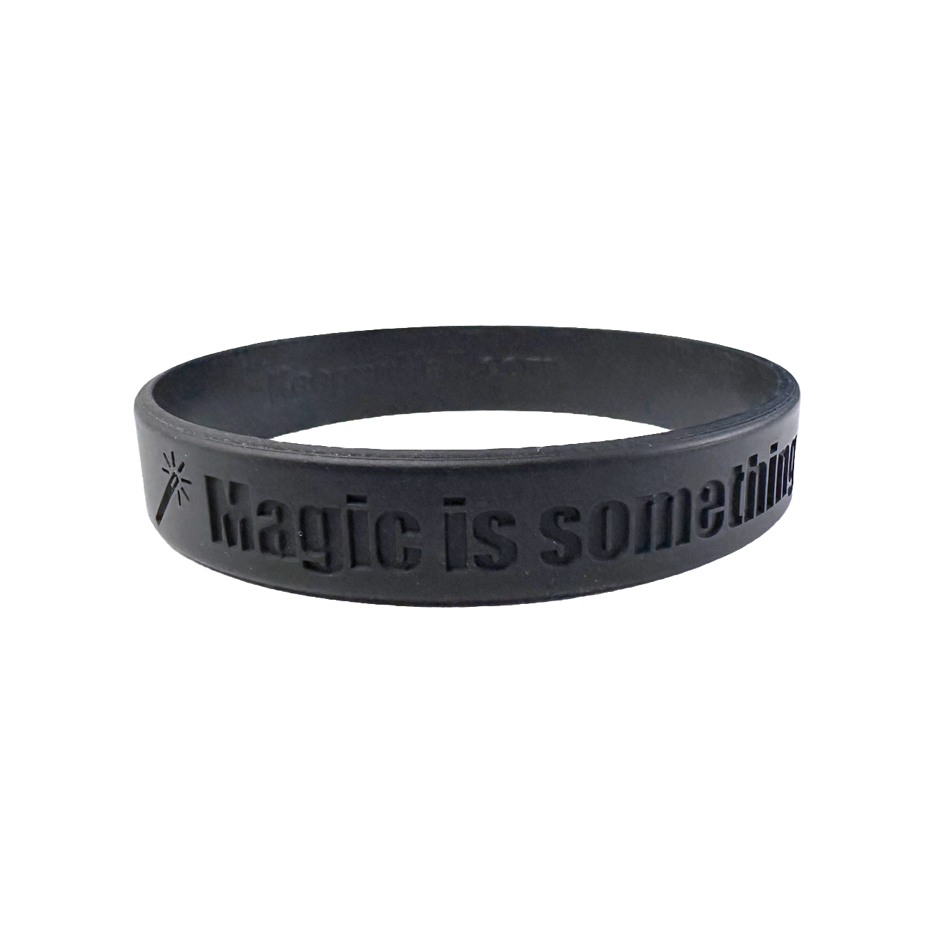 Black on black .5″ rubber wristband with “Magic is something you make” and “Keegan” signature embossed into the outside of the band along with a magic wand. “KeeganHall.com” embossed into the inside of the band.