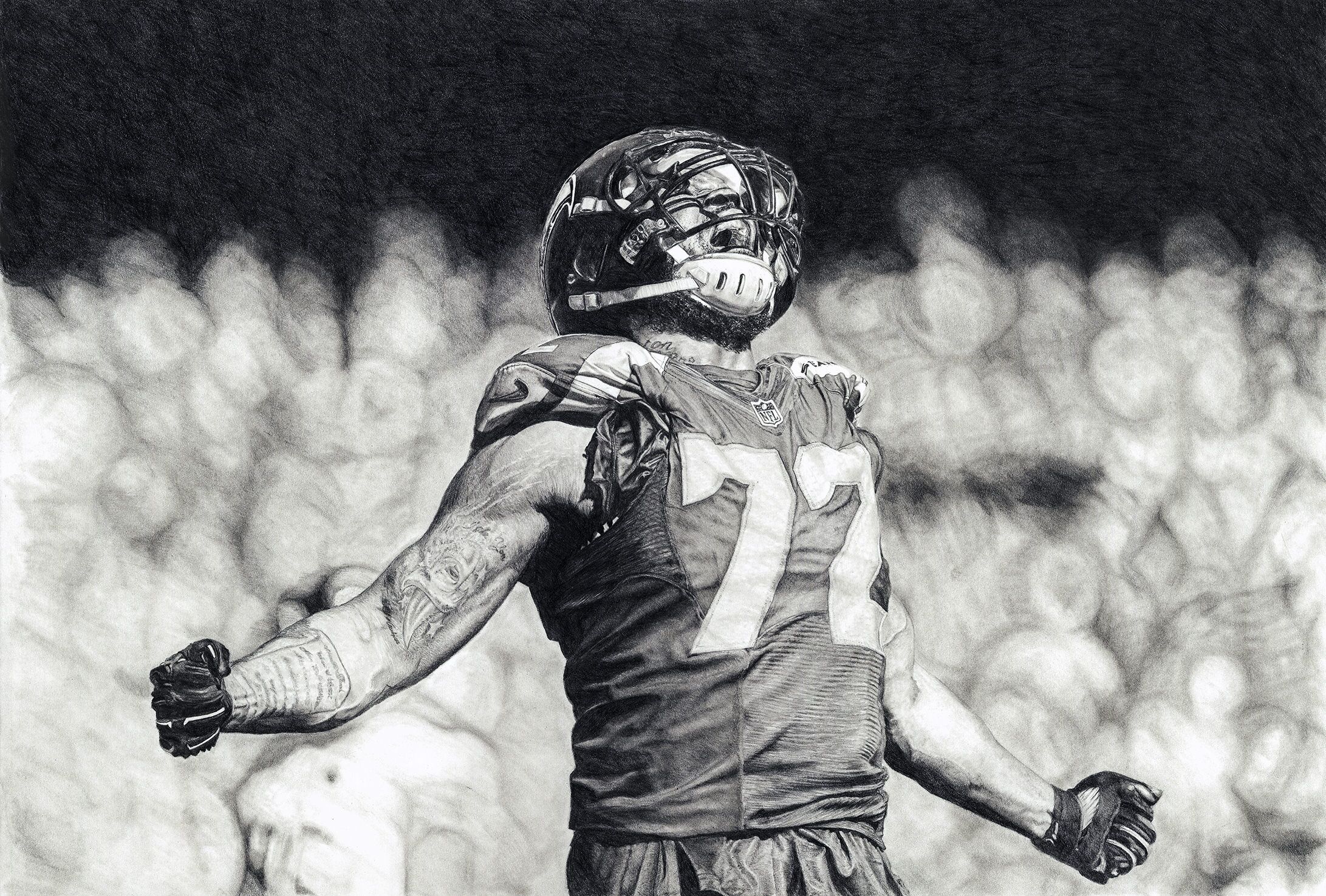 Overall, the drawing is a powerful tribute to Michael Bennett’s athleticism and passion for football. It captures the raw emotion of a moment of triumph and showcases the artist’s talent in capturing the human form with pencil and paper.