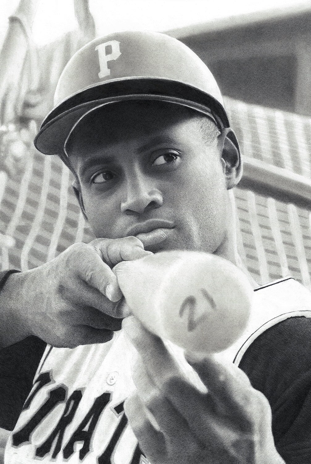 The stunning pencil drawing portrays the legendary baseball player, Roberto Clemente, in a timeless pose. Clemente is captured in a moment of focus, as he gazes out to his left with a serious expression on his face. He holds his baseball as if he’s aiming a weapon, pointing it towards the viewer in a way that brings the end of the bat close to the viewer’s perspective.
