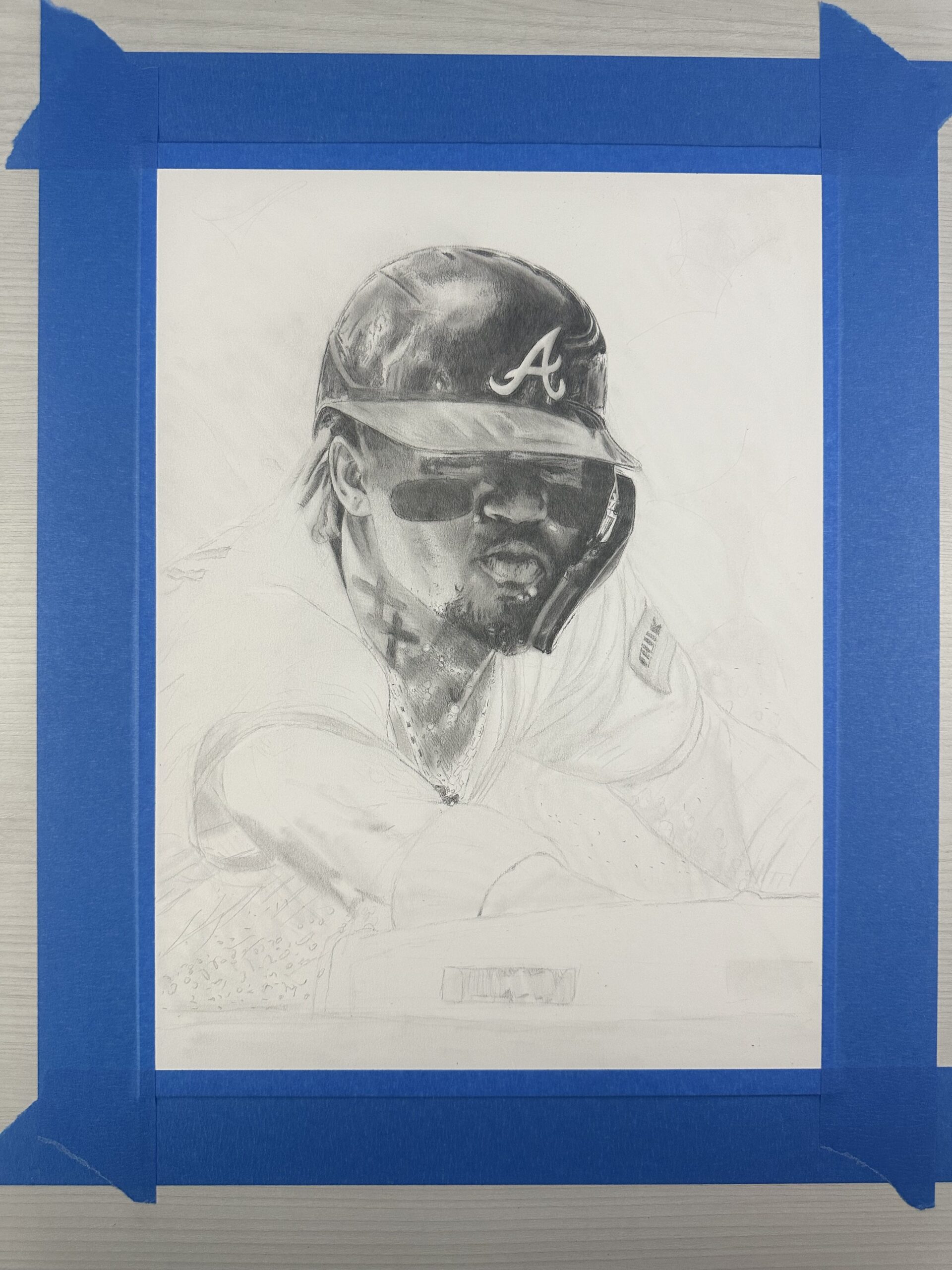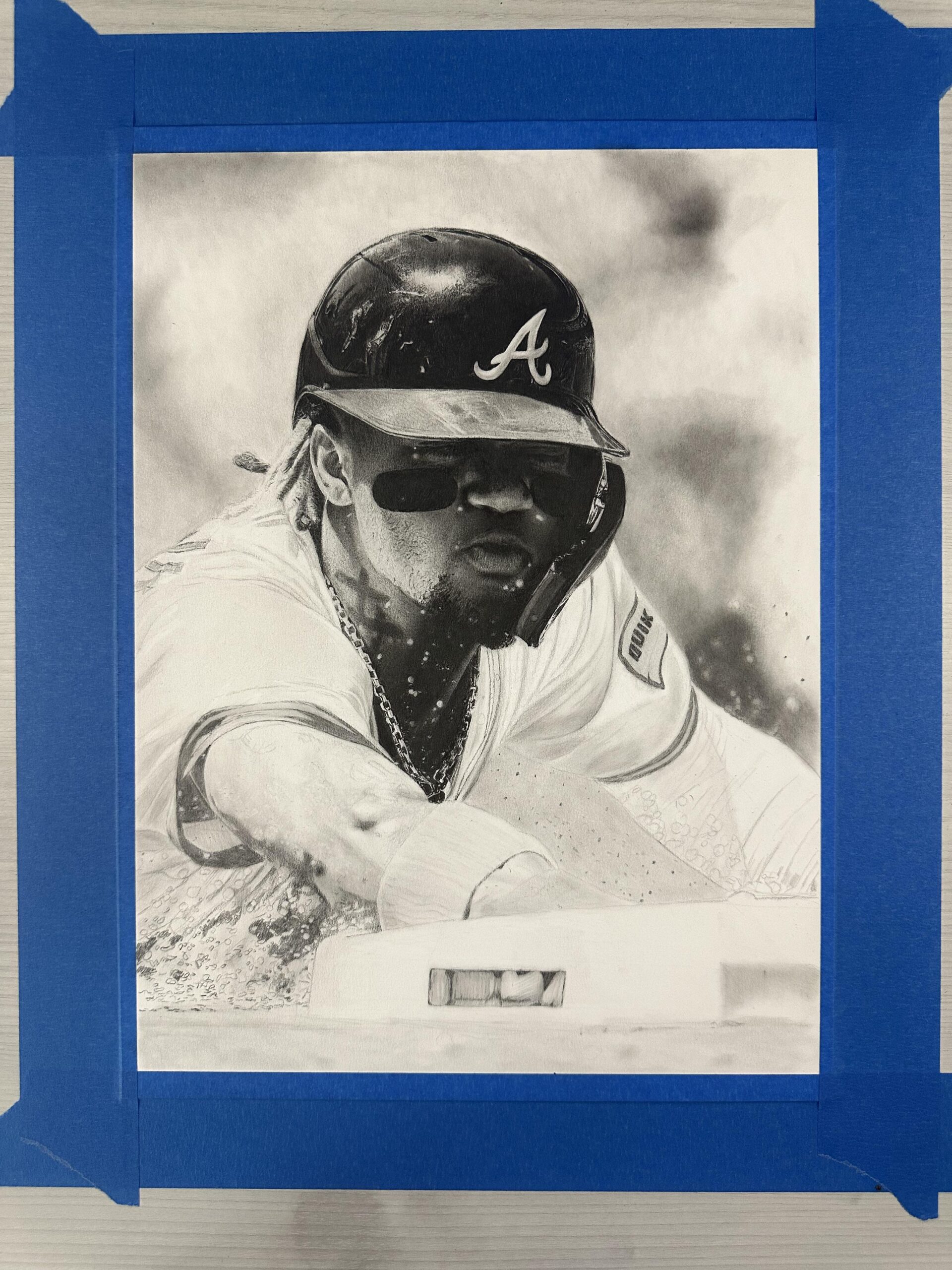 This graphite drawing captures Ronald Acuña Jr., the electrifying superstar of the Atlanta Braves, in the heart of the action – mid–stolen base, dirt flying, eyes closed as he slides into the base. It’s a split second of chaos and control, frozen forever in striking detail.