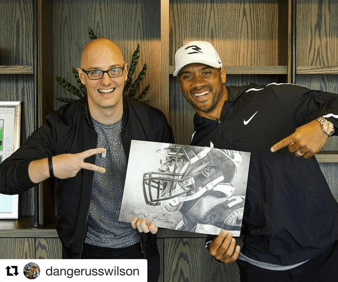 In this realistic pencil drawing, the focus is on the intense expression of Seattle Seahawks quarterback Russell Wilson.