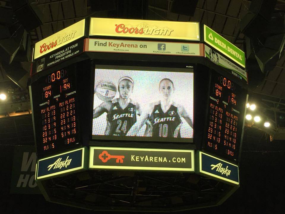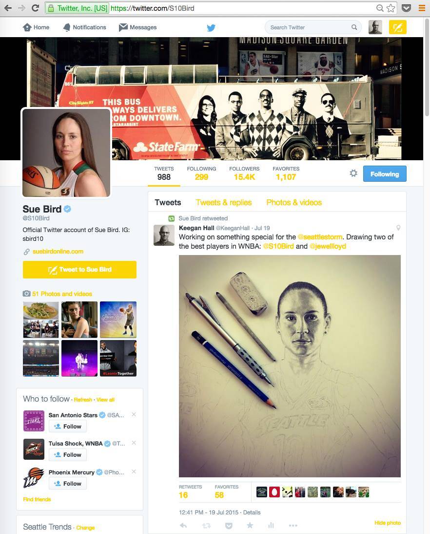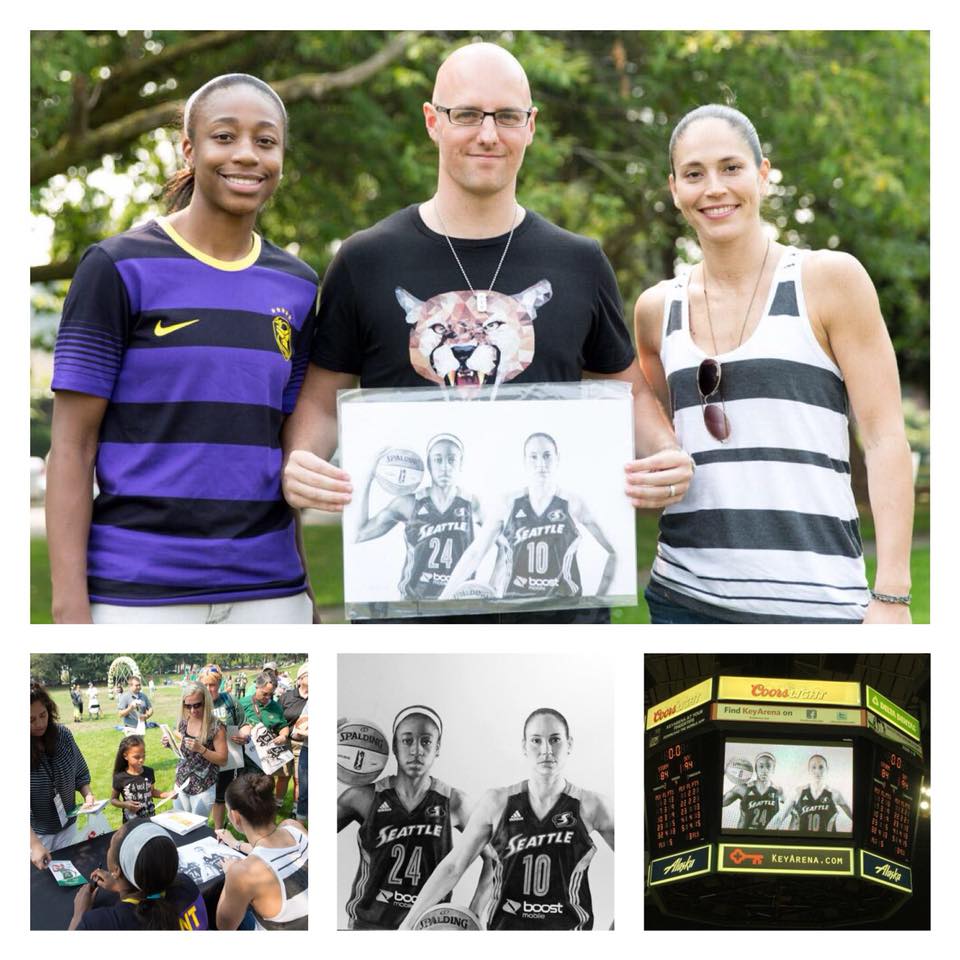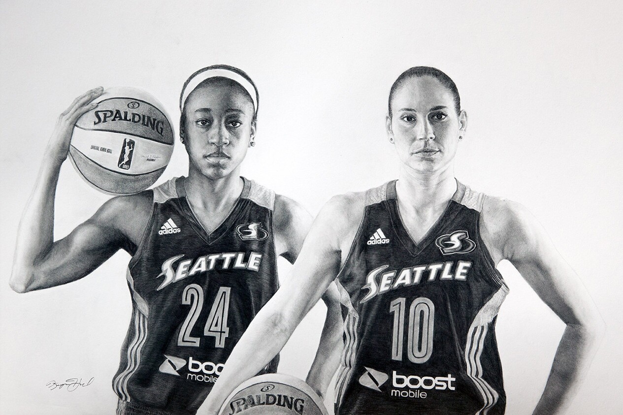 The pencil drawing depicts two WNBA players from the Seattle Storm team, Sue Bird and Jewell Loyd, in a close-up view. The players’ expressions are intense as they stare directly at the viewer. Sue Bird holds a basketball on her right side, while Jewell Loyd holds a basketball on her right shoulder.