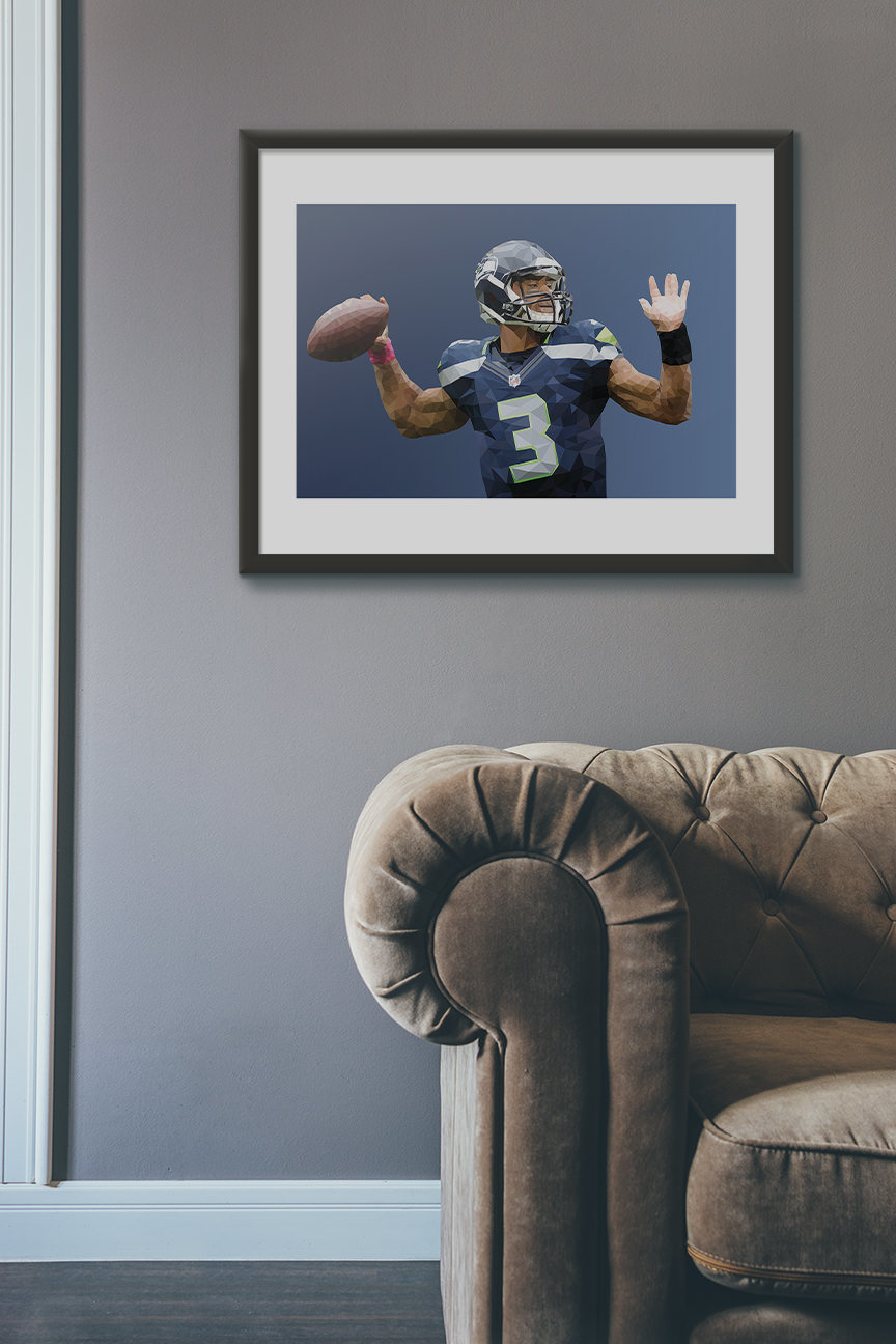 The triangles are arranged in a way that gives the portrait a three-dimensional effect, with the darker shades creating shadows and the lighter shades creating highlights. The facial features of Russell Wilson are very detailed and the overall effect of the artwork is striking and visually appealing.