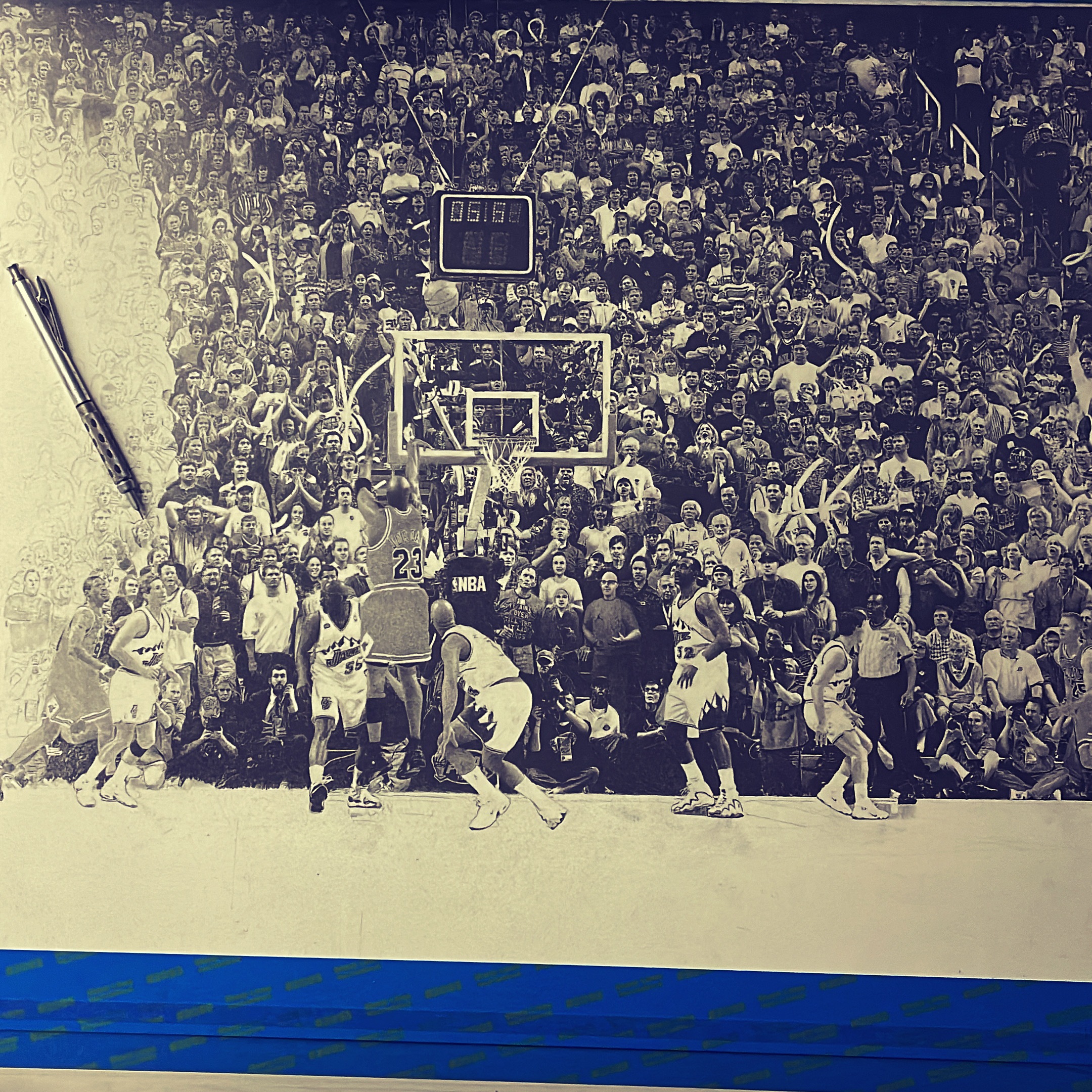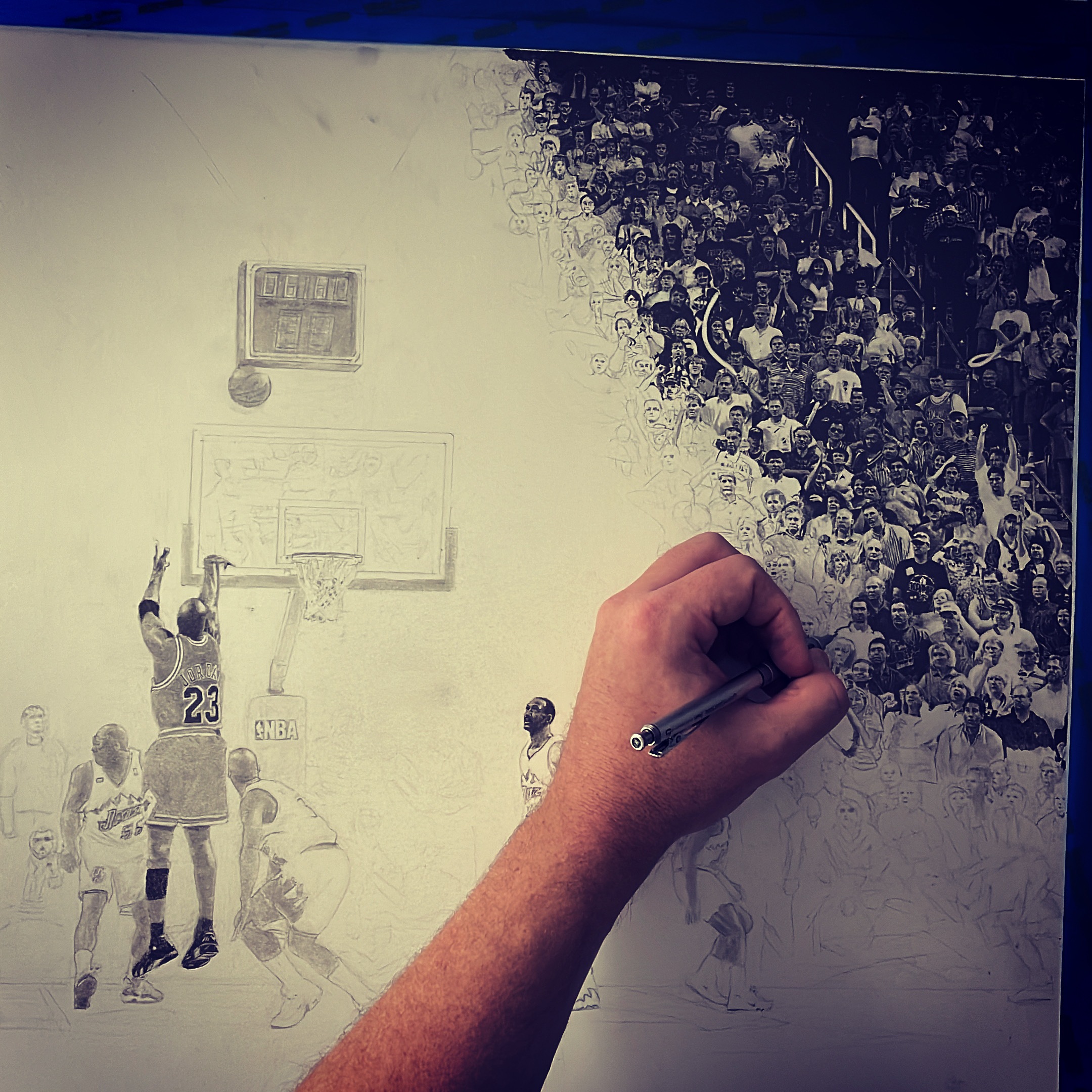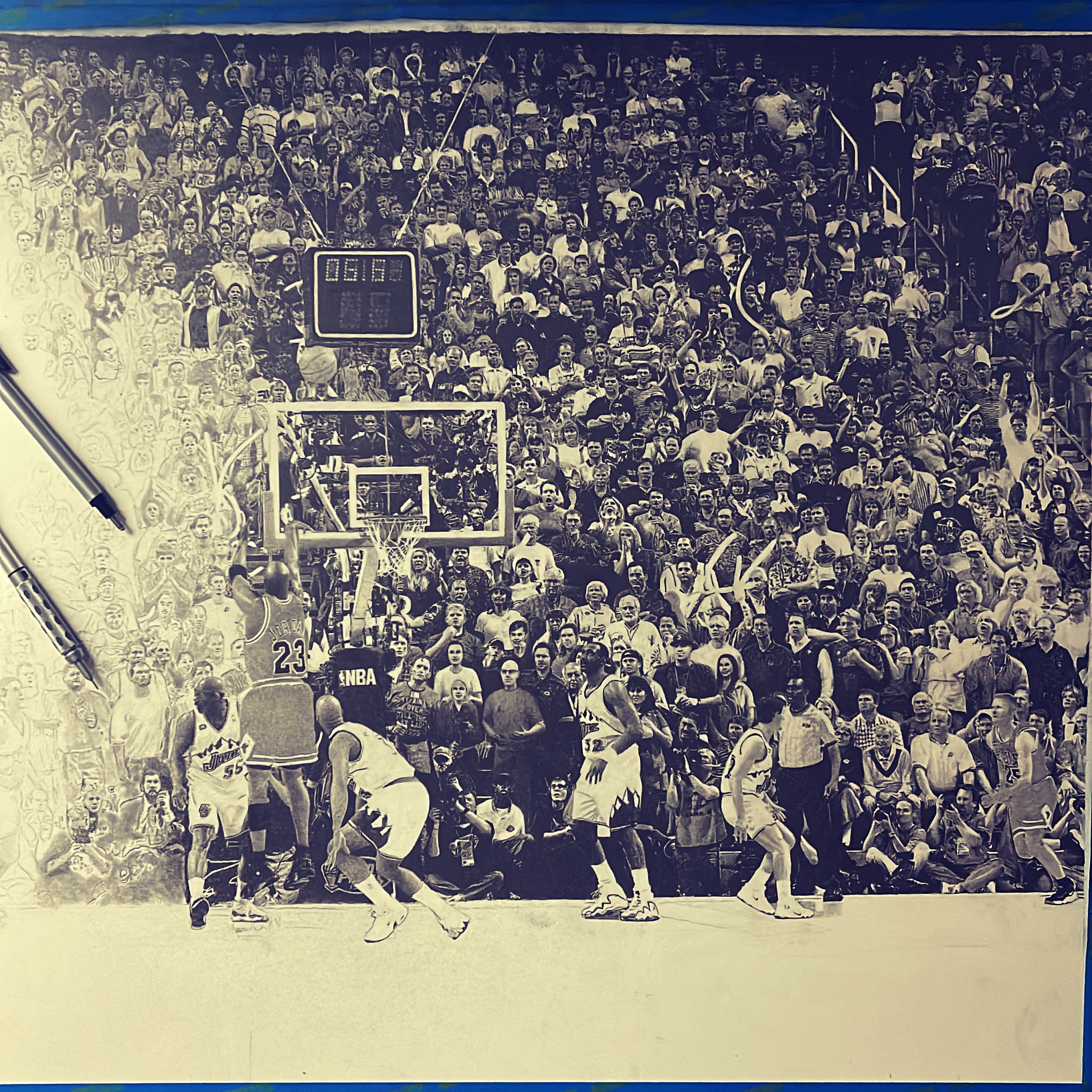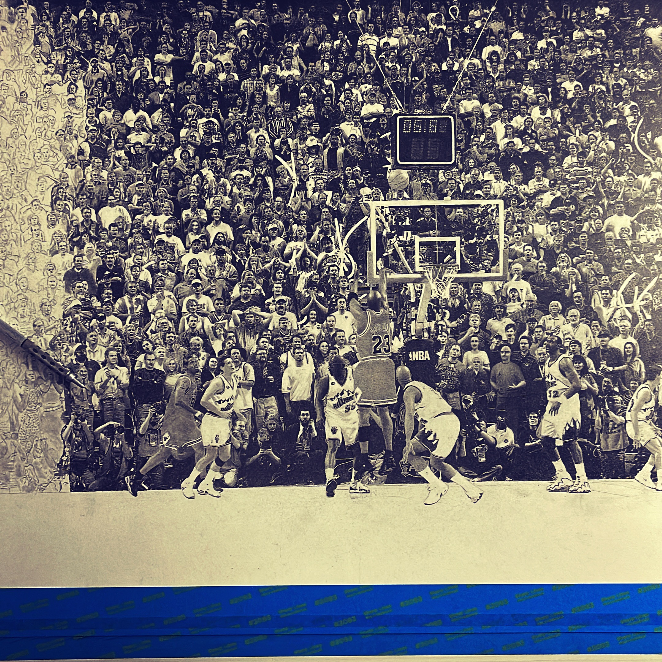 This piece is the result of an astonishing 500+ hours of meticulous work. Every element was drawn entirely by hand — from MJ’s timeless shooting form frozen in mid-air, to the tension in every muscle, to the raw emotion of the moment.