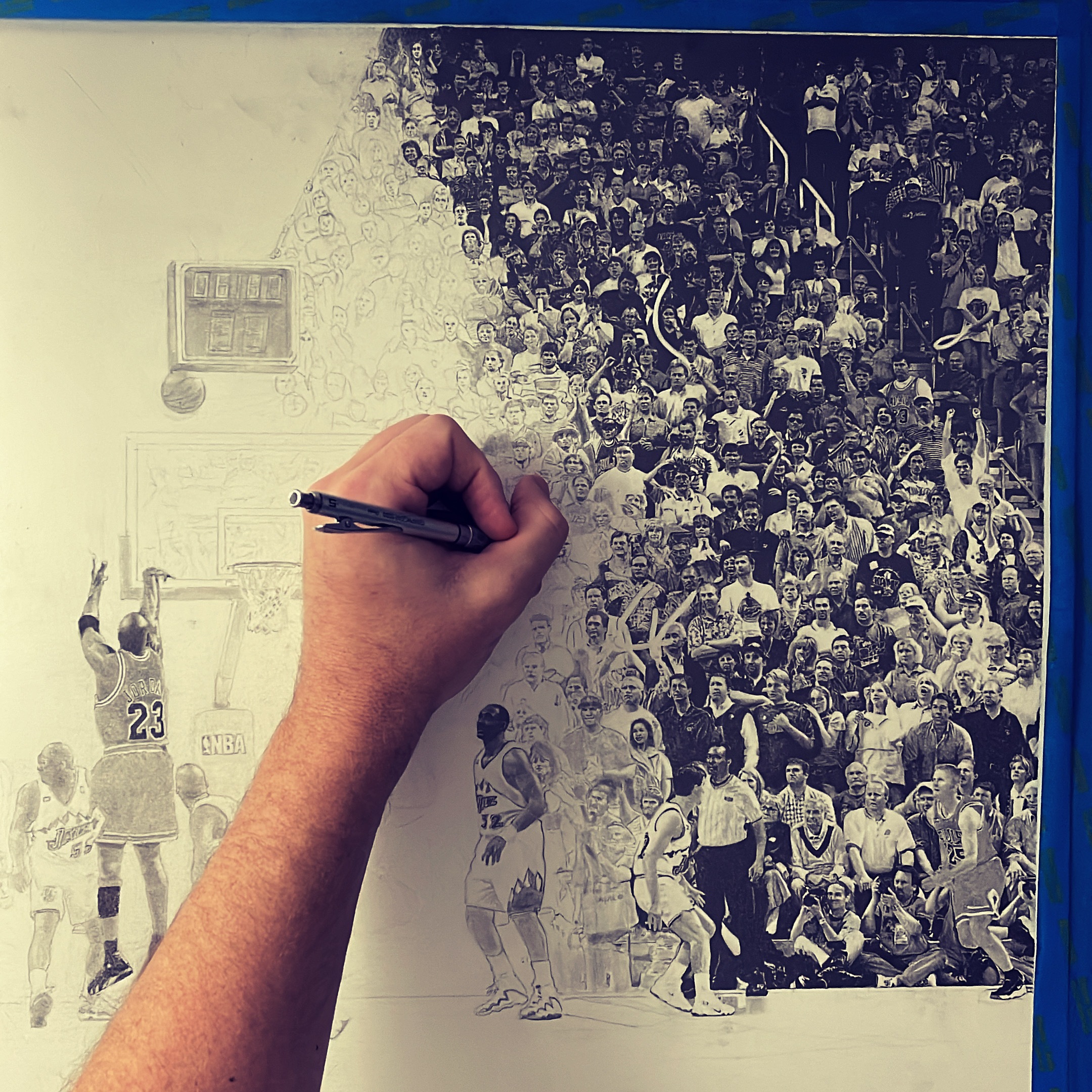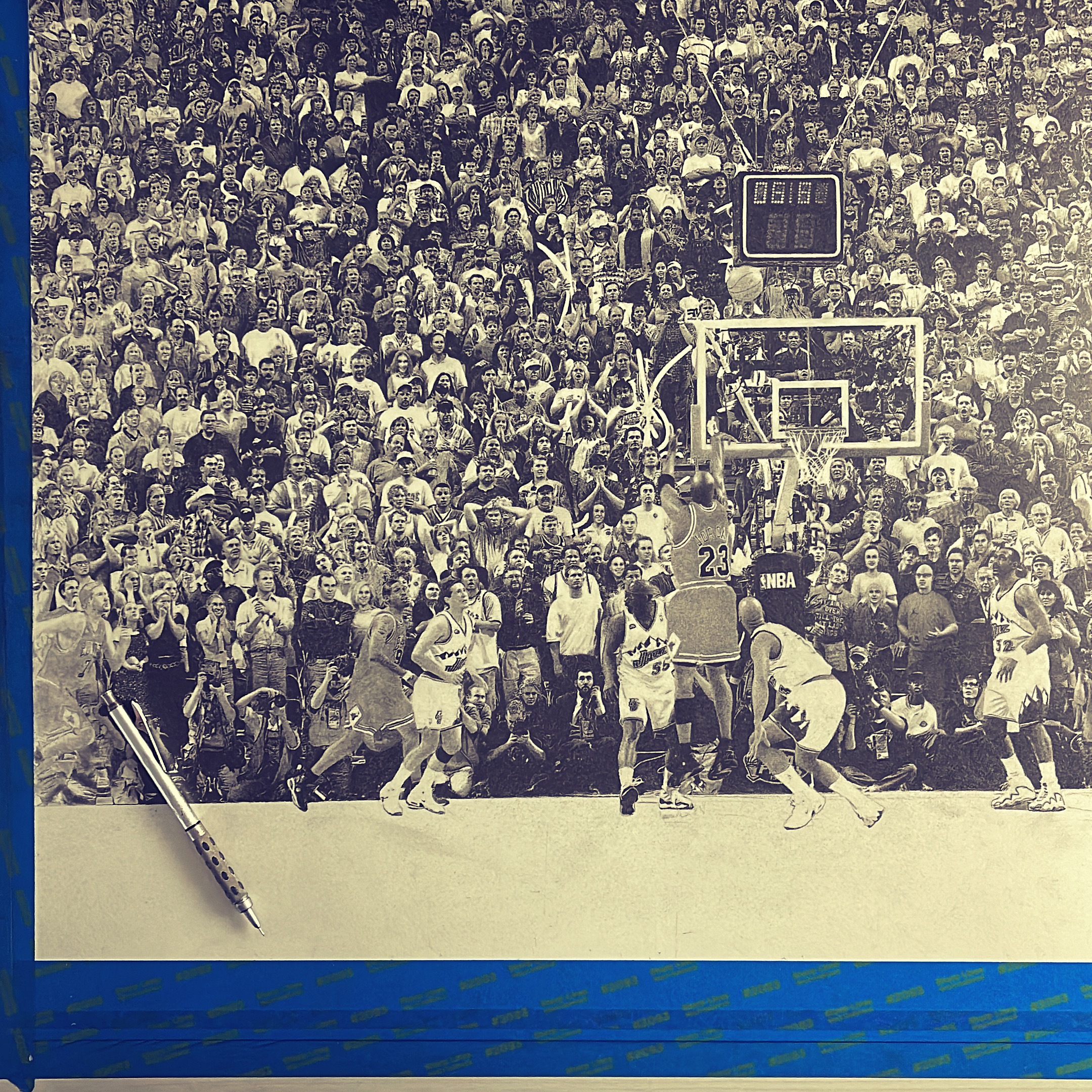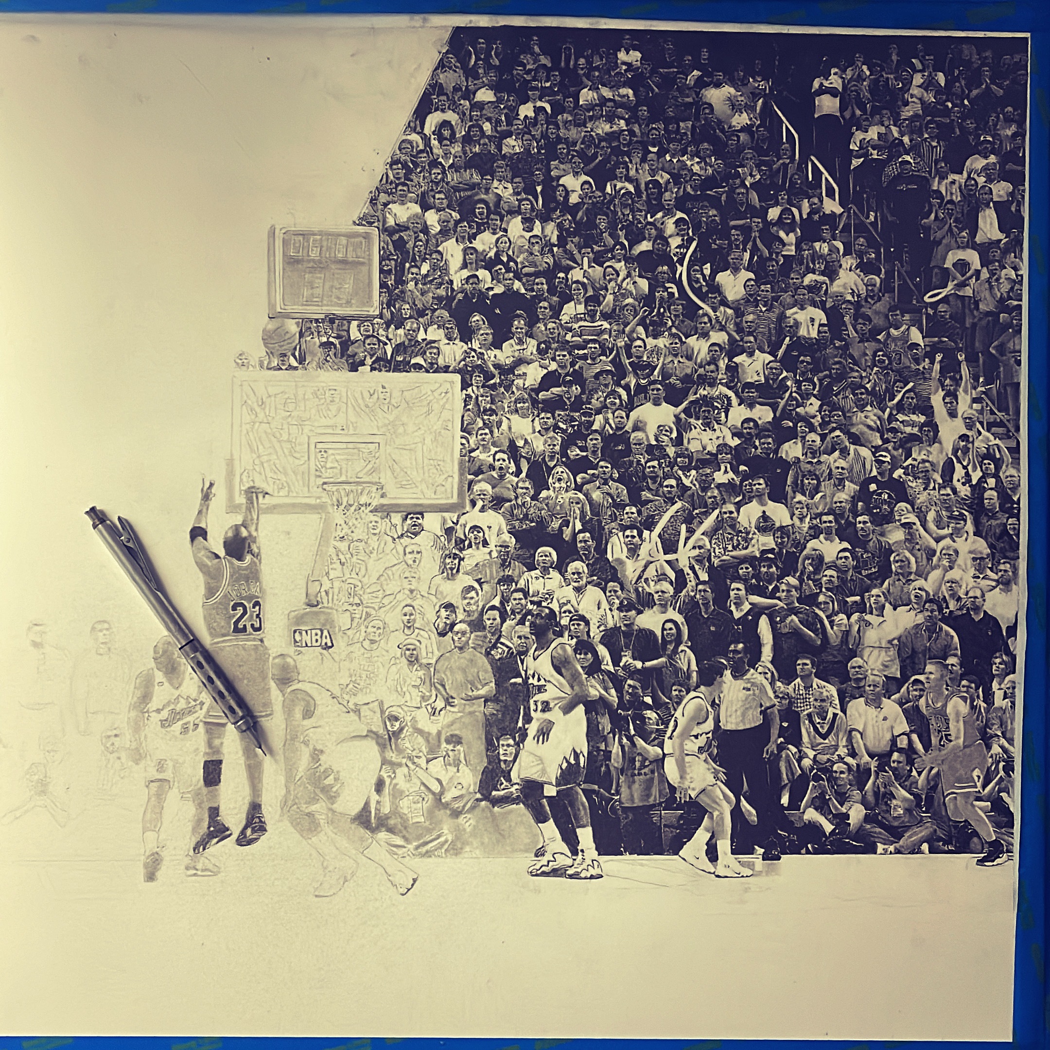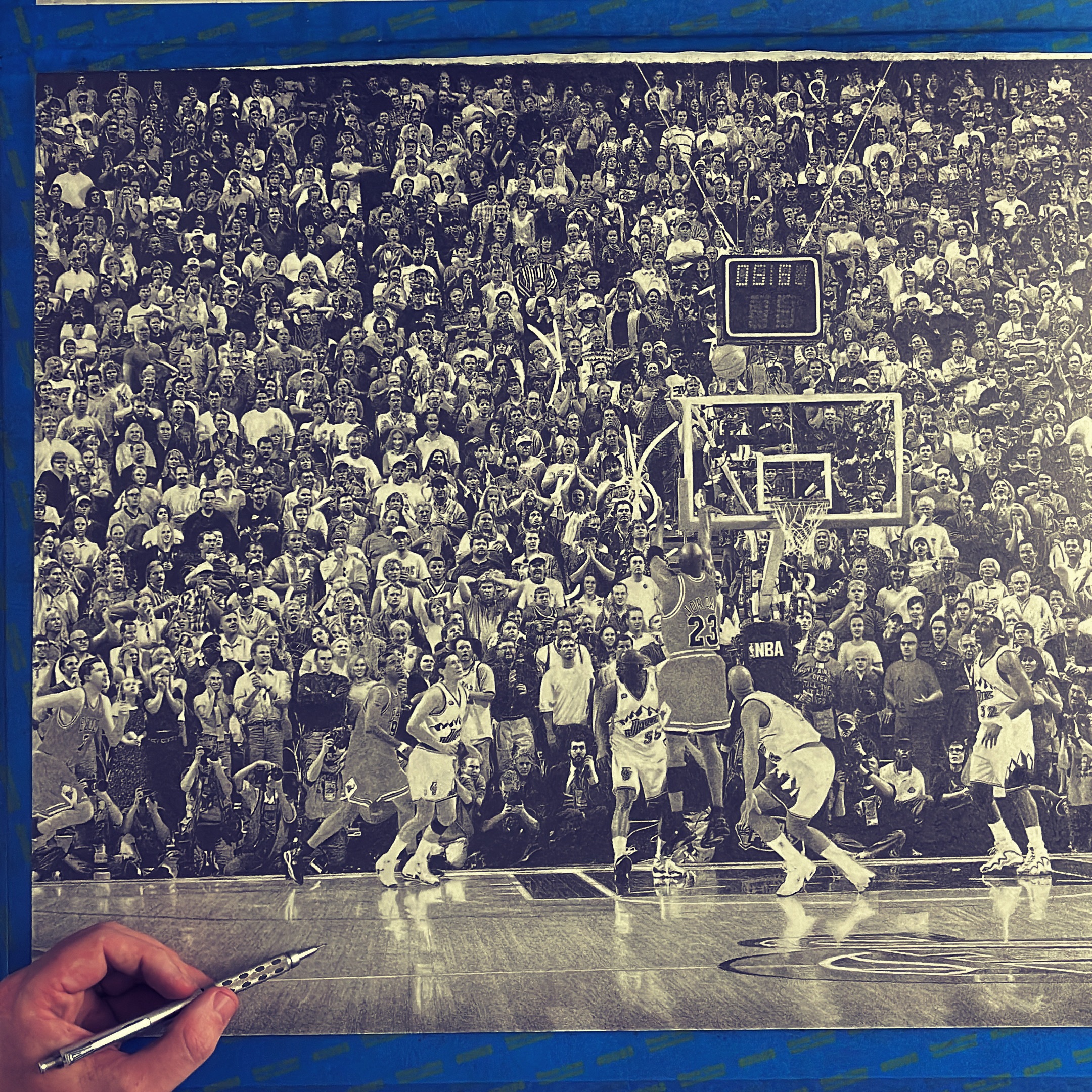 This piece is the result of an astonishing 500+ hours of meticulous work. Every element was drawn entirely by hand — from MJ’s timeless shooting form frozen in mid-air, to the tension in every muscle, to the raw emotion of the moment.
