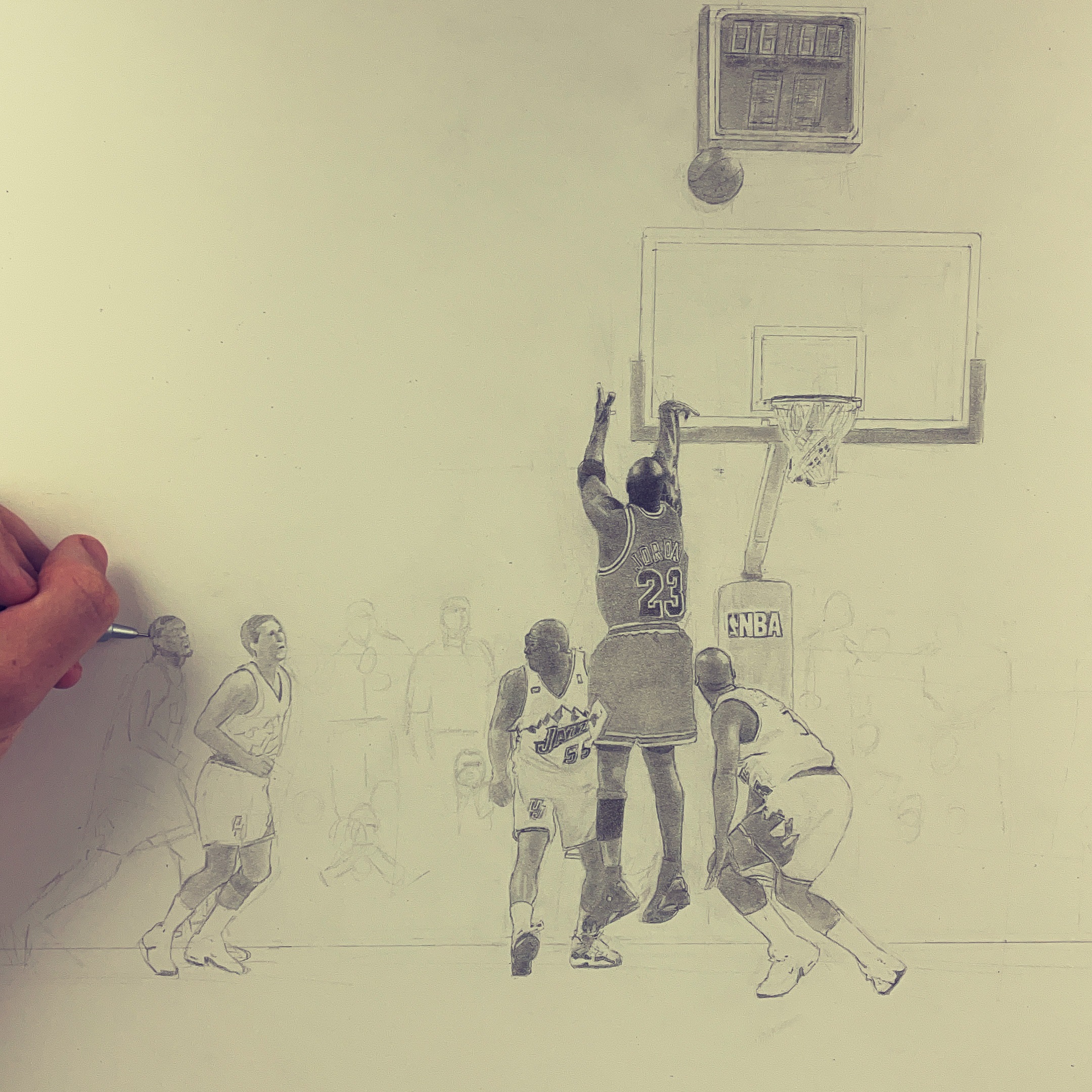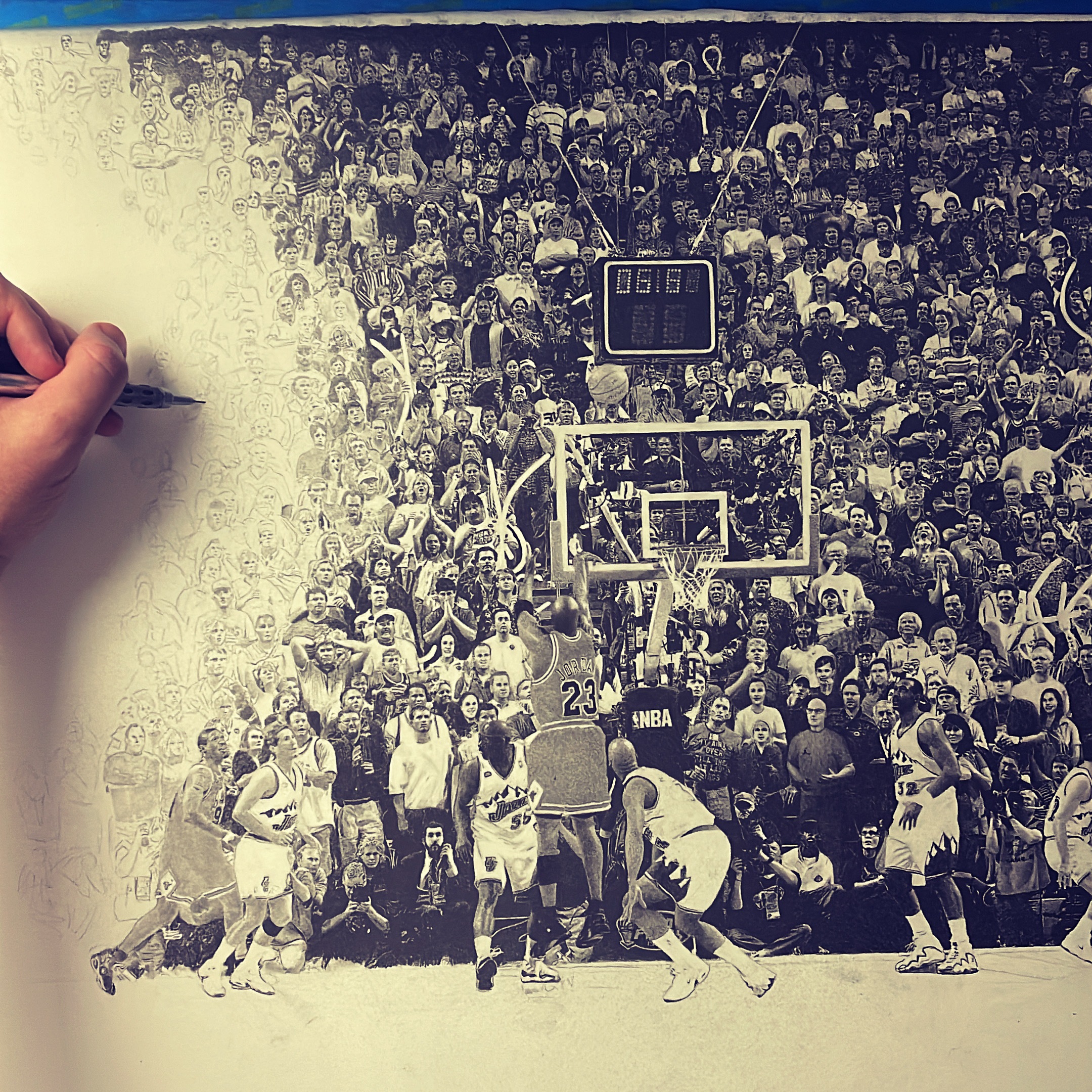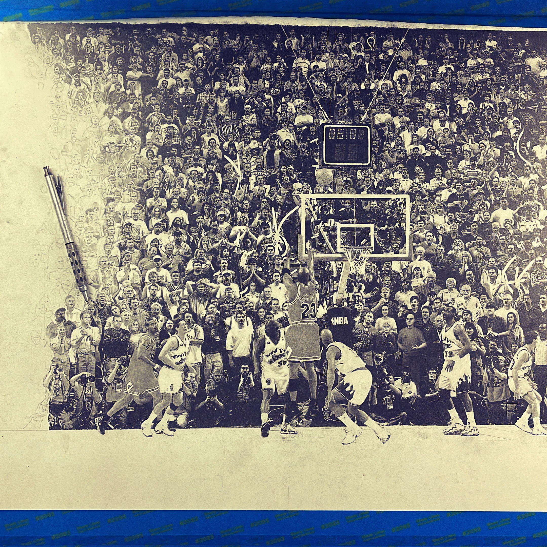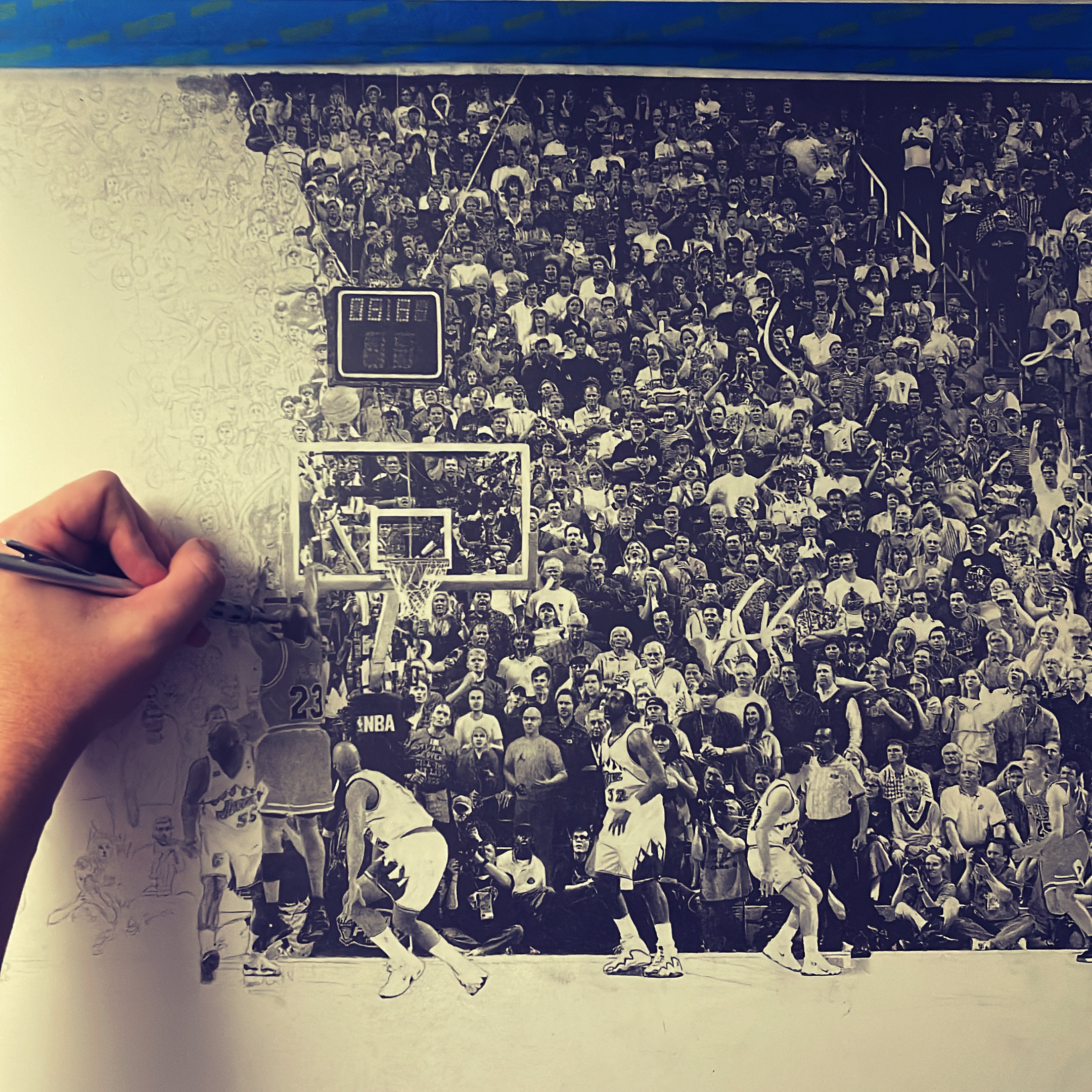 This piece is the result of an astonishing 500+ hours of meticulous work. Every element was drawn entirely by hand — from MJ’s timeless shooting form frozen in mid-air, to the tension in every muscle, to the raw emotion of the moment.