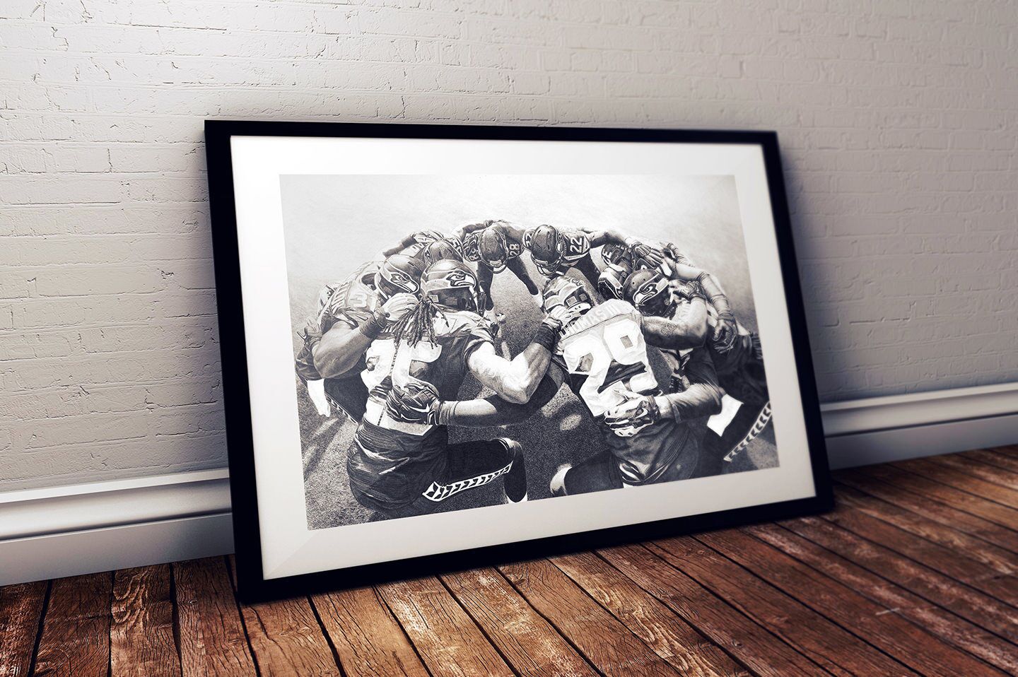 In the drawing, the players are gathered in their iconic pre-game huddle, locking arms and getting hyped up for the game ahead. The attention to detail in the drawing is impressive, capturing the texture and shading of the players’ helmets, jerseys, and even the blades of grass on the field.