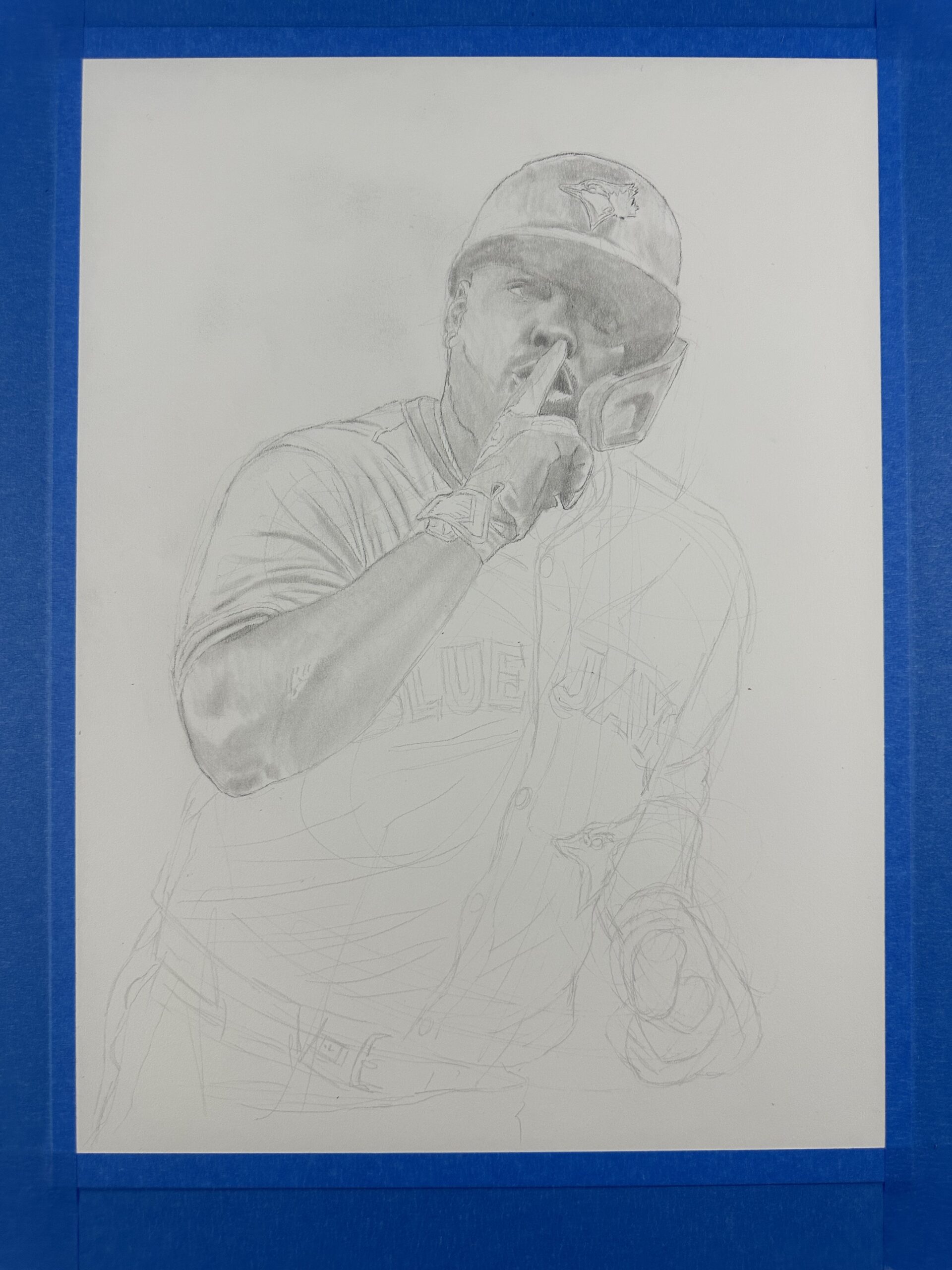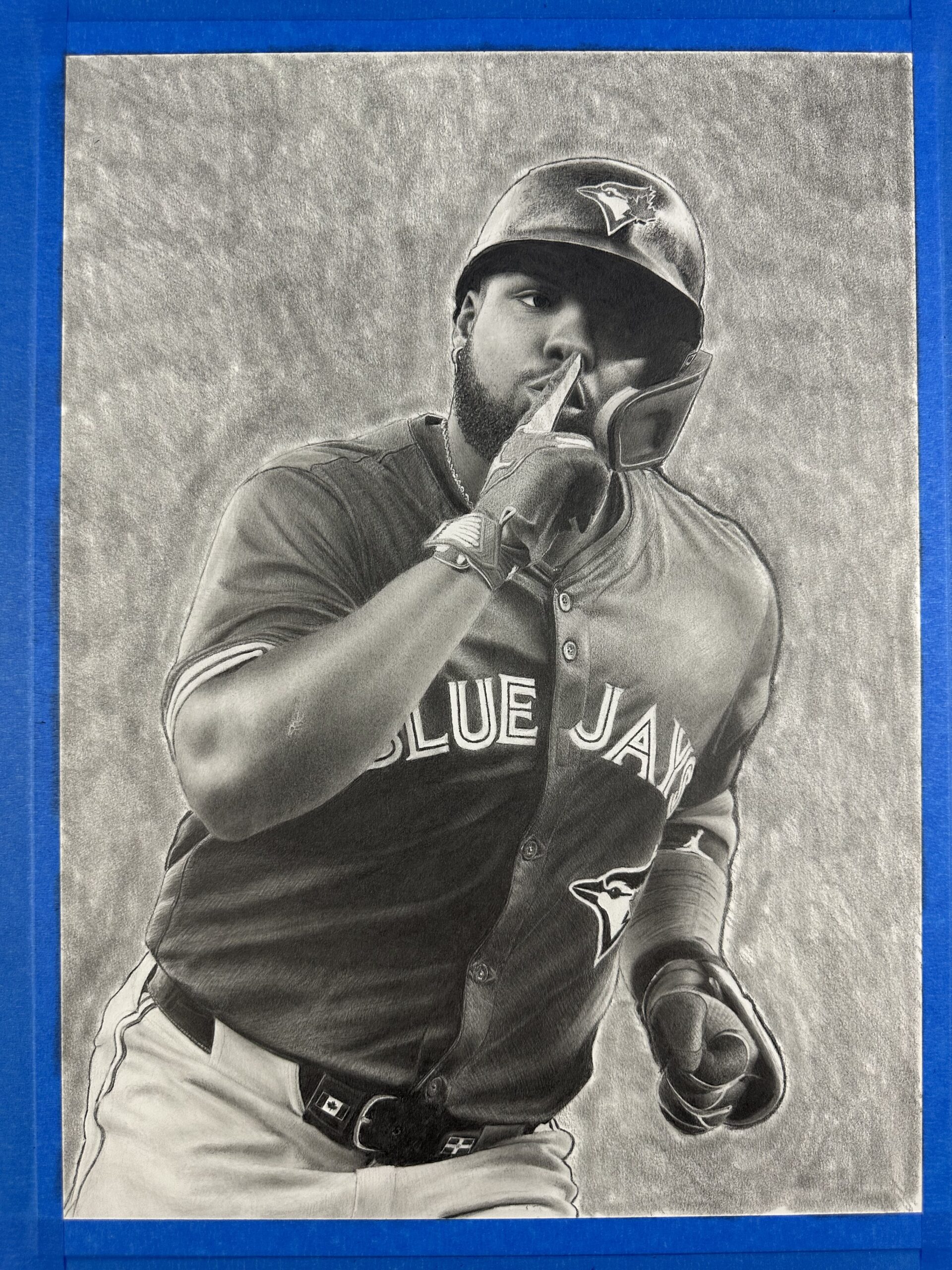This graphite drawing captures Vladimir Guerrero Jr., the heart of the Toronto Blue Jays, in one of his most iconic moments – circling the bases after crushing a home run, his finger raised to his lips in his signature “shush” pose. It’s a moment of confidence, swagger, and unshakable belief – the kind of statement only Vladdy Jr. can make.